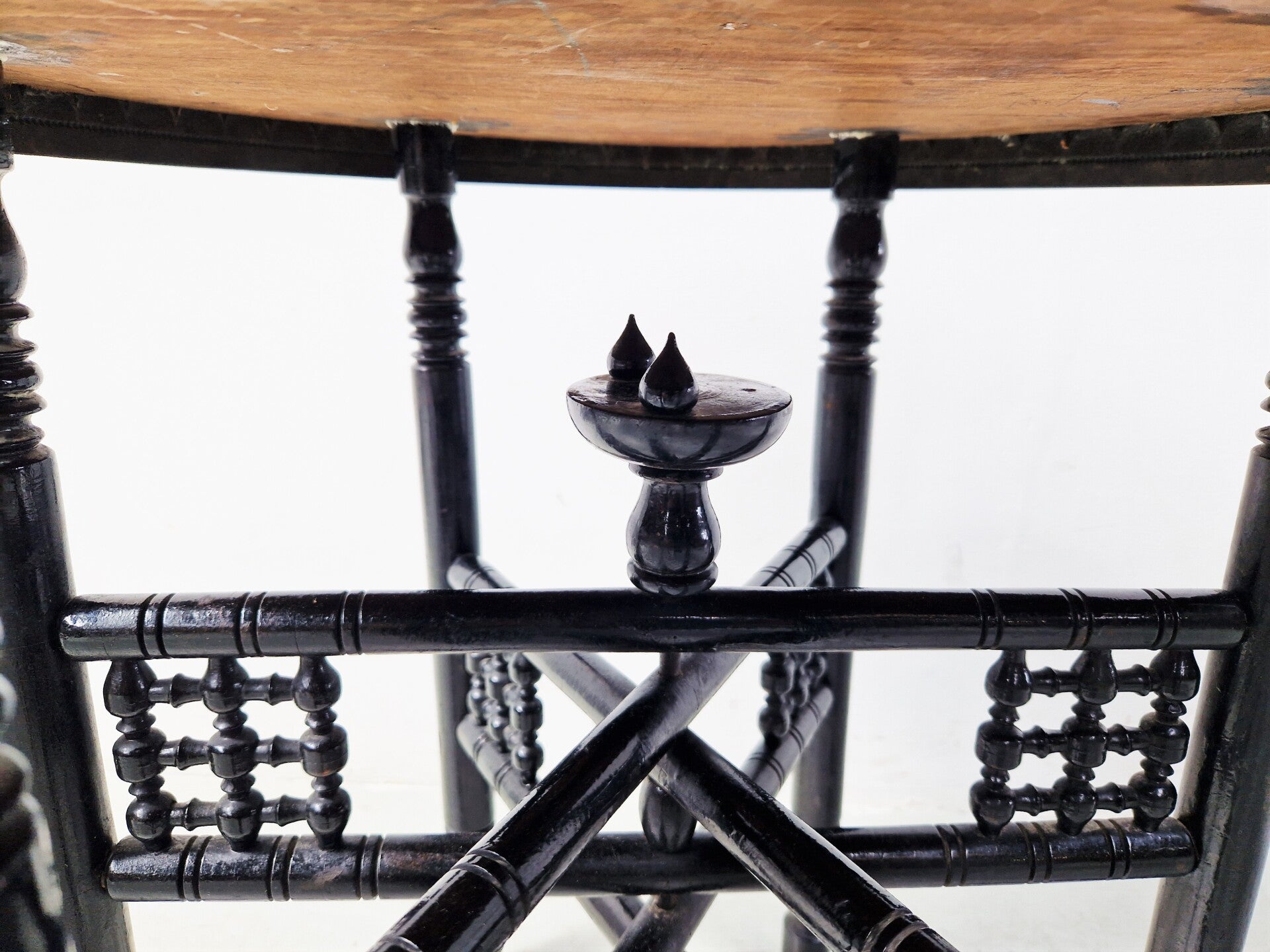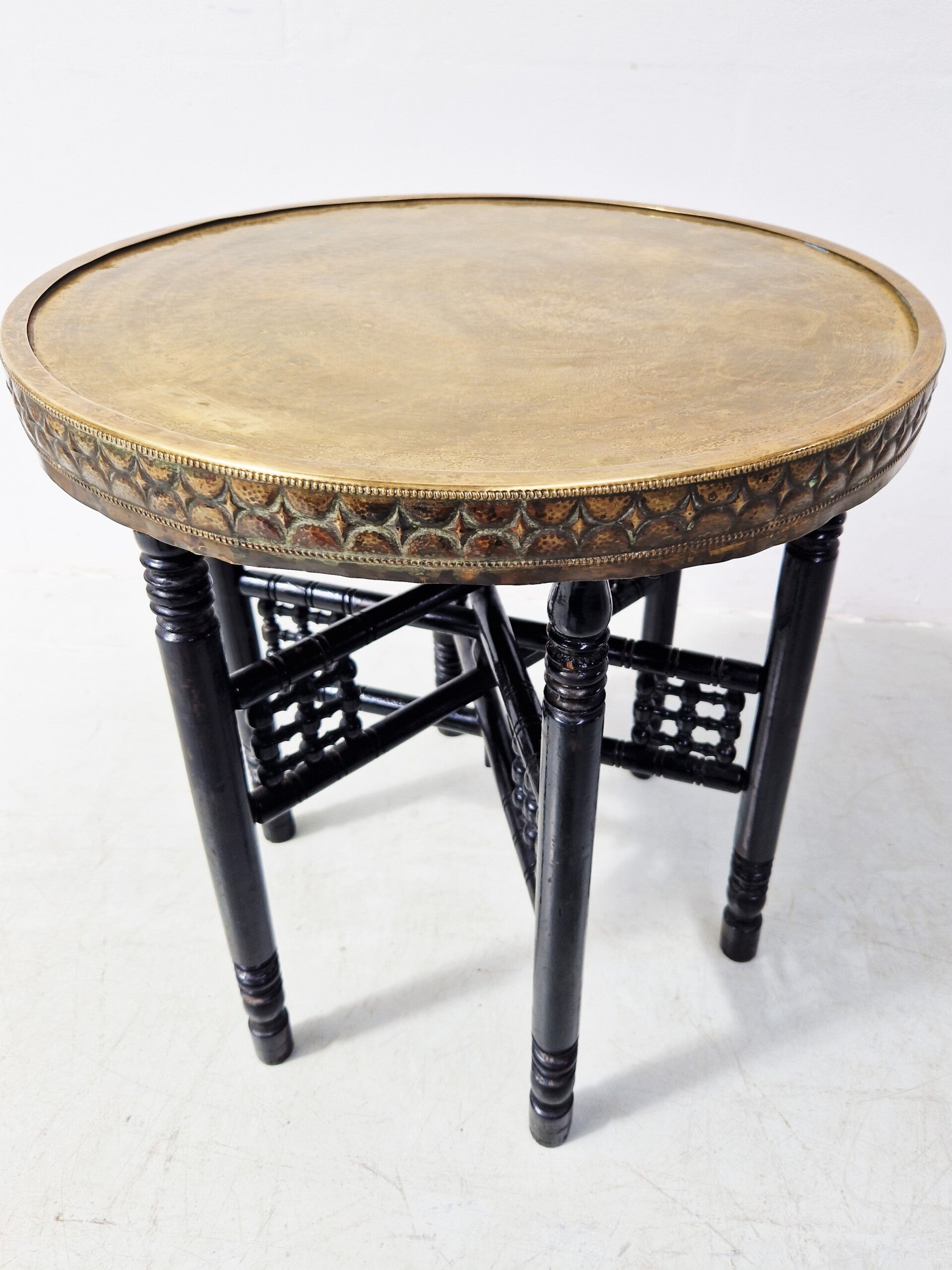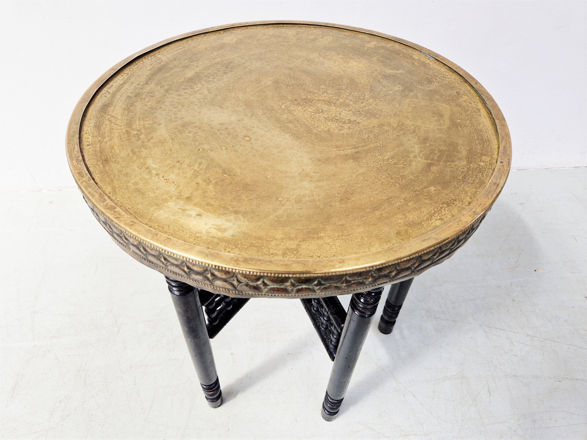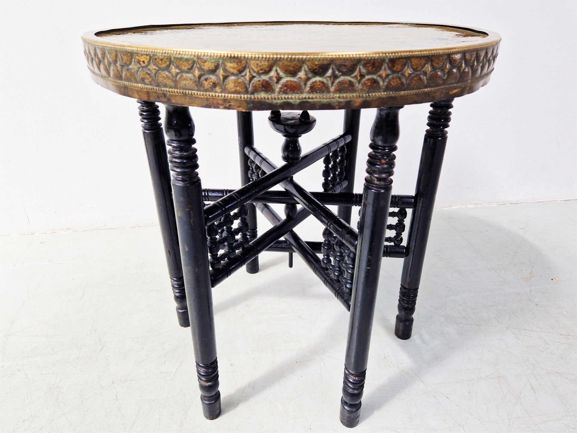 Very nice smoker's table from the Art Deco period, but with clear oriental influences. With brass top and beautifully stylized wooden base. Certainly shows some signs of age - one decorative button is missing at the bottom of the top - but is still sturdy and very decorative. Old sticker of German origin, but probably import.