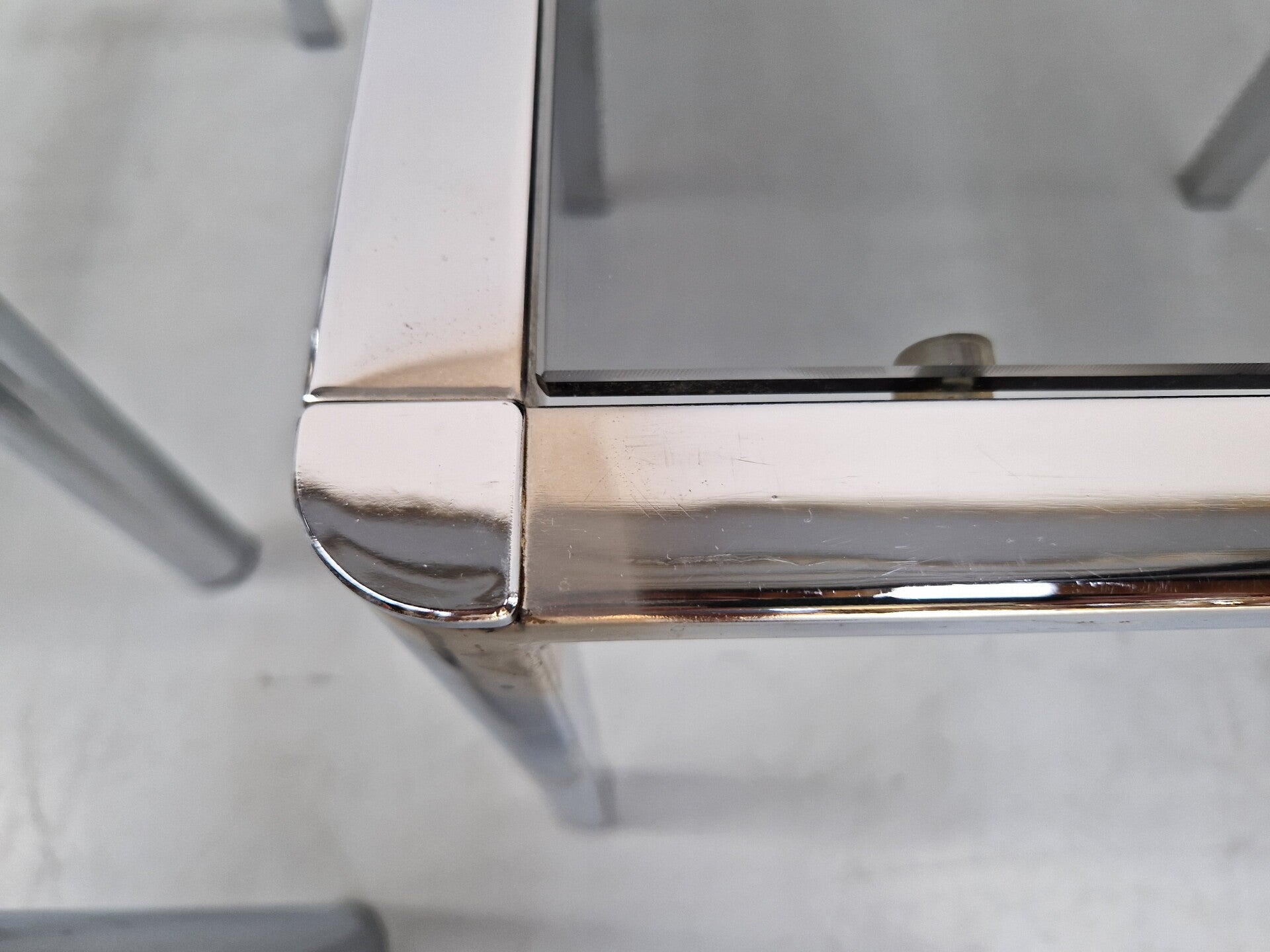 Bold vintage space age nesting set in the style of Sergio Mazza. The tables are made of thick chromed metal and have a smoked glass top. In very nice condition with only some light discolourations that match the age. Small piece of chrome missing.