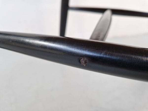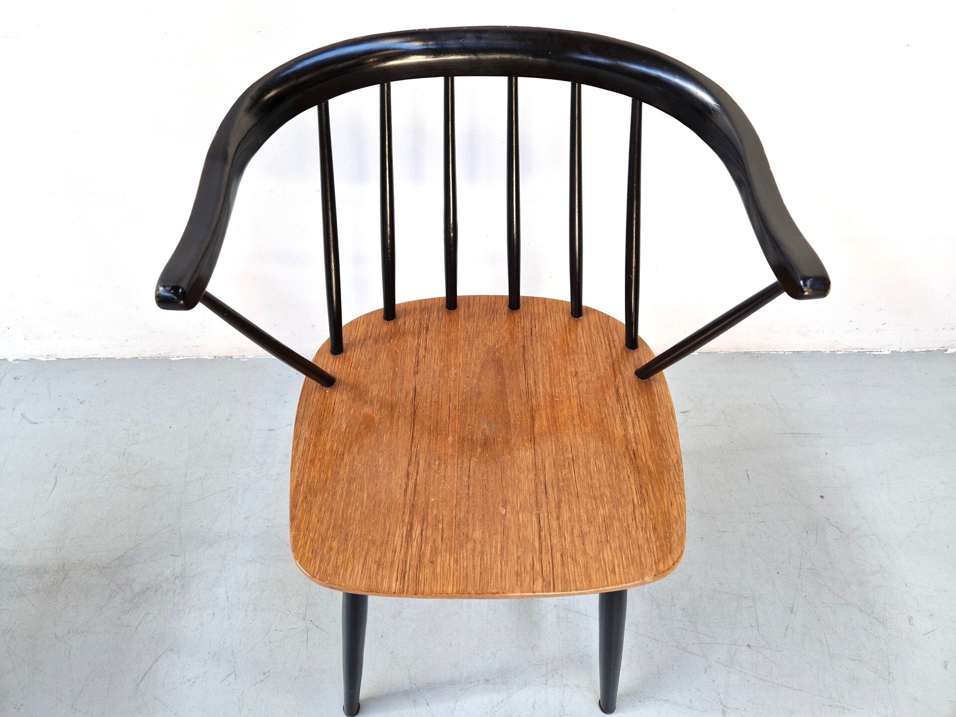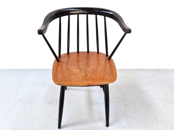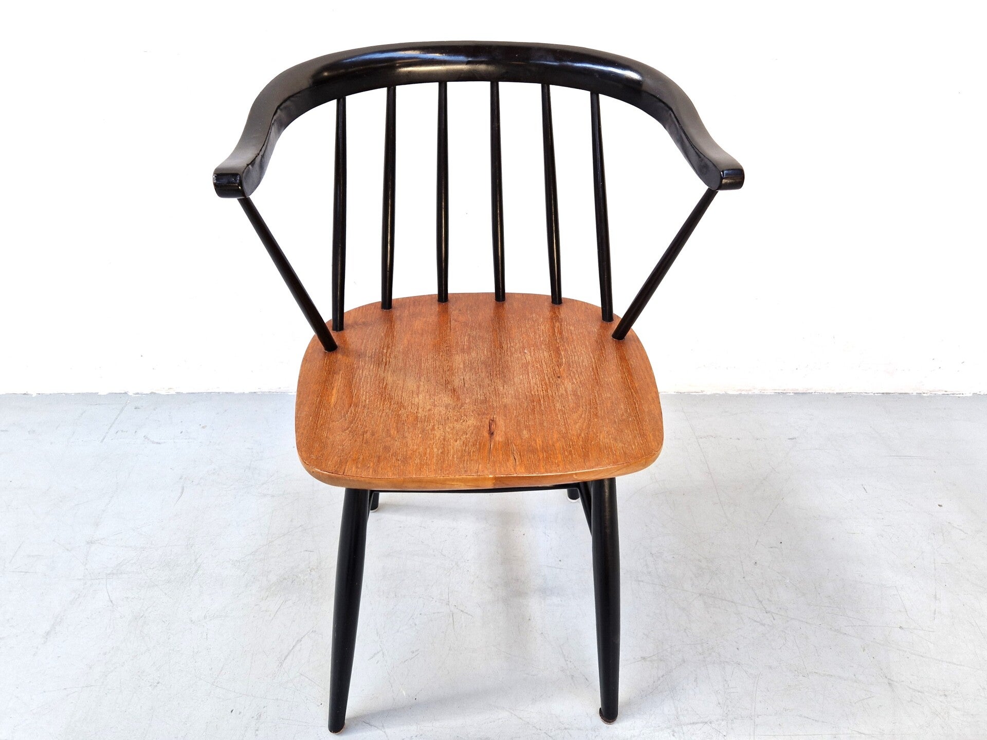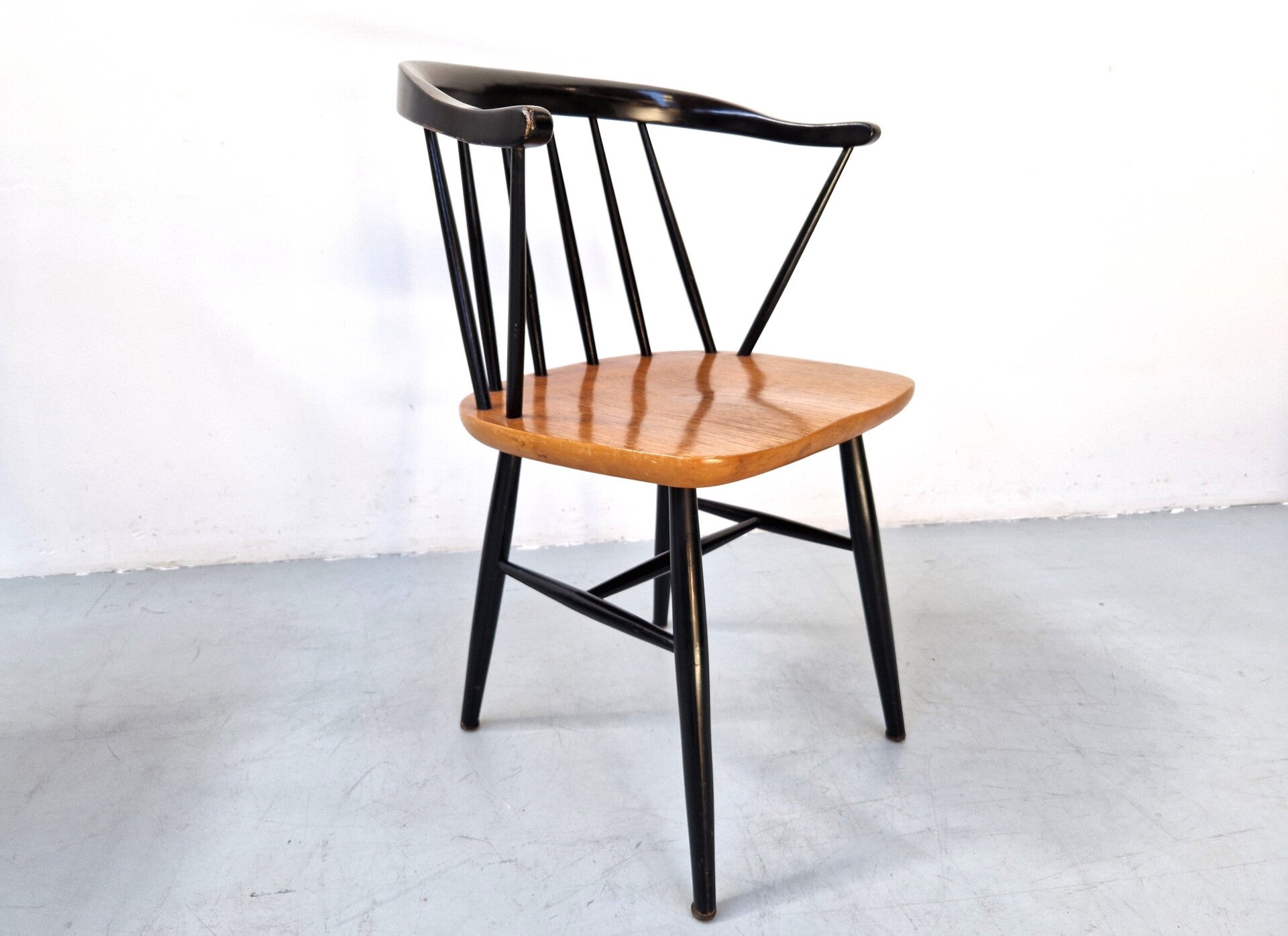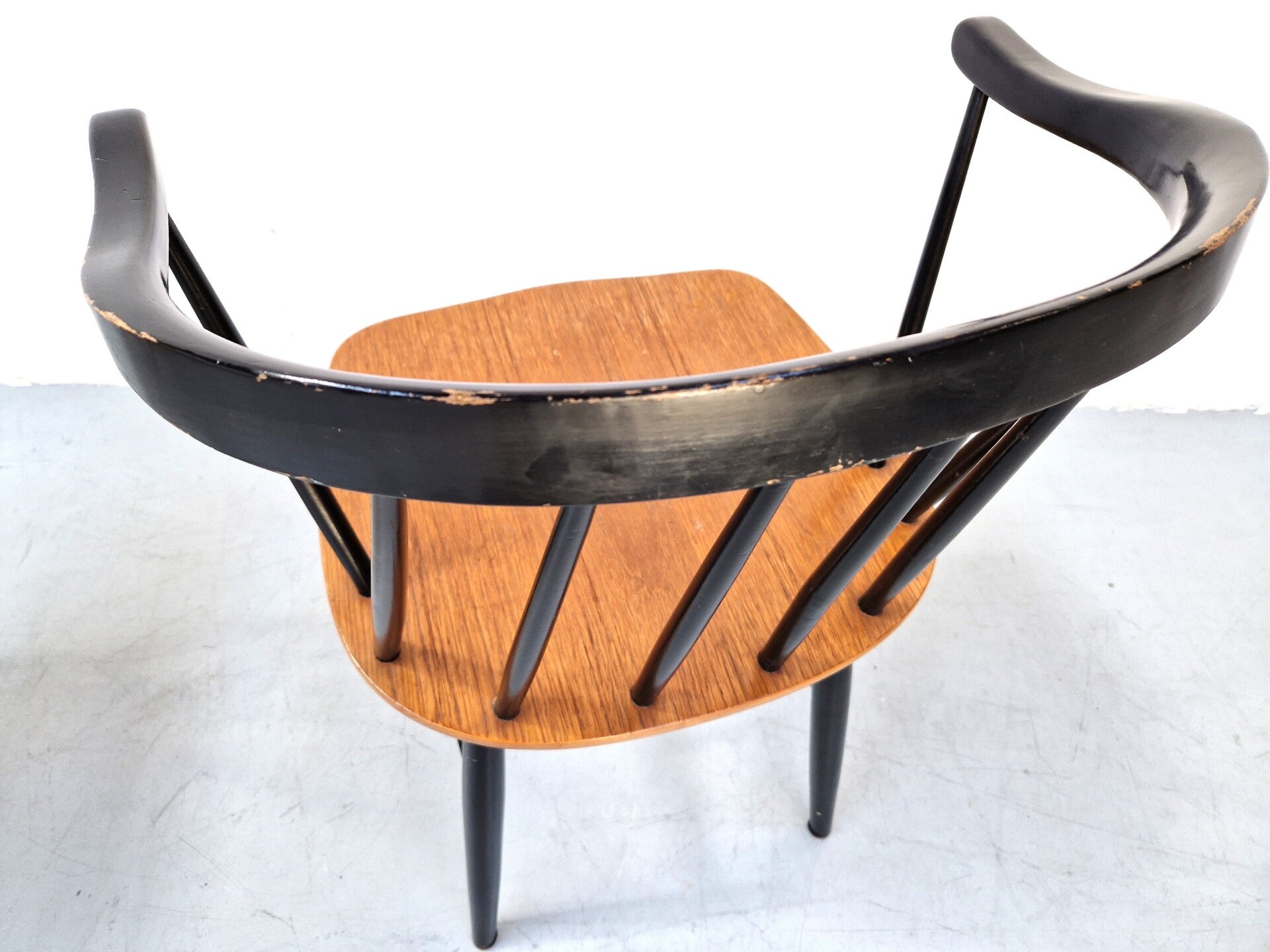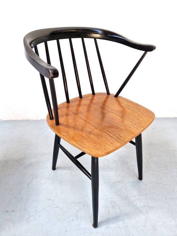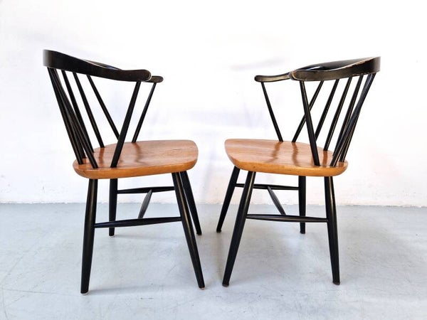 Scandinavian design at its best! These beautiful bar chairs with black stained pieces are attributed to designer Ilmari Tapiovaara and exude real class. One of the two has some veneer damage and a small repair, otherwise both in excellent vintage condition. See pictures!