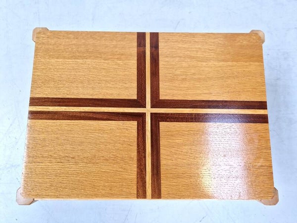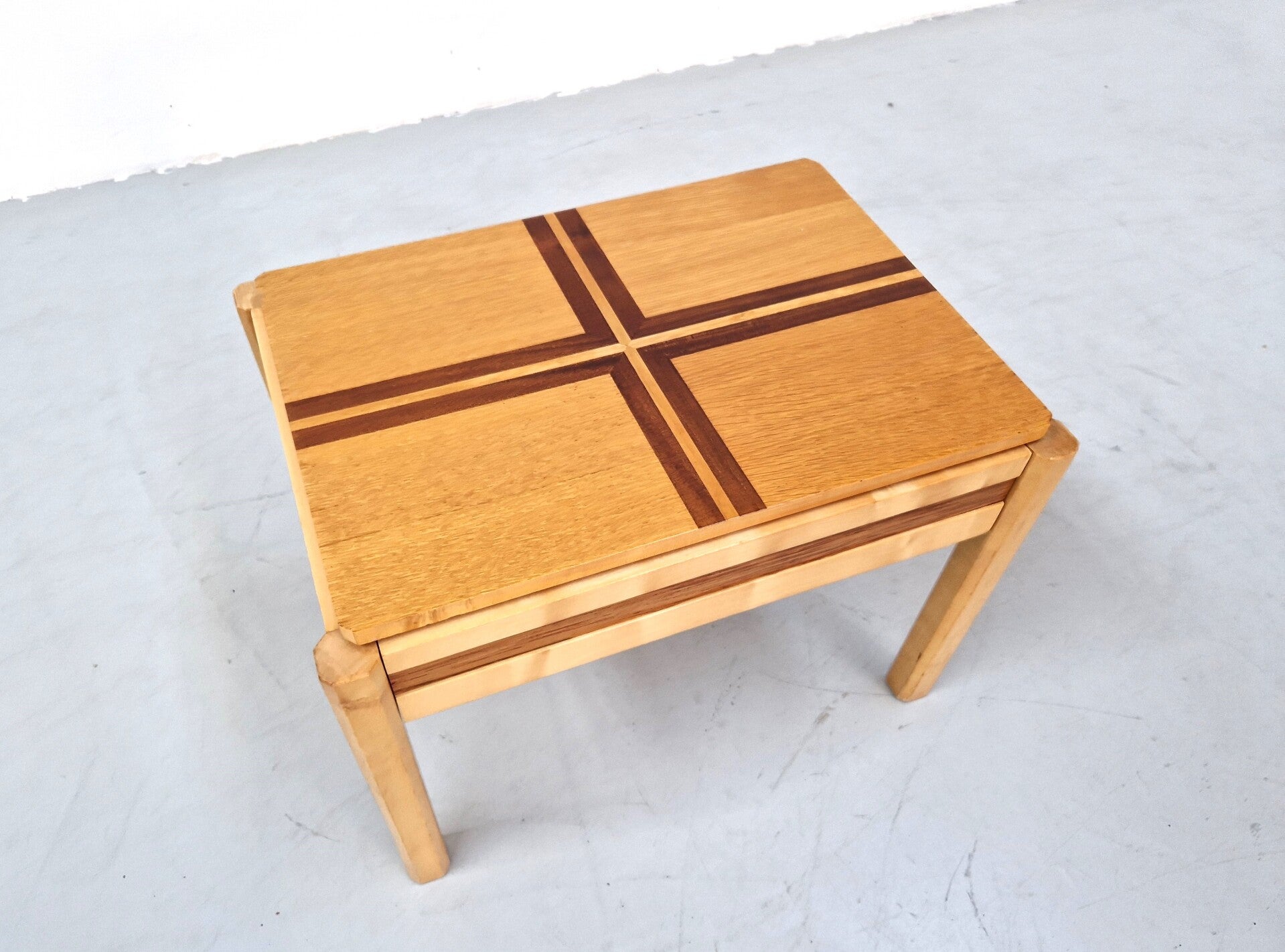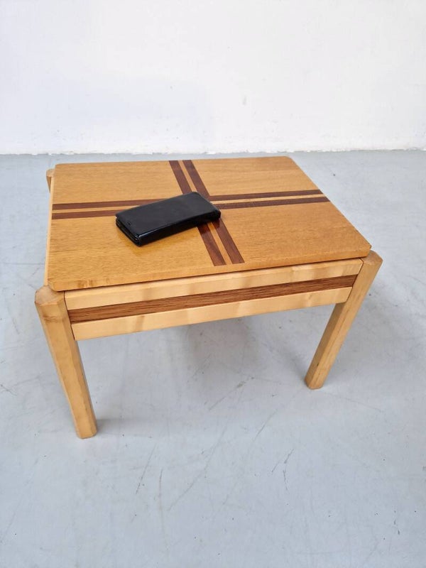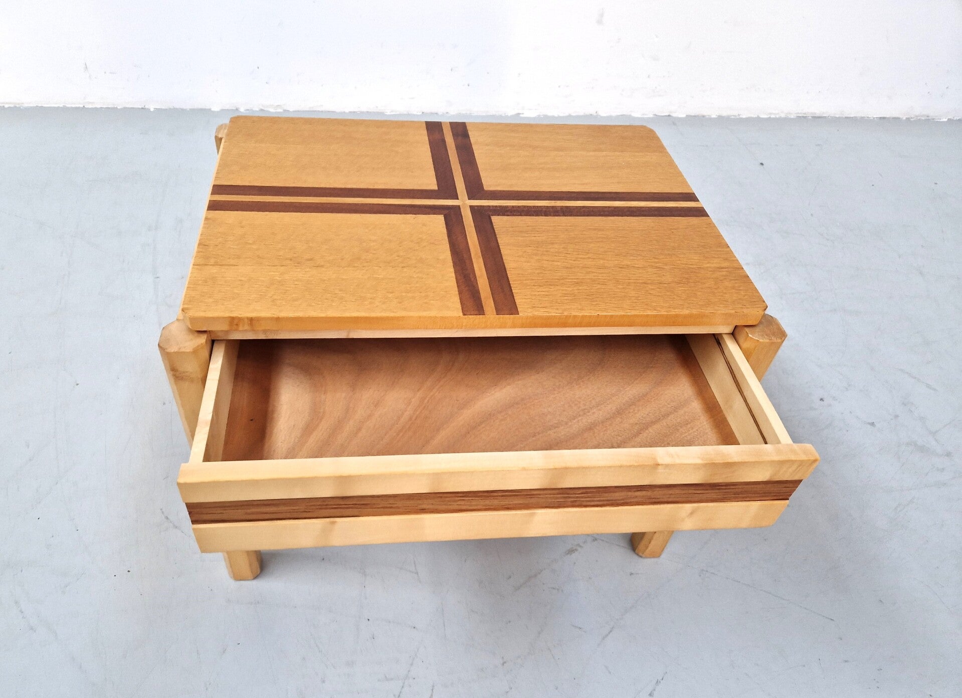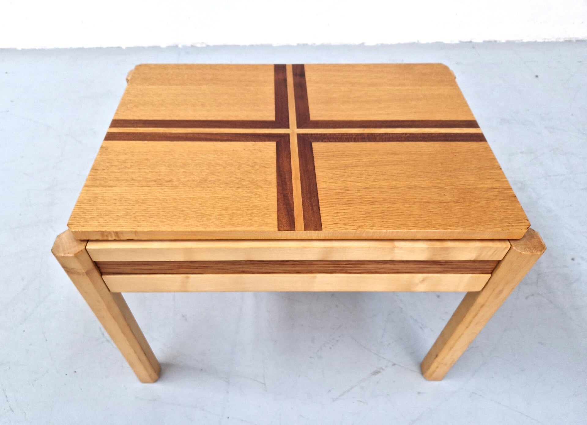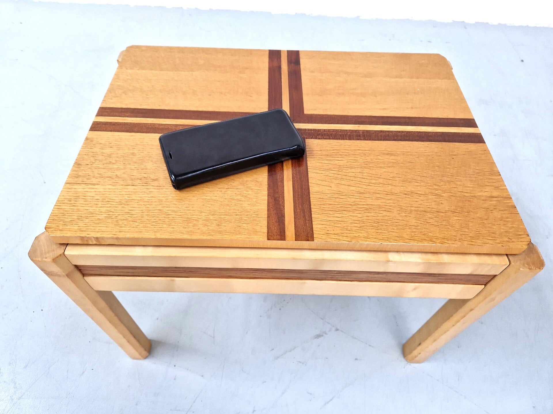 This bedside table or table with drawer is very refined with dark inlaid strips of wood on blank wood. Nice condition with only minor scratches.