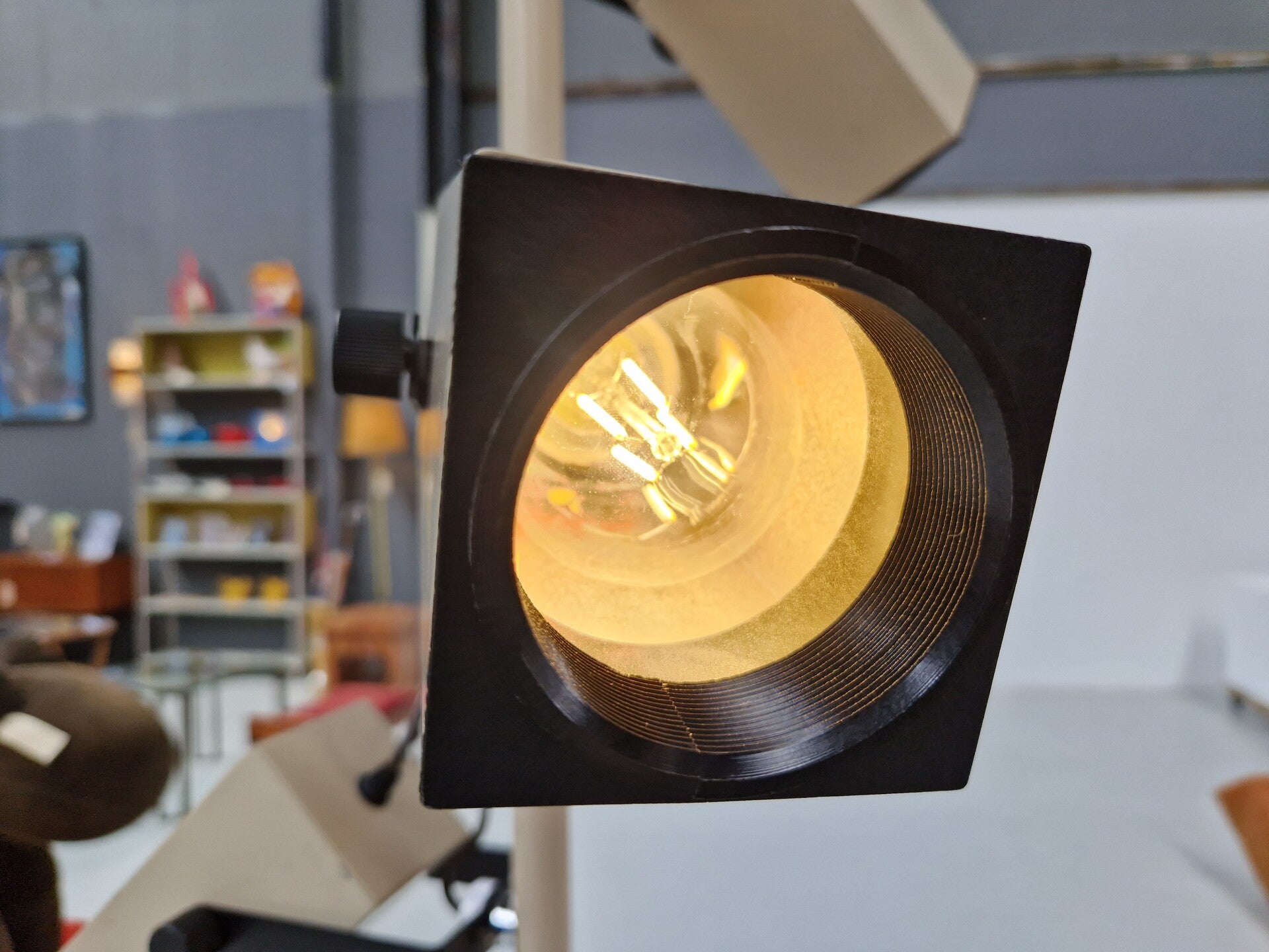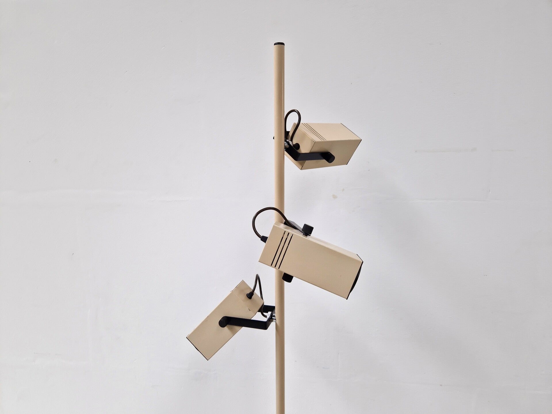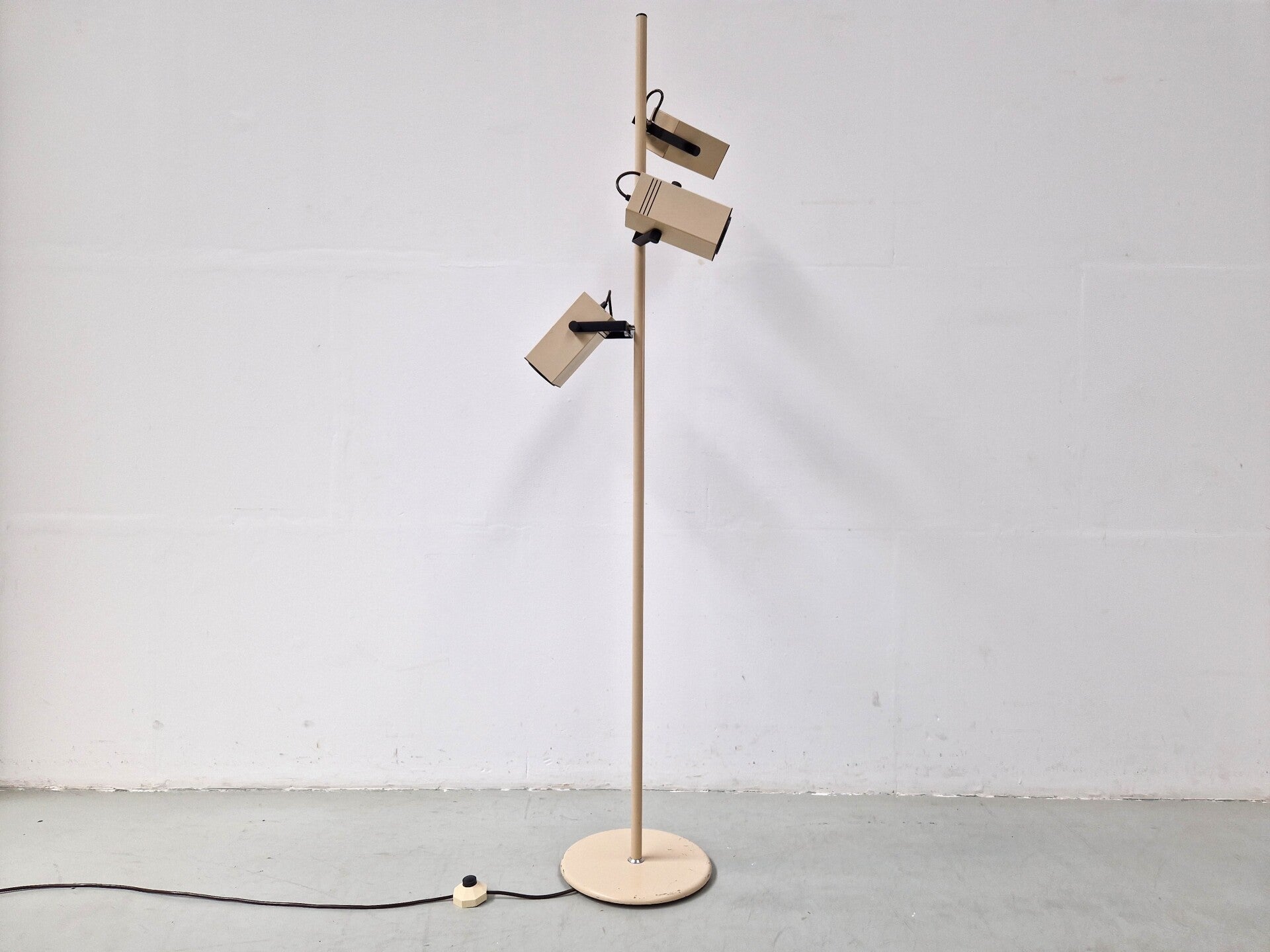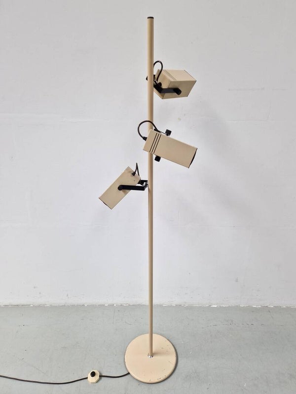 Sturdy creme colored floor lamp with three independently switchable (and movable) spotlights. Very nice atmosphere maker. Has traces of use (scratches in the paint) but no dents and works perfectly. Height: 168 cm