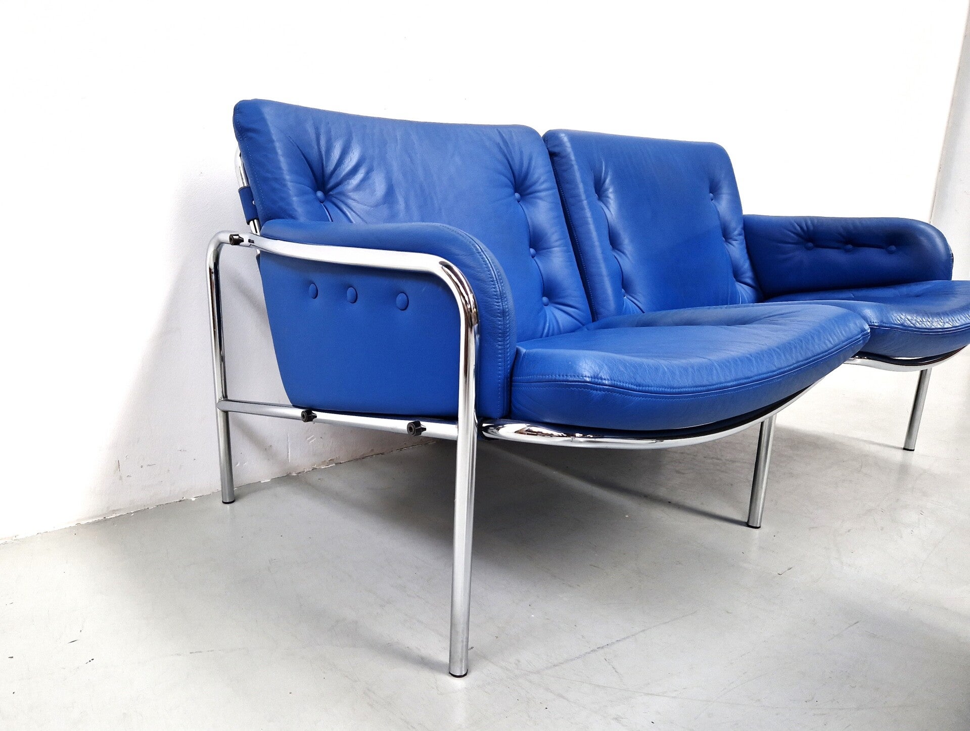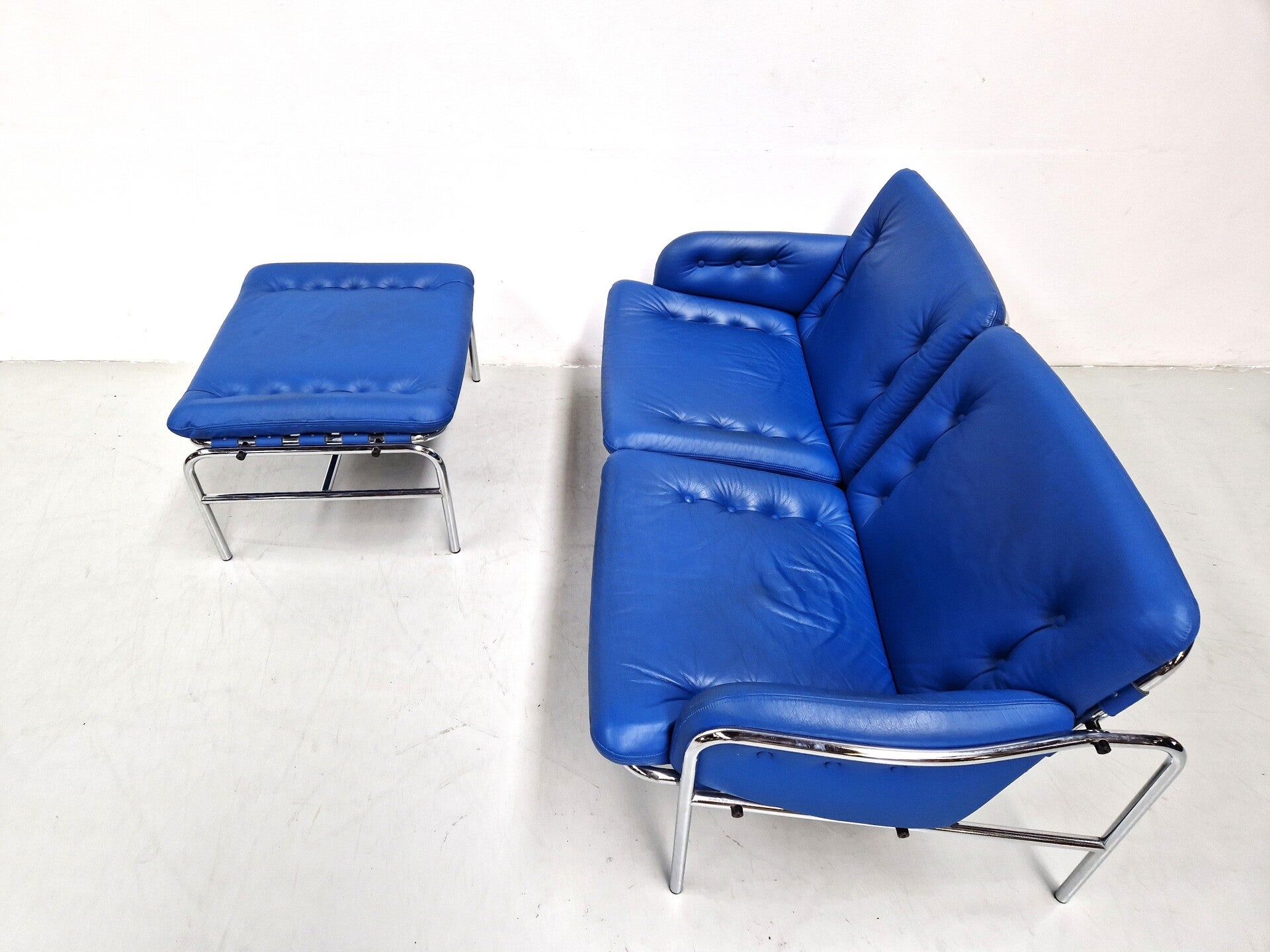 Iconic Osaka two-seater sofa by Martin Visser for 't Spectrum, designed and made in the 1960s. The upholstery was once redone in beautiful blue leather. The sofa is still very comfortable and is in very nice condition! We sell this sofa including the accompanying ottoman!