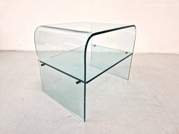 Beautiful Italian waterfall table with shelf, made of thick curved glass. Possibly from the Fiam brand or similar manufacturer. Can serve as a side table, coffee table or luxurious bedside table. Very nice condition, without chips and few scratches.