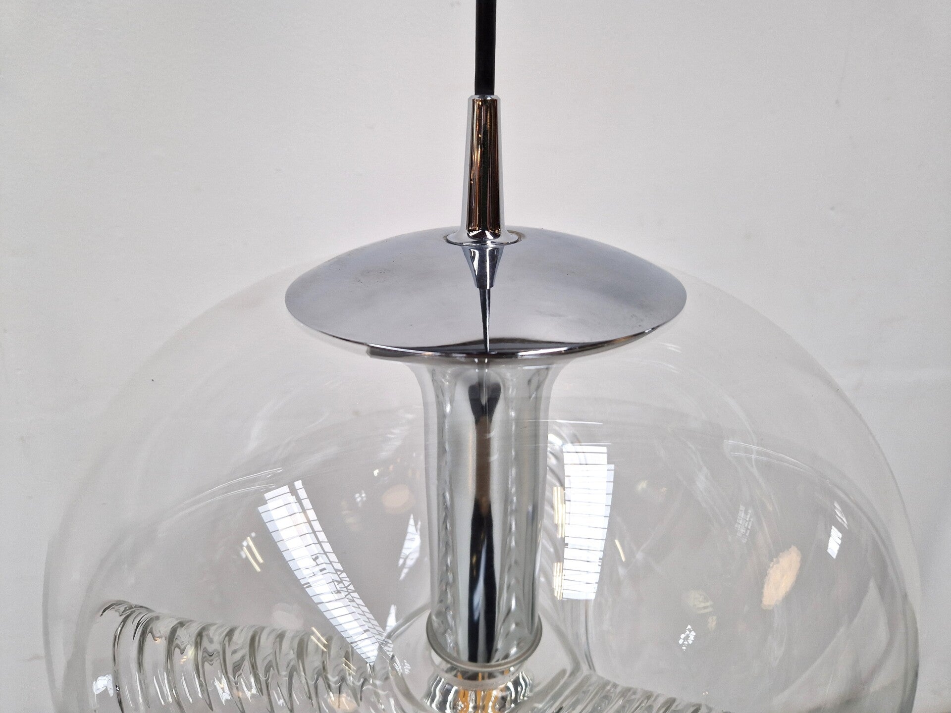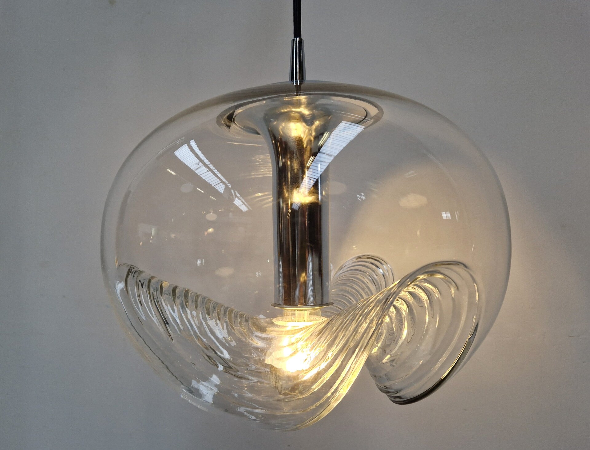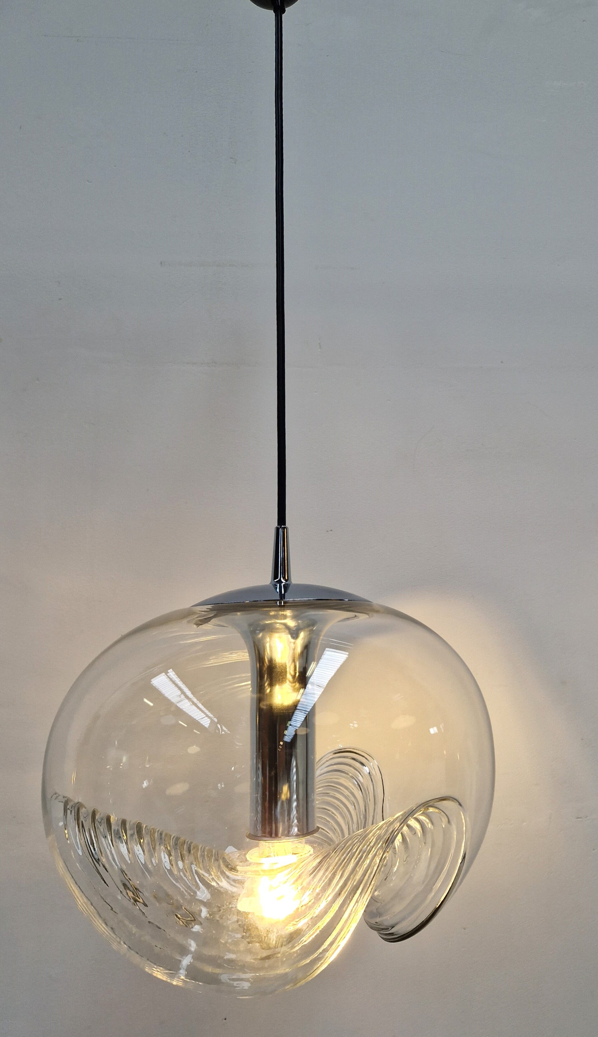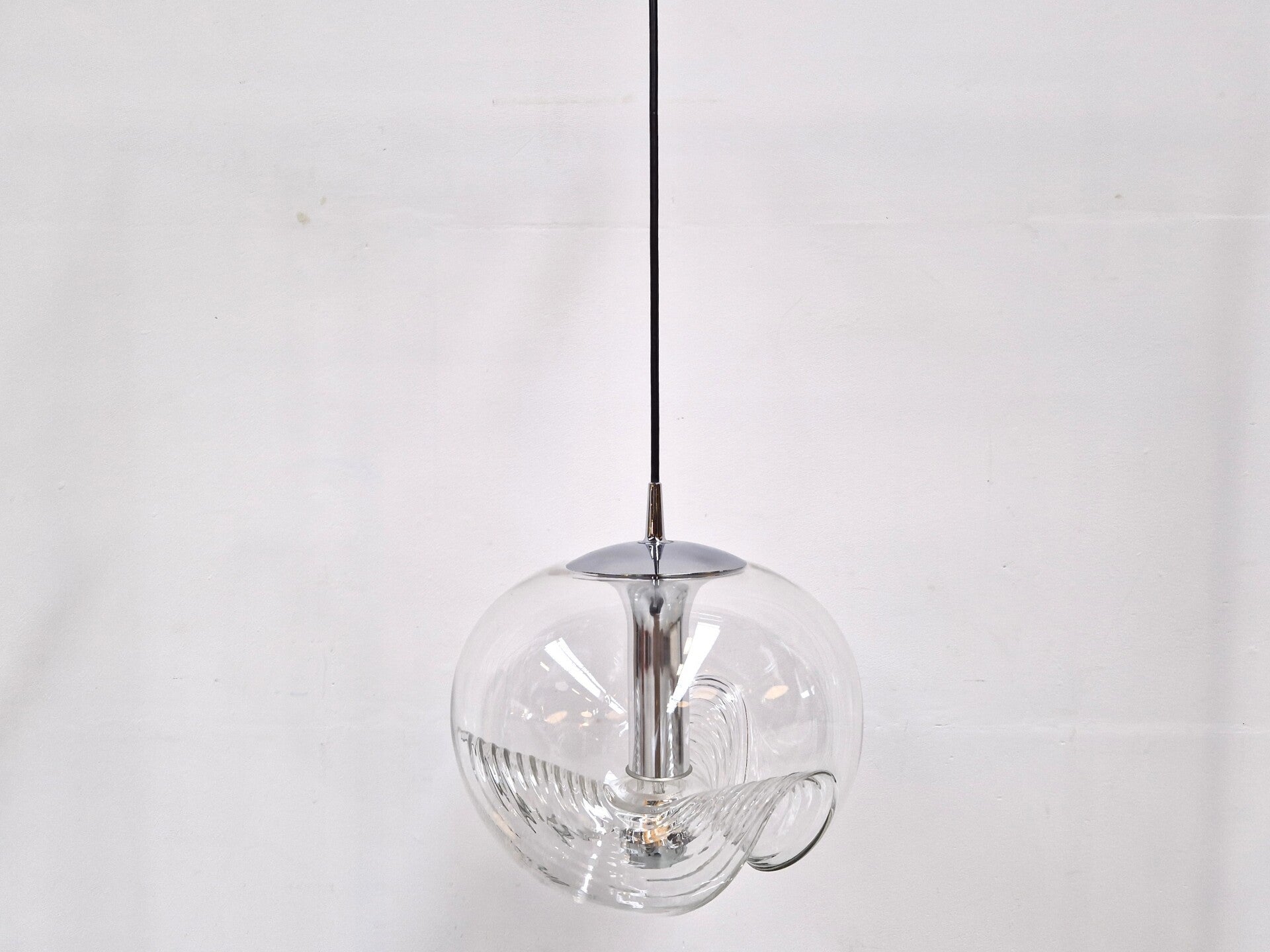 A classic midcentury pedant light by Peill & Putzler. This model is called Wave and made of clear glass and chrome. An E27 Mirror Bulb finishes it of in style. This piece has minor wear and is in great working condition.