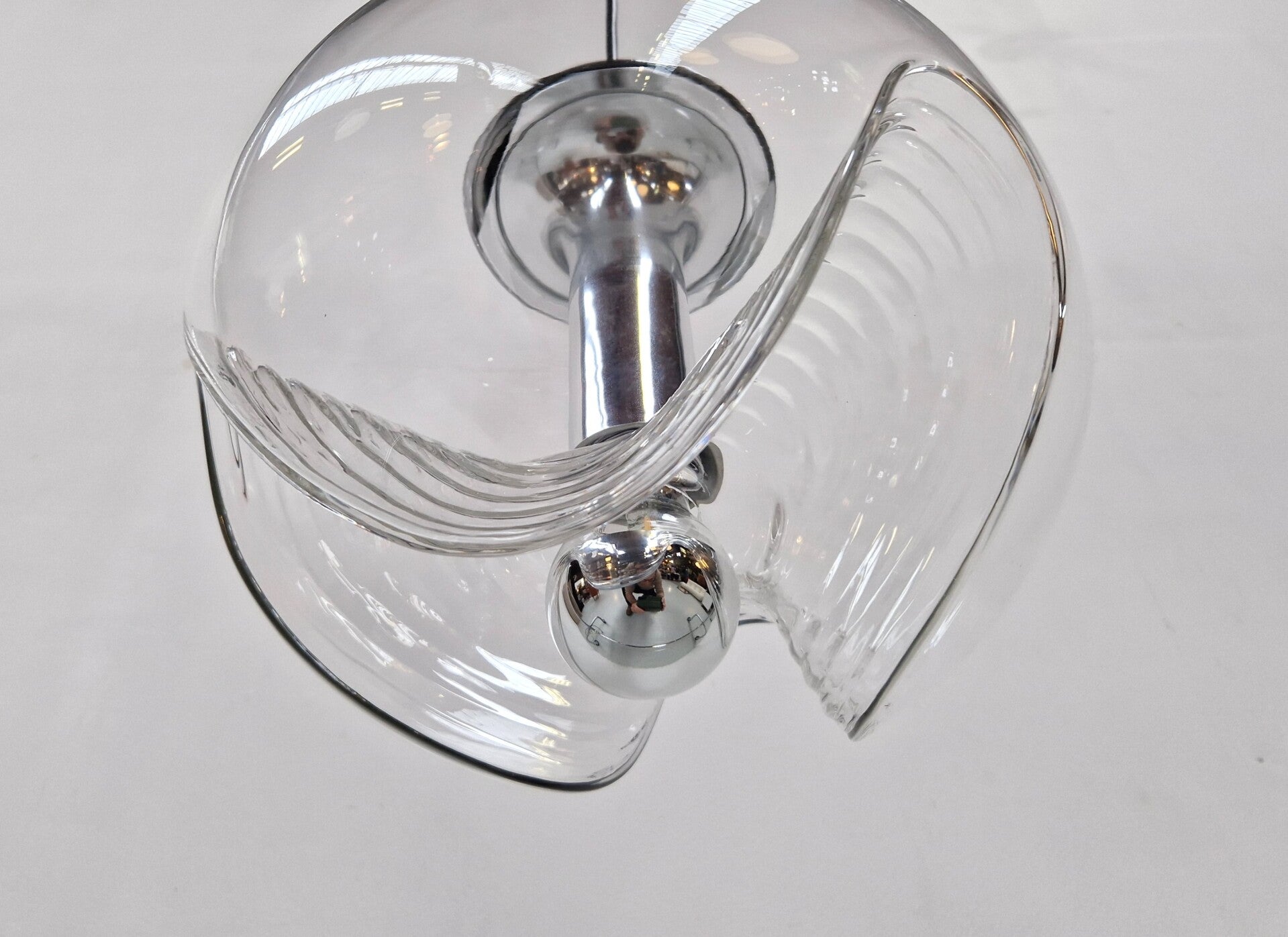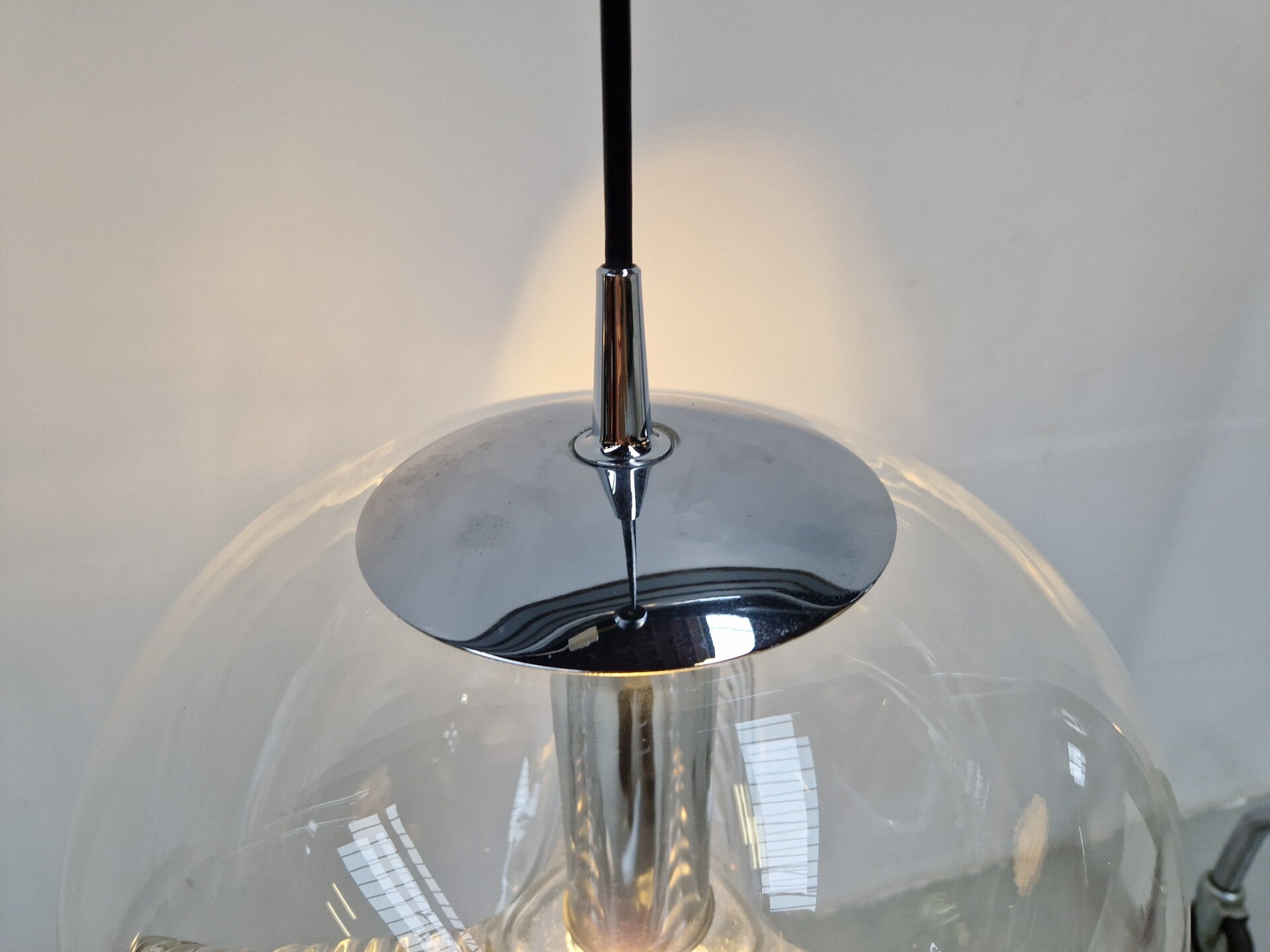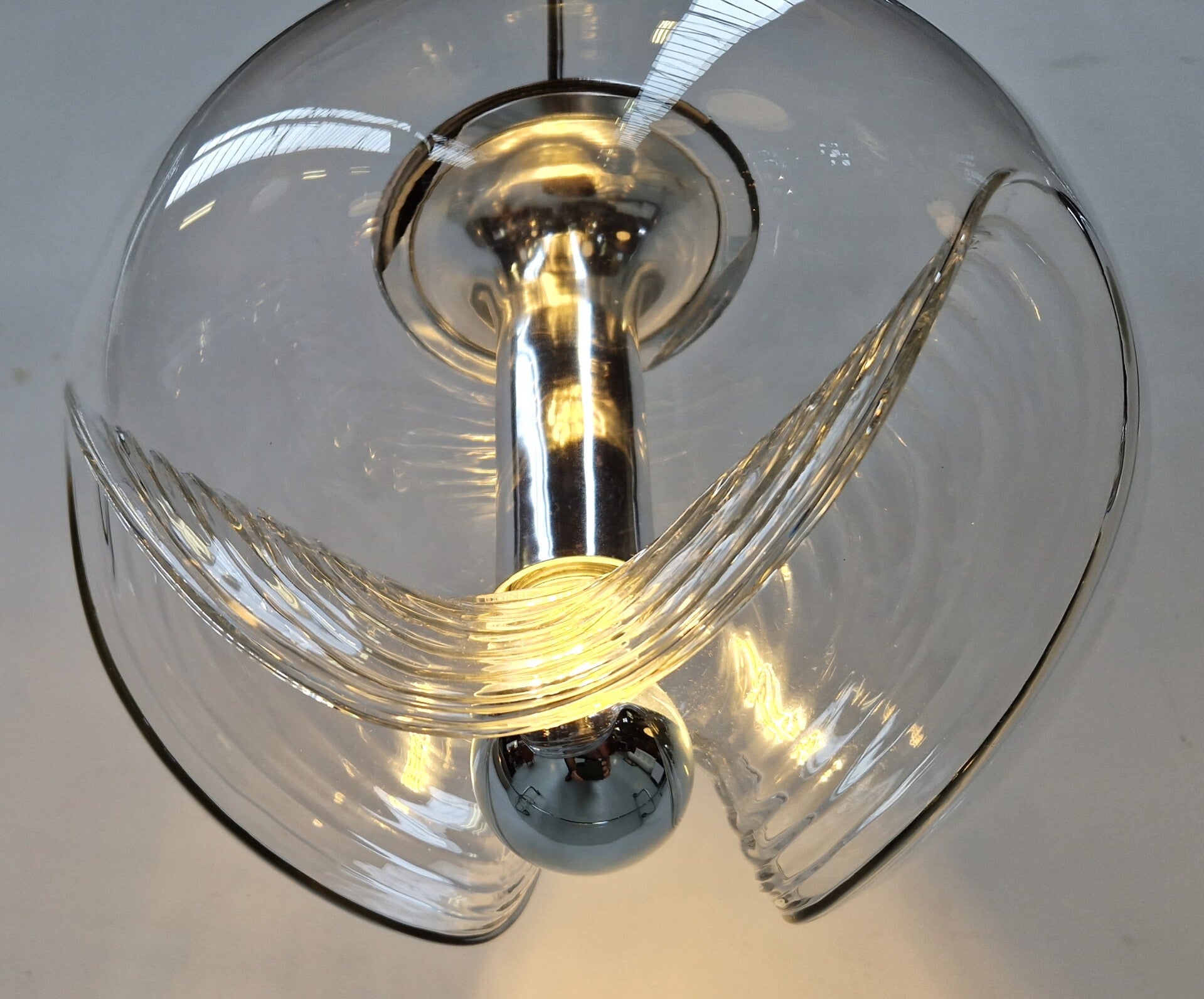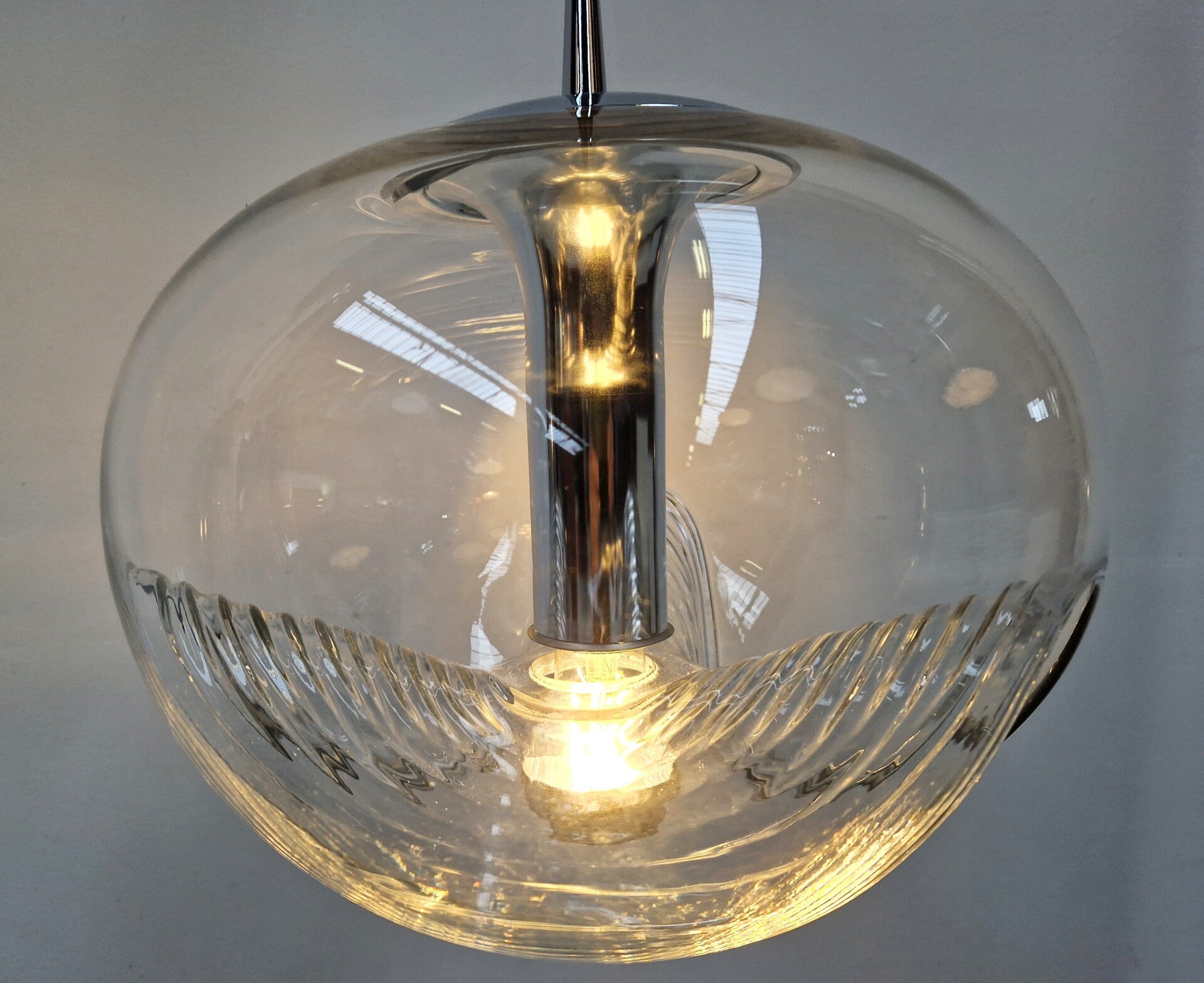 A classic midcentury pedant light by Peill & Putzler. This model is called Wave and made of clear glass and chrome. An E27 Mirror Bulb finishes it of in style. This piece has minor wear and is in great working condition.