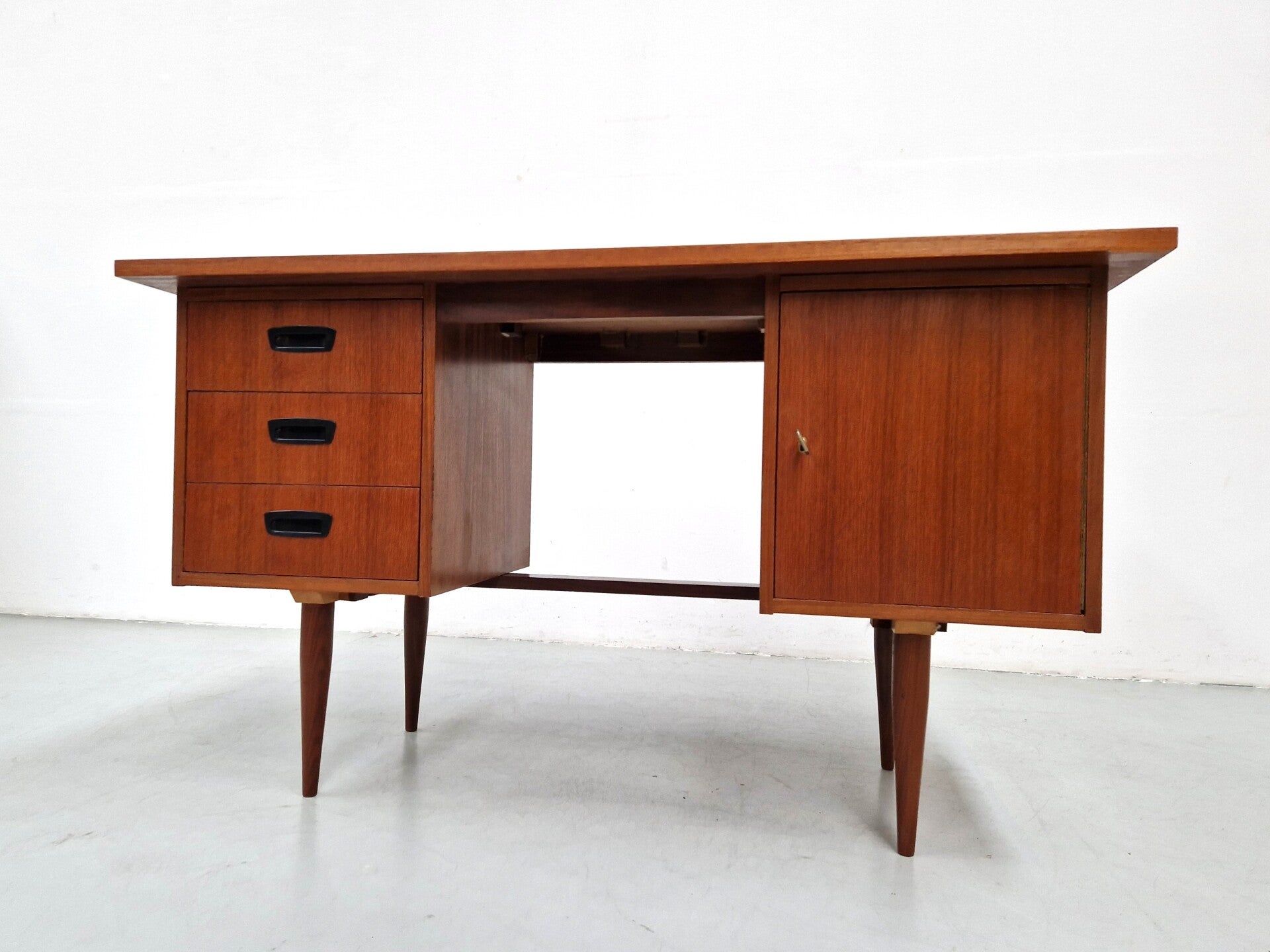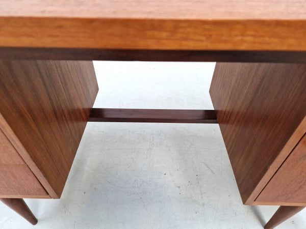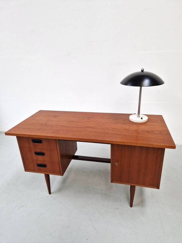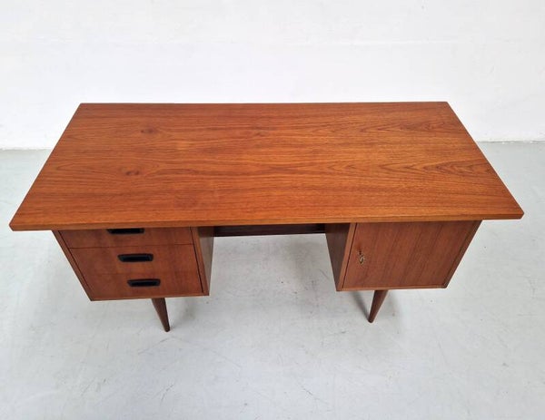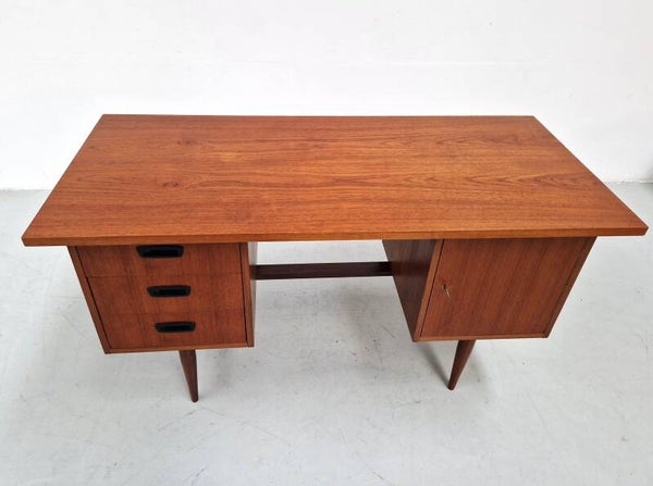 Well, if you have to work from home, do it in style. This vintage teak desk has a large compartment with shelf and three drawers. Very nice condition and a timeless design in Scandinavian style.