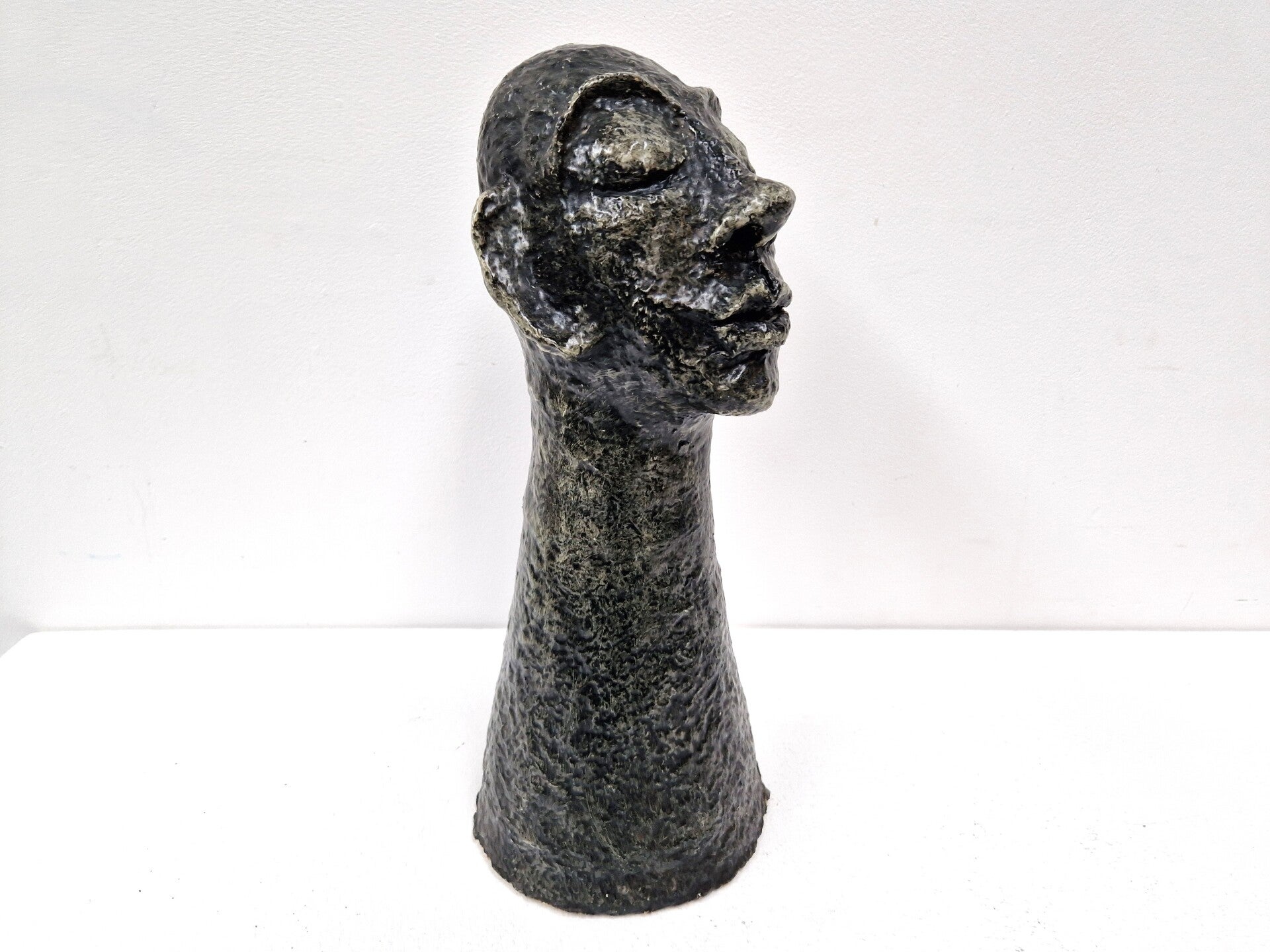 Striking face sculpted on a flower pot with paper mache in really nice original condition. Probably made in The Netherlands or Belgium. The outside has a nice faux bronze patina. Signed by artist inside.