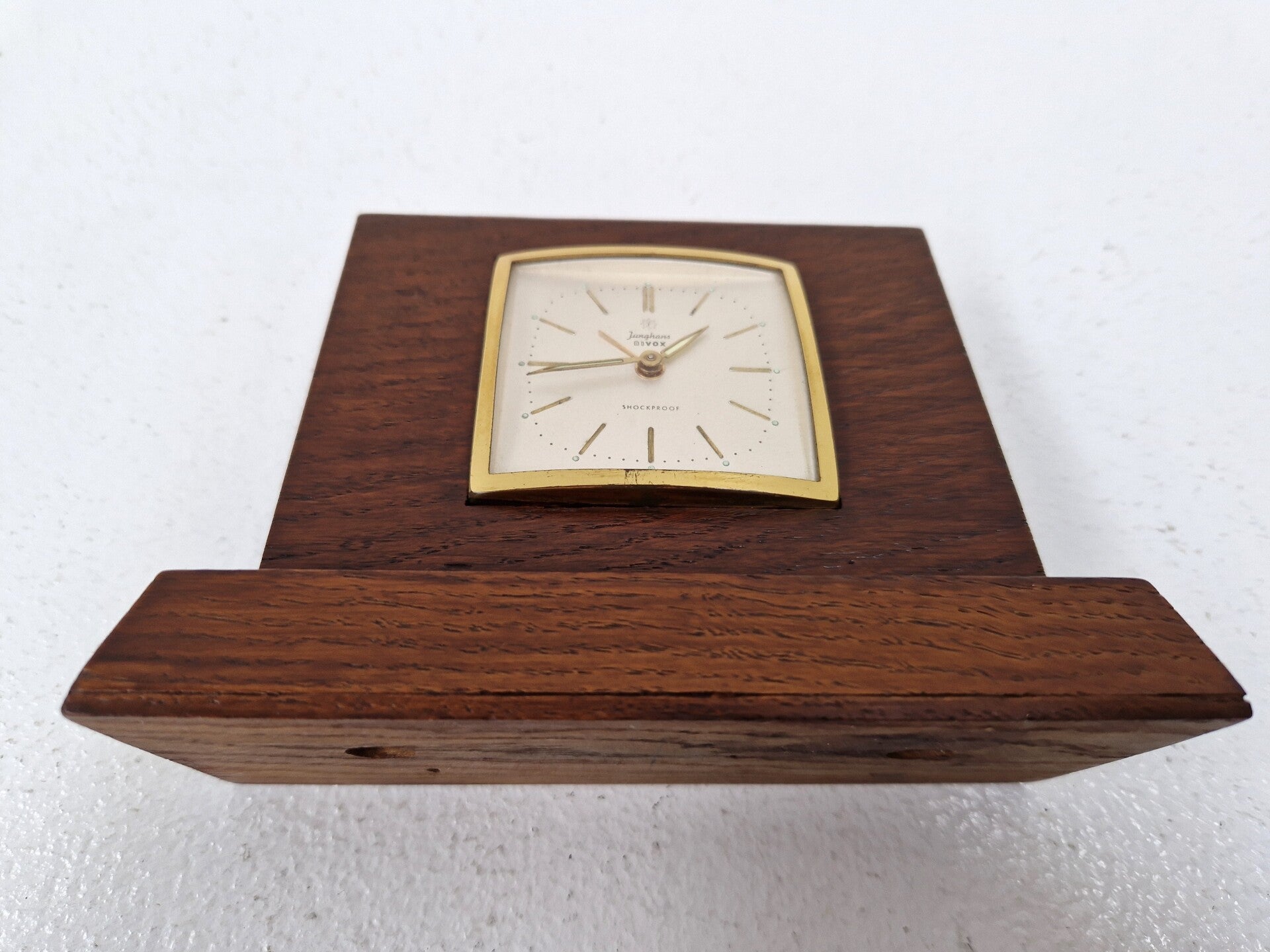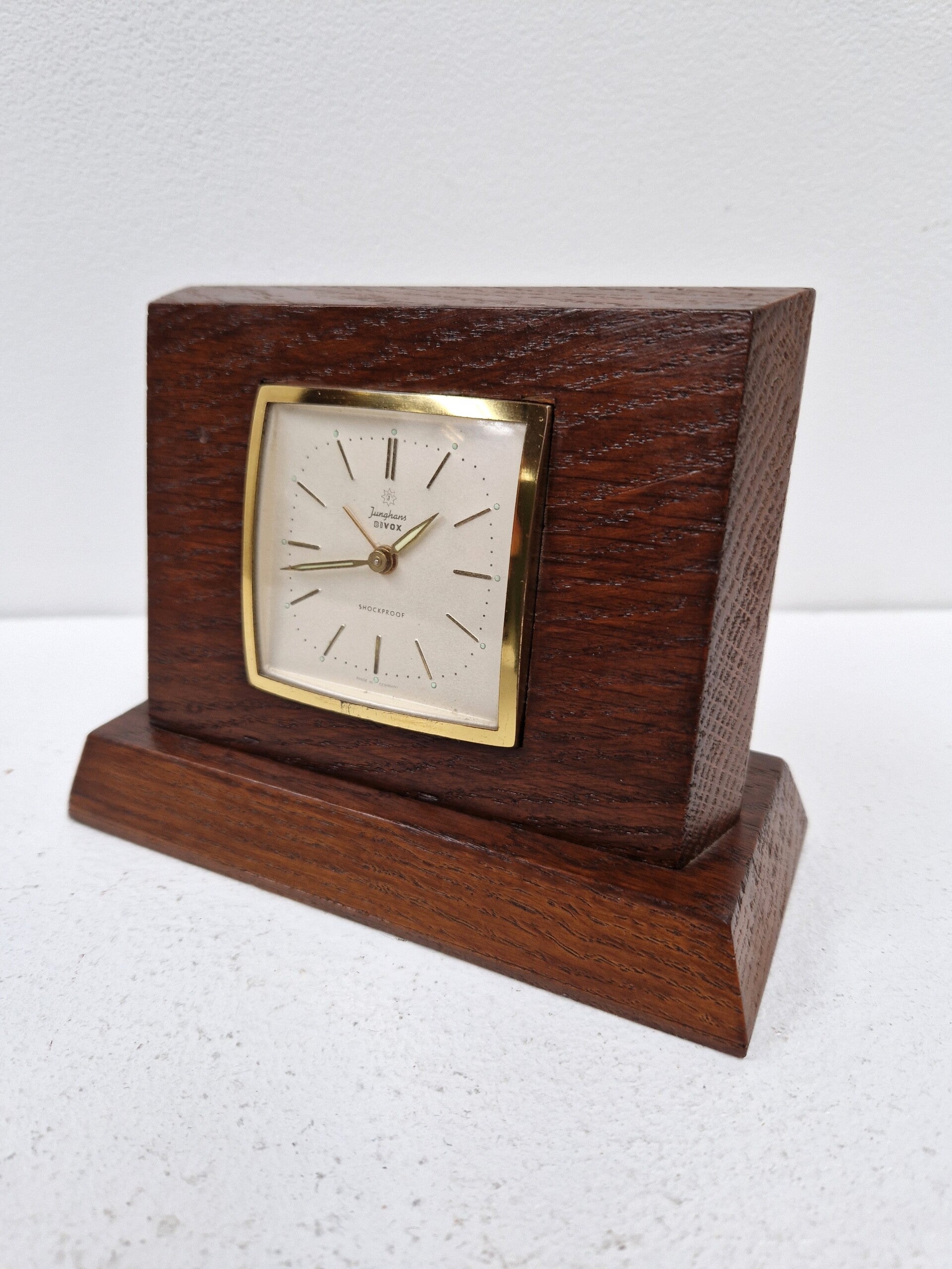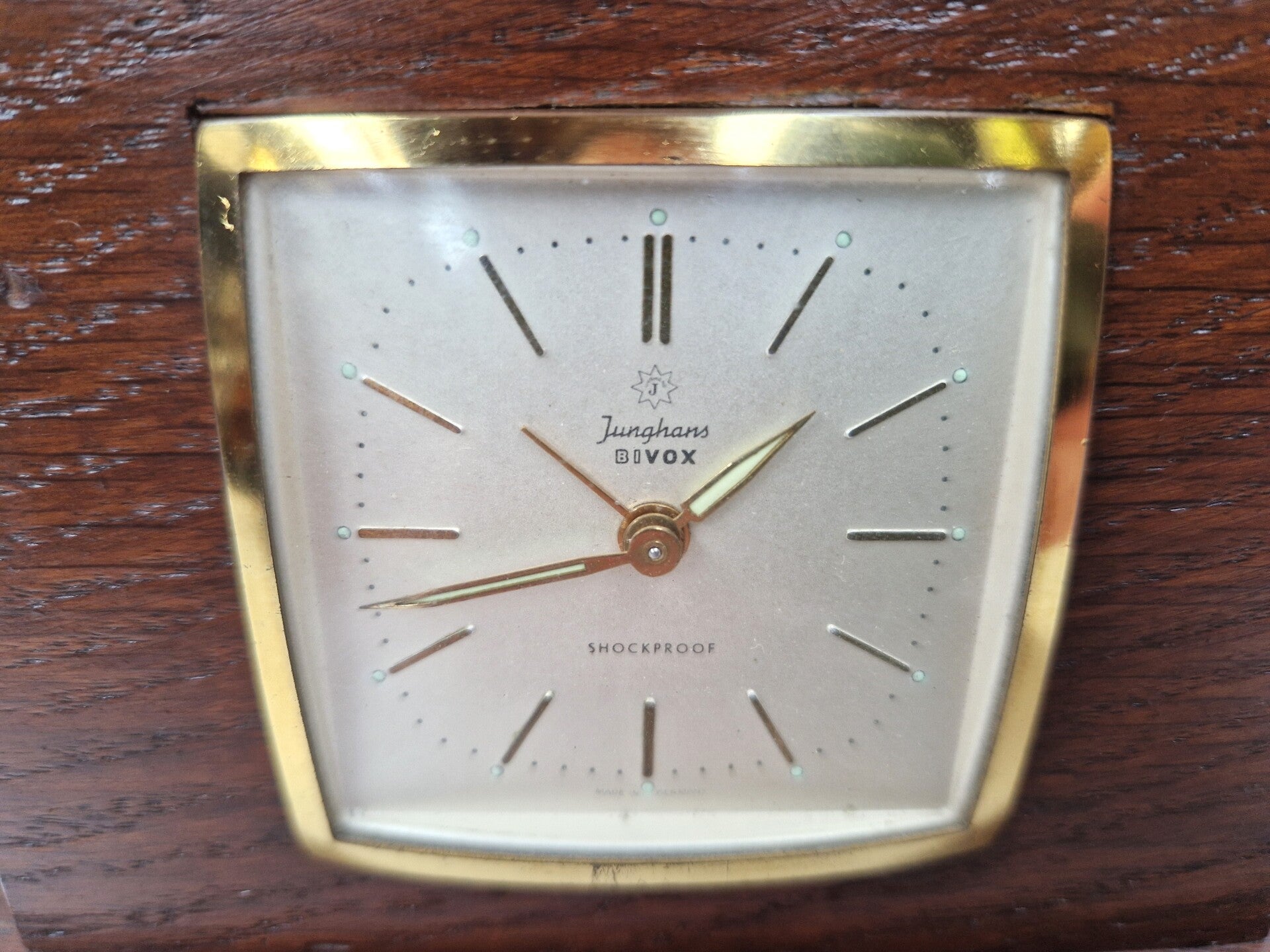 Great little BIVOX table clock by Junghans set in teak. The arms glow in the dark so you will be able to read it at night. Works, rings and looks great. Minor wear on the brass parts.