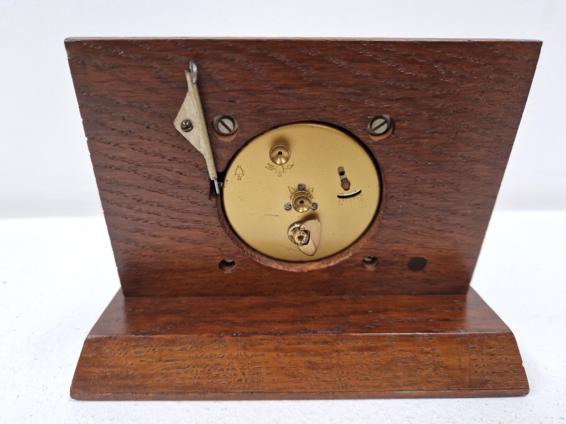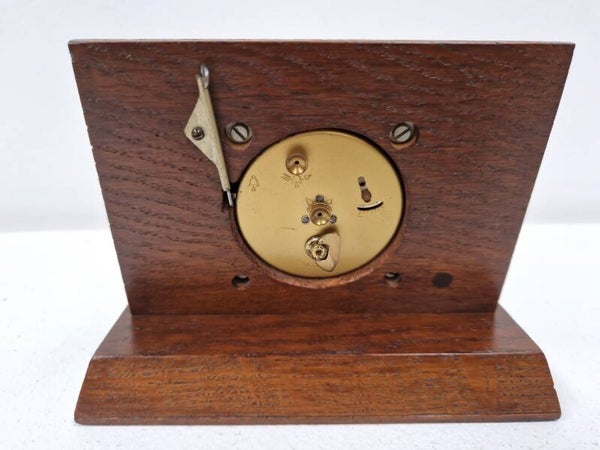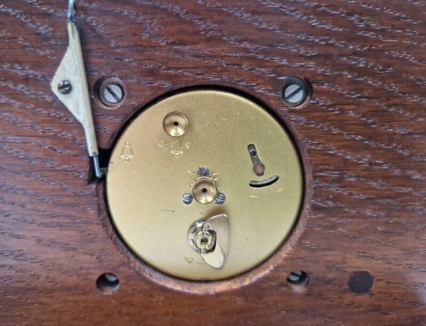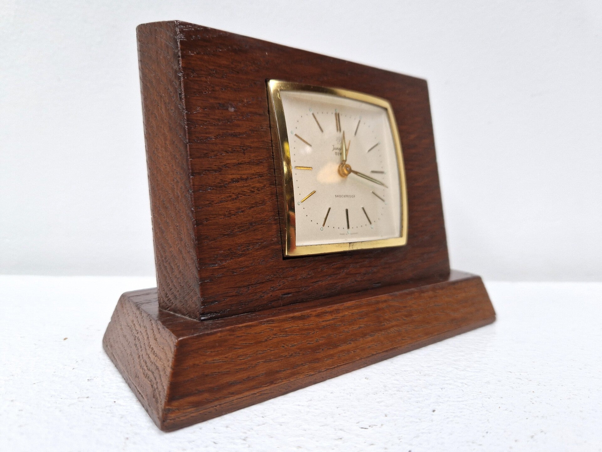 Great little BIVOX table clock by Junghans set in teak. The arms glow in the dark so you will be able to read it at night. Works, rings and looks great. Minor wear on the brass parts.