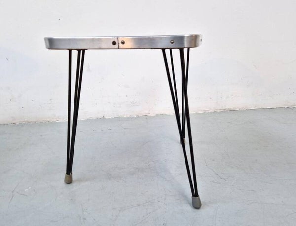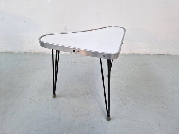 Groovy little kidney shaped side or planter table with steel hairpin feet. It has a typical midcentury fine geometric pattern all over the top. Overall great vintage condition. Ready for a new living room!