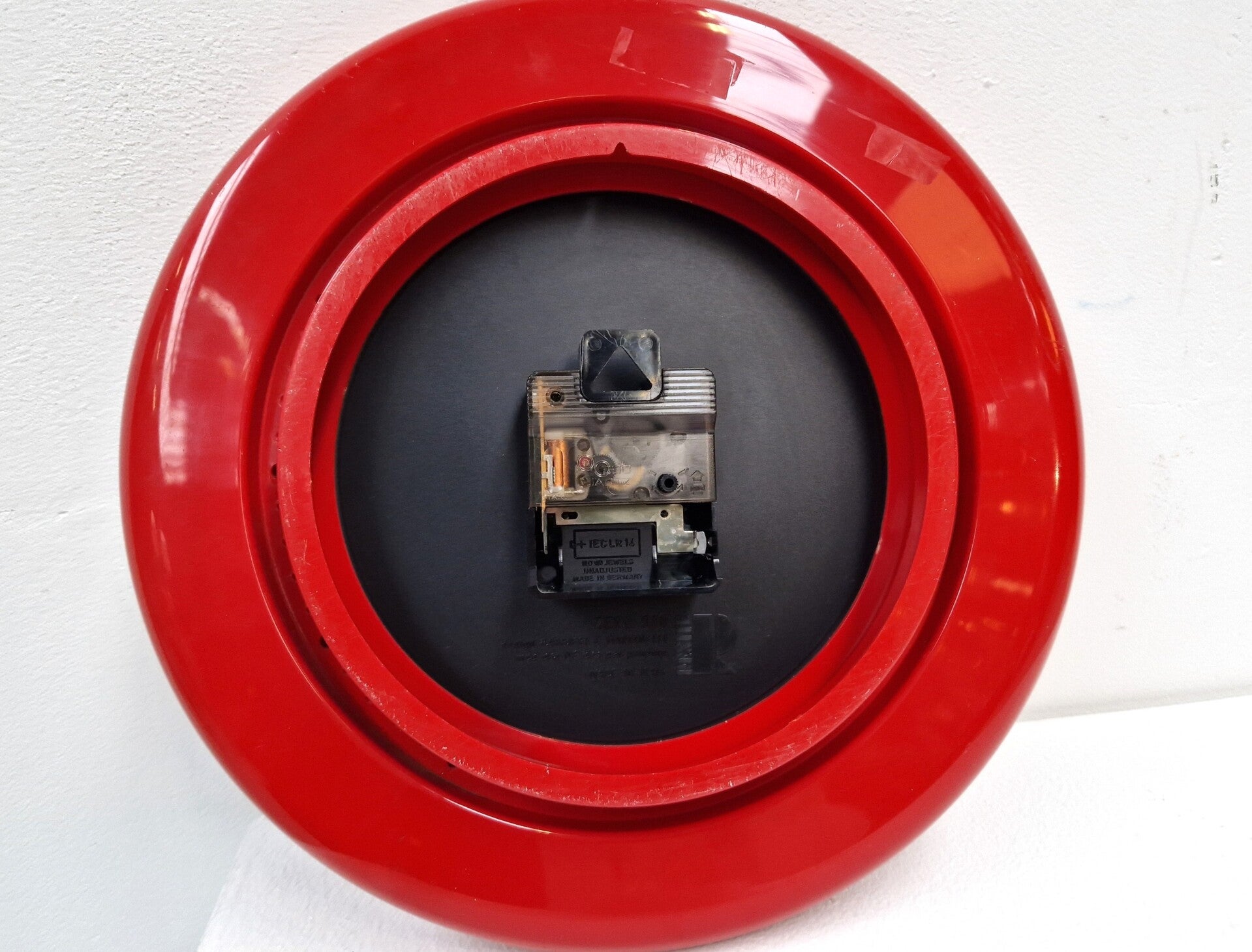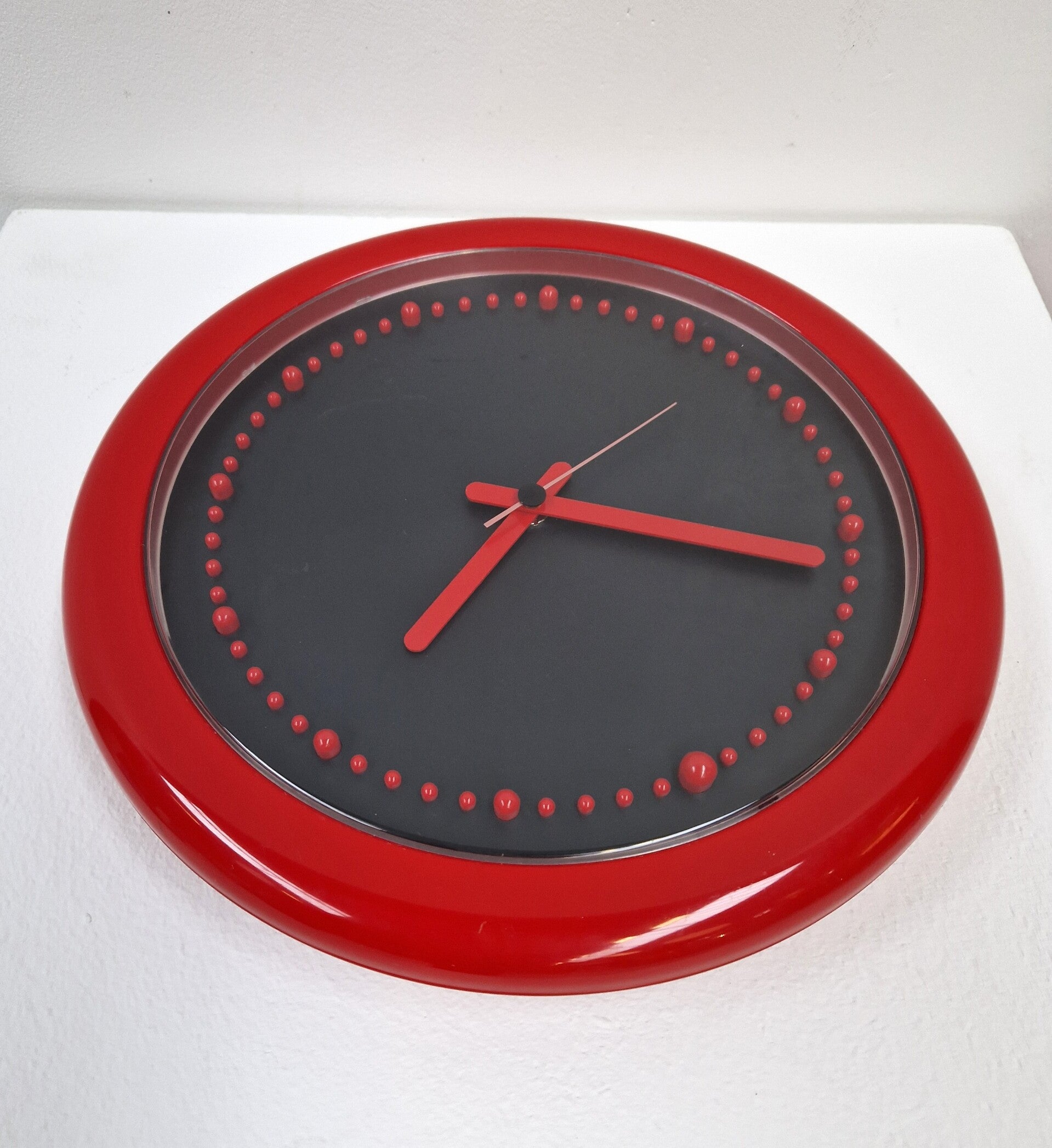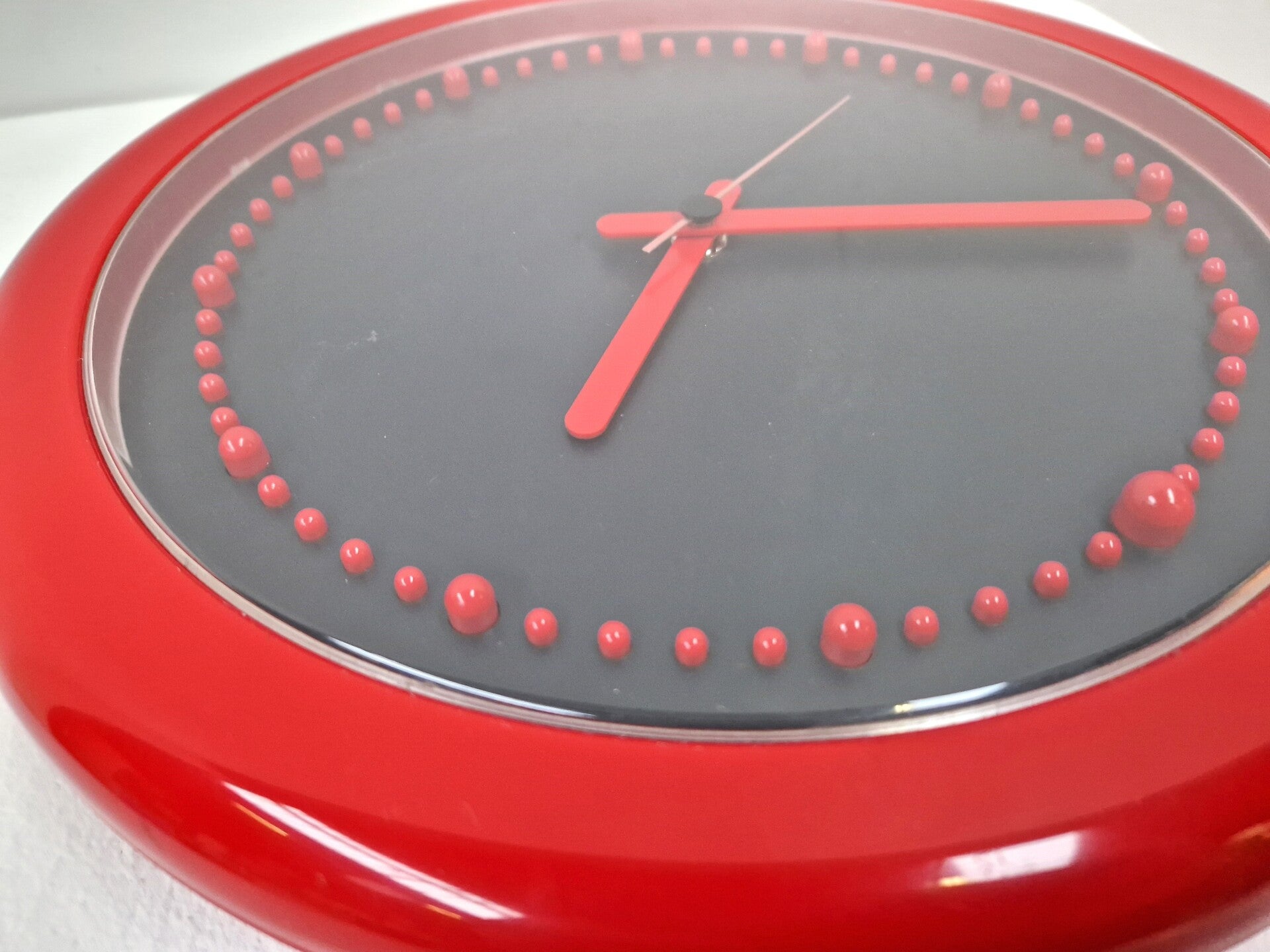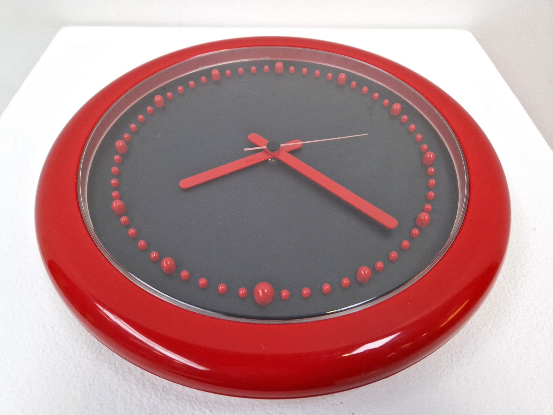 Designed by Raul Barbieri and Giorgio Marianelli for Rexite in 1981, this Zero 980 wall clock has a striking red and black color combination. Red plastic case, red hands, and raised red plastic bumps for the clock's numbers and a black face. Perfect combination of sophisticated Italian postmodern design.