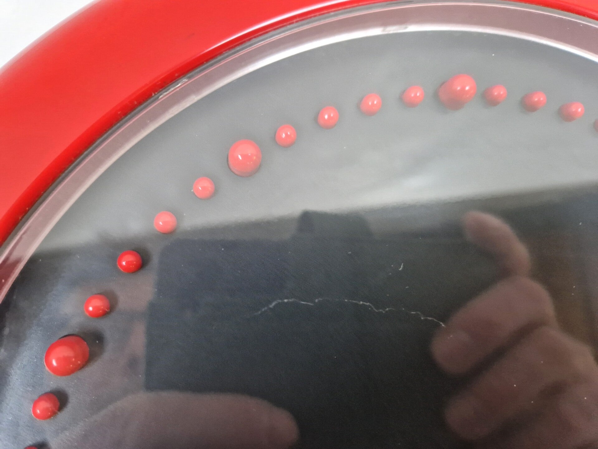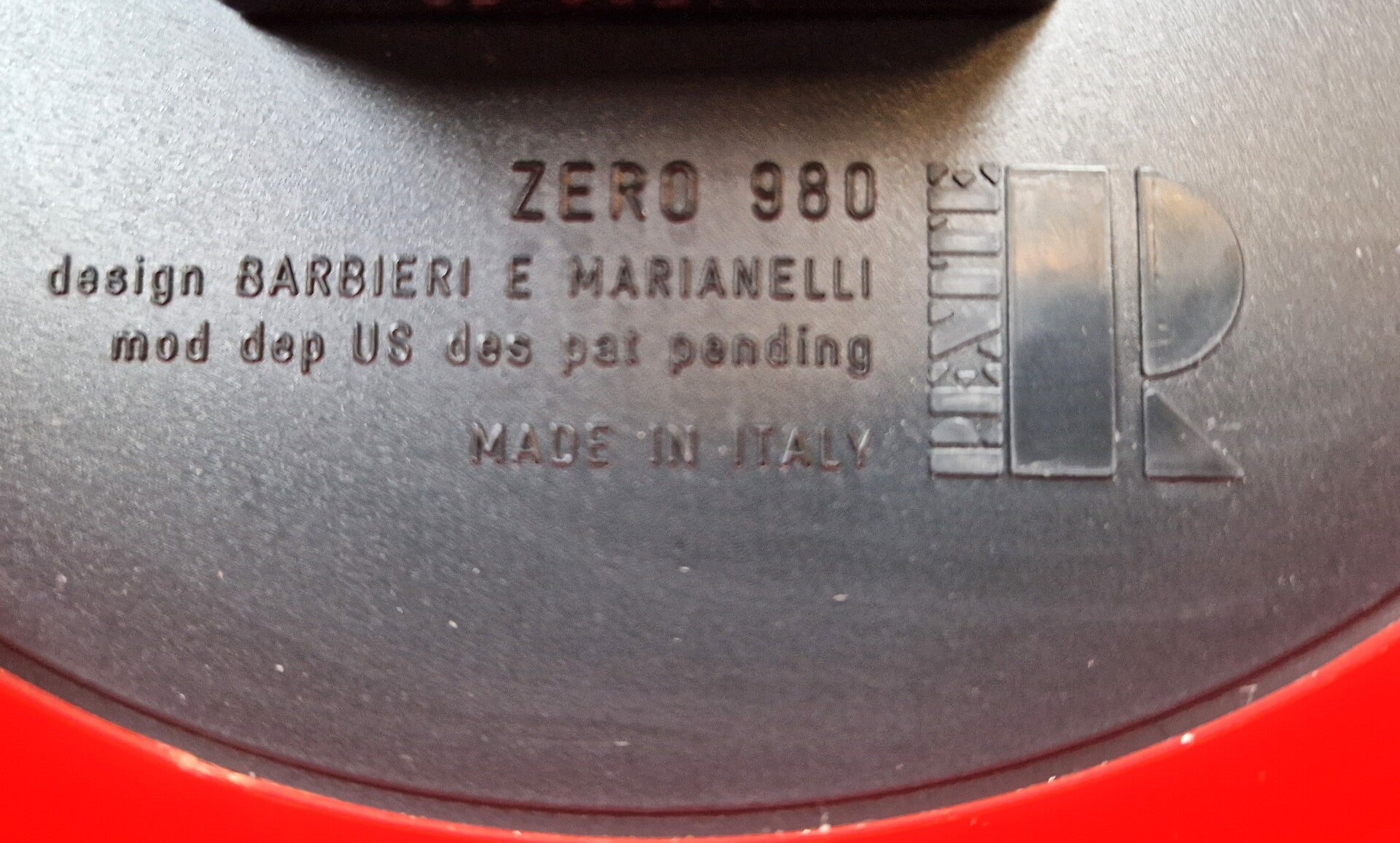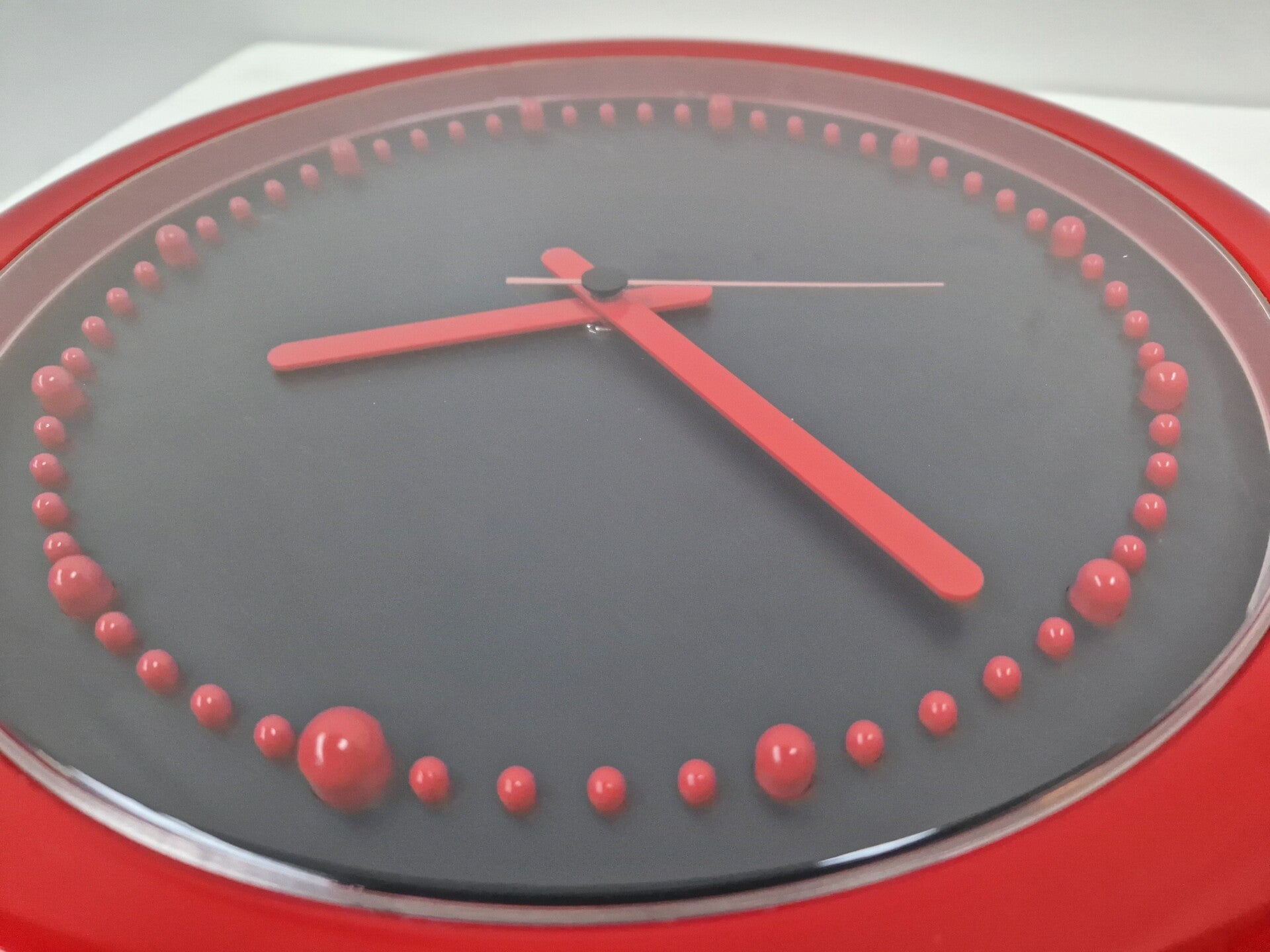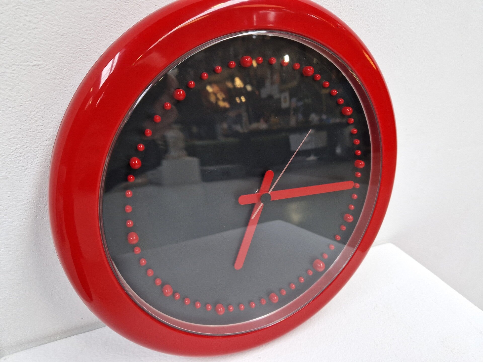 Designed by Raul Barbieri and Giorgio Marianelli for Rexite in 1981, this Zero 980 wall clock has a striking red and black color combination. Red plastic case, red hands, and raised red plastic bumps for the clock's numbers and a black face. Perfect combination of sophisticated Italian postmodern design.