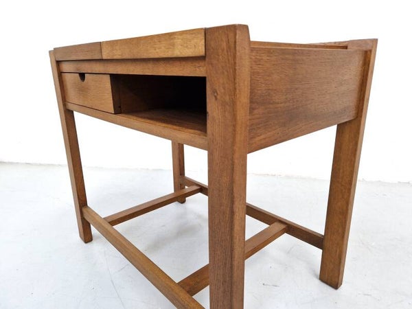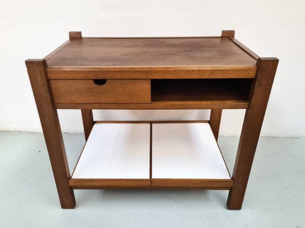 This is a gem of a table (or is it a sideboard?) with a drawer and loose trays that are also two-sided and can be placed in different places on the table. Made aroudn 1955 of oak in a modernist style with hints of art deco and incredibly functional. Beautiful finish and shapes and in a very nice condition. Only some light marks on the top.