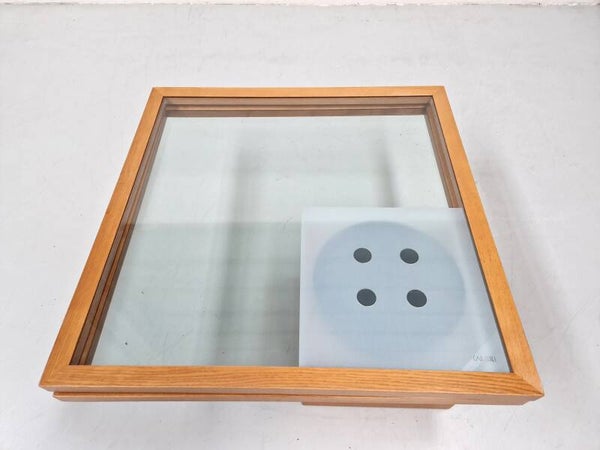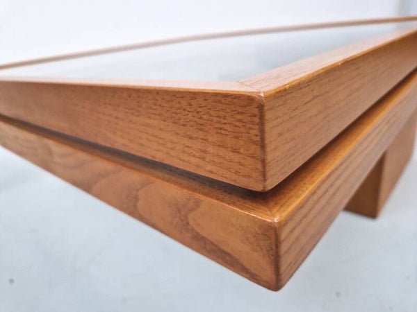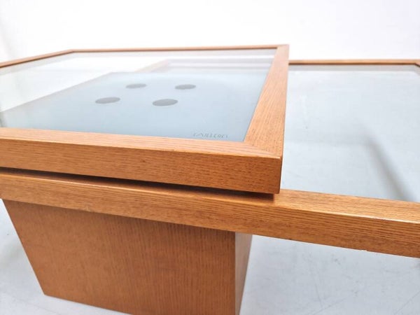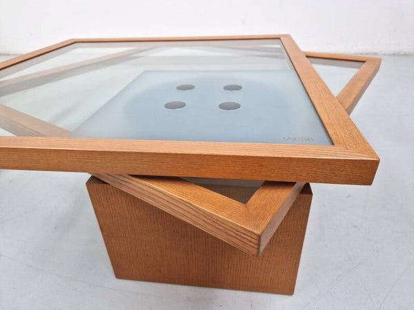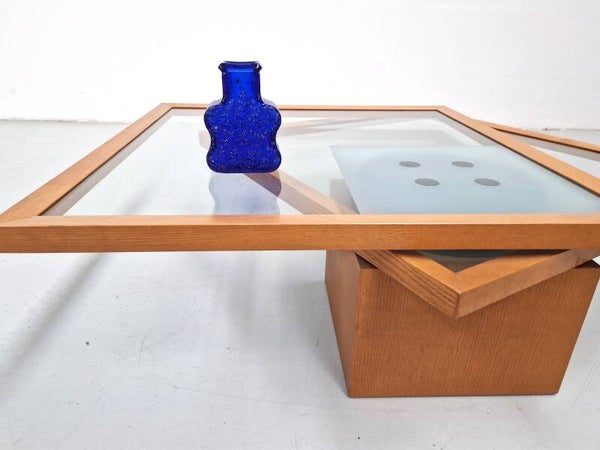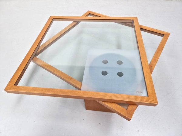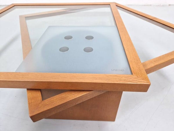 Amazing postmodern two tier coffeee table in wood and glass by Jean Paul Cailleres for Ligne Roset, 1980s. The second tier is moveable and can be put in endless configurations. Amazing condition and design. Looks great with a togo or other low seating. The base is pretty heavy, so a pick up is preferrable.