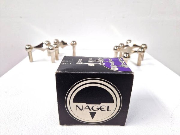 Classic set of stackable Fritz Nagel candlestick holders from the 60s. They just look good anywhere. We are offering this as a set of five. They all have superficial marks and spots but are in great used condition and could be polished to almost brand new. See pictures.