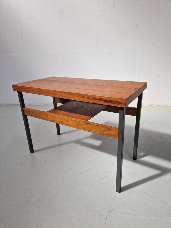 Nice small wall or side table with one tier and a nice top. Made from teak veneer and steel legs in the style of Pastoe around 1960. Could be a bedside too! Great condition, one small repair and superficial wear.