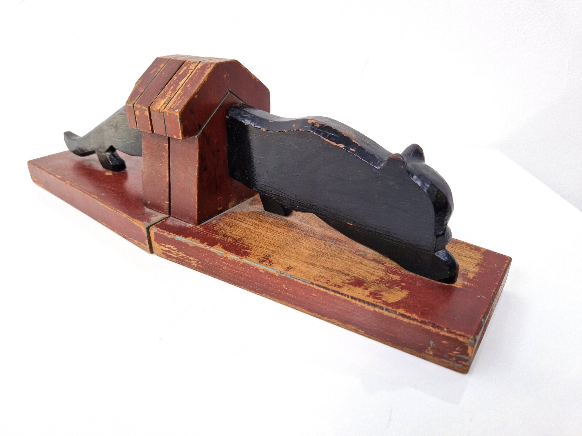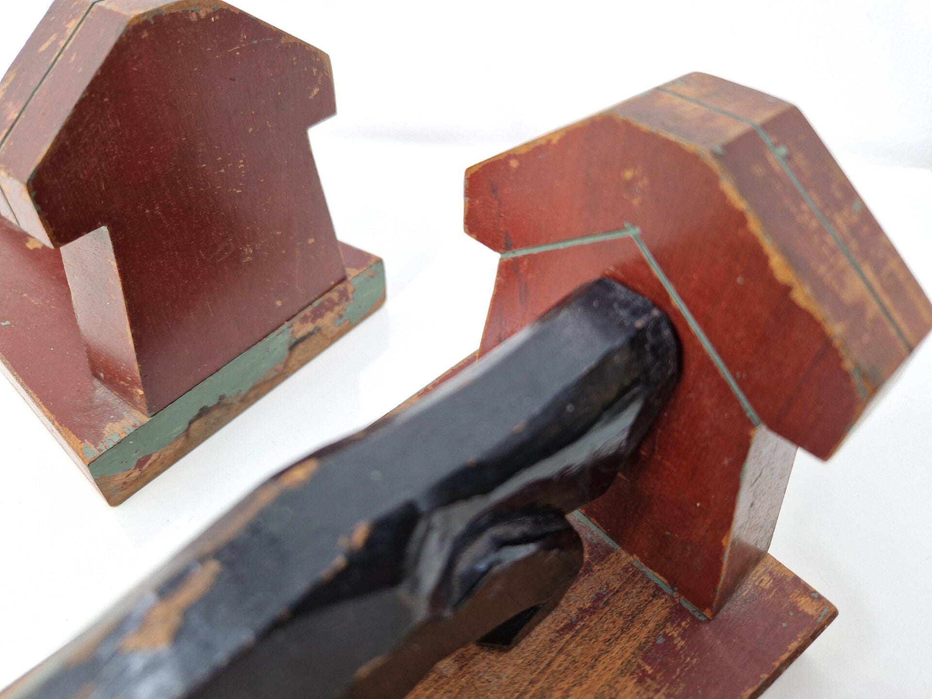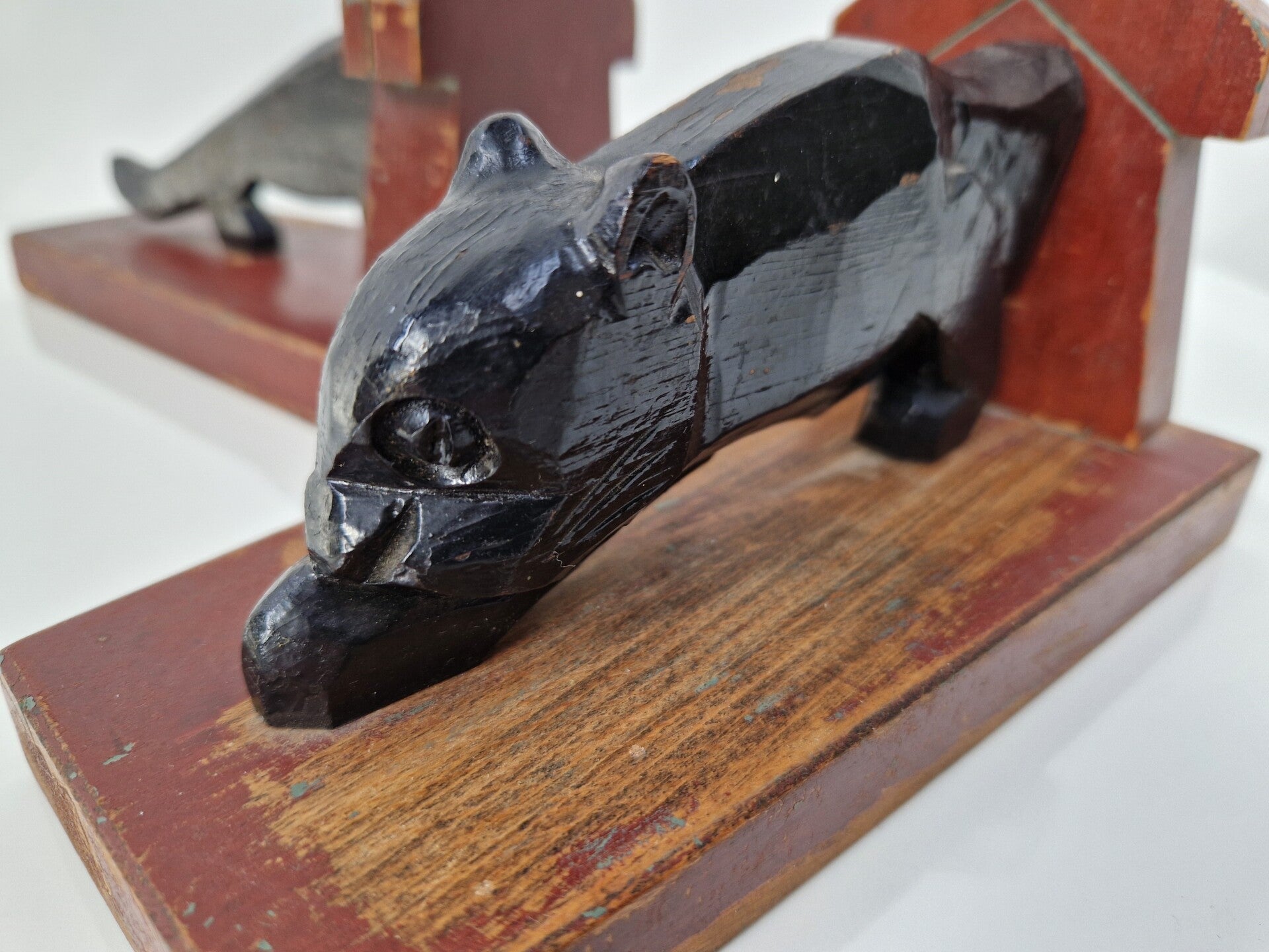 A great set of wooden bookends in the form of a black panther. Great paint patina and completely original. Made in the 1920's in a very appealing naive art deco style.