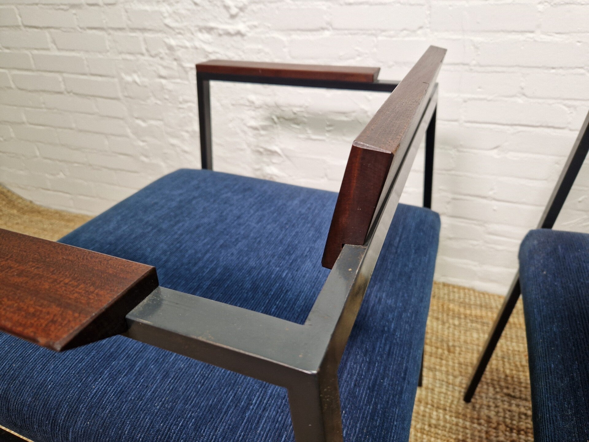 Fantastic pair of mid-century armchears, probably Dutch by design (maybe Gijs van der Sluis) and really good looking with teak accents and good quality blue fabric on the seats. Some minor wear in a few places but all in all in great vintage condition. Modernist all the way!