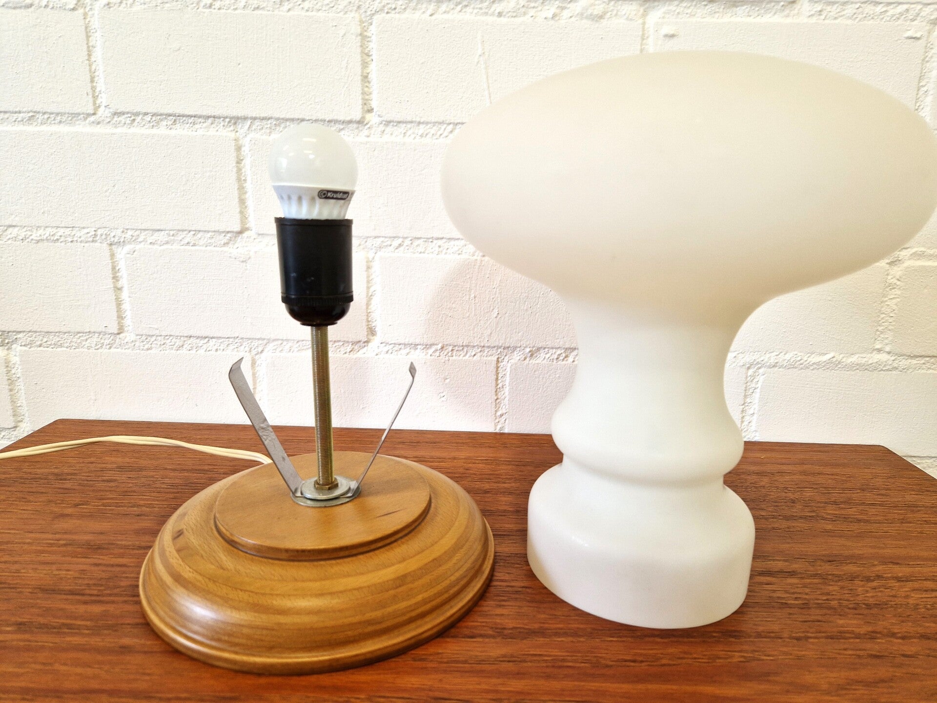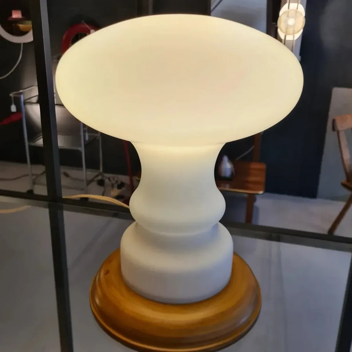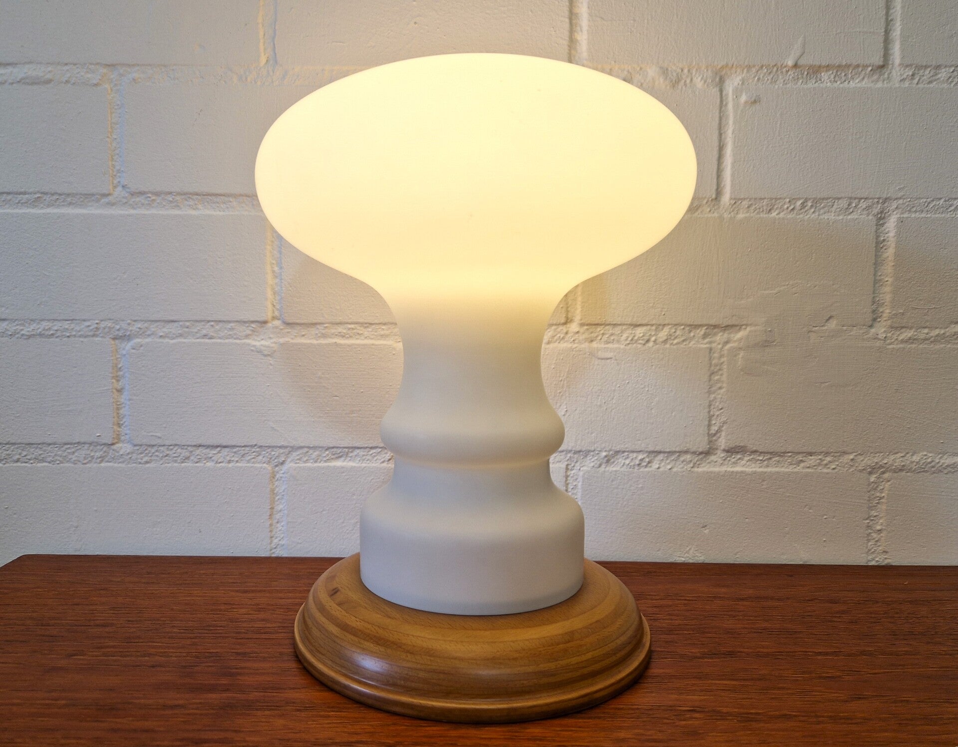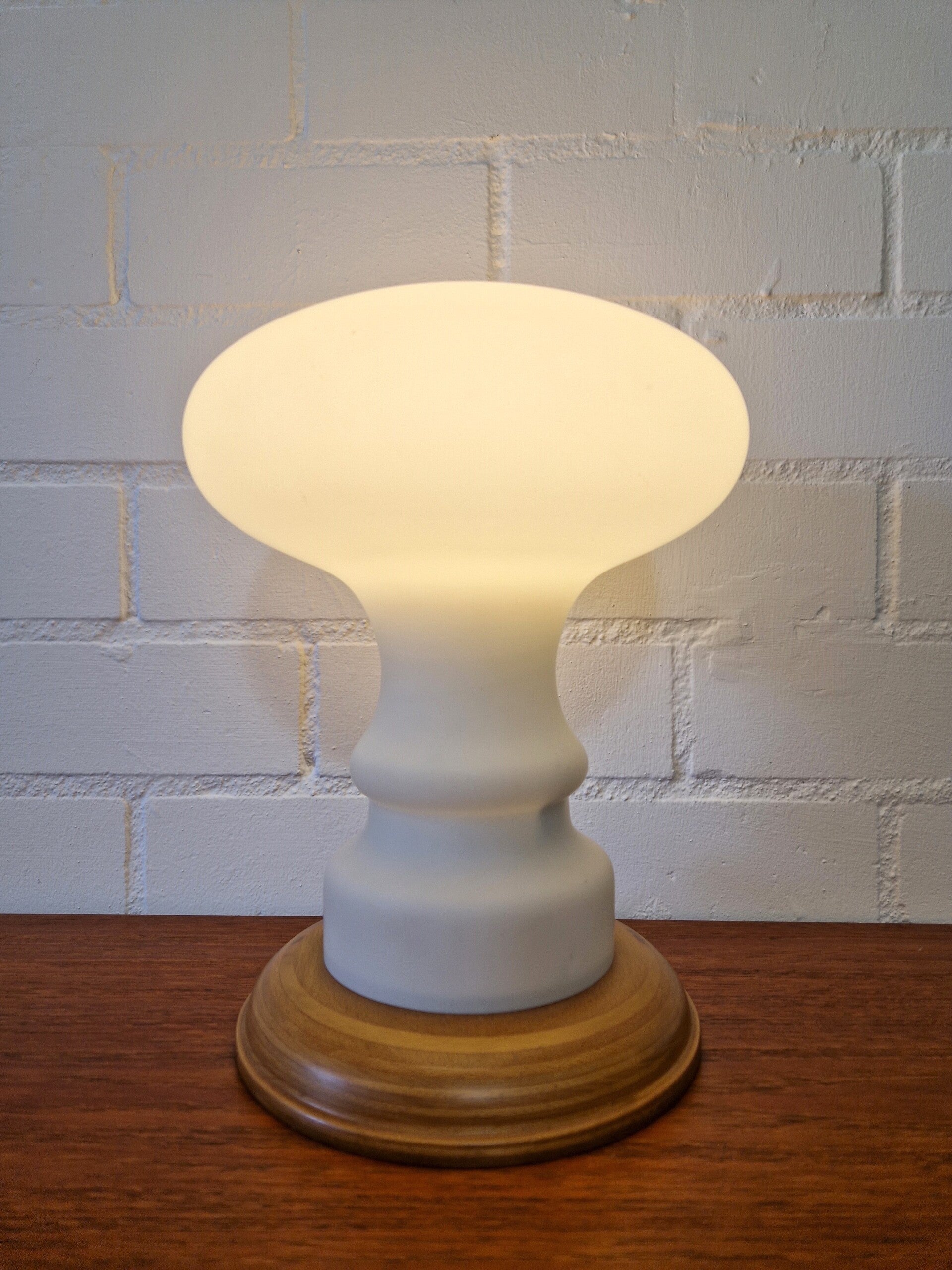 Wonderful opaline glass mushroom light on a wooden base. Probably made in Italy around 1975 and still in amazing condition. Very nice understated lamp but with a good size.