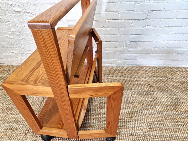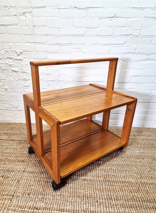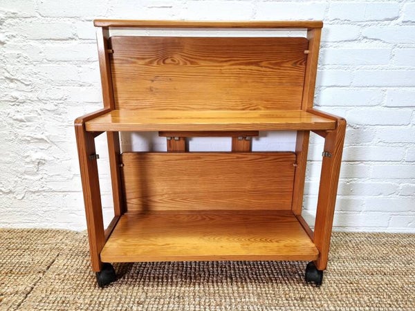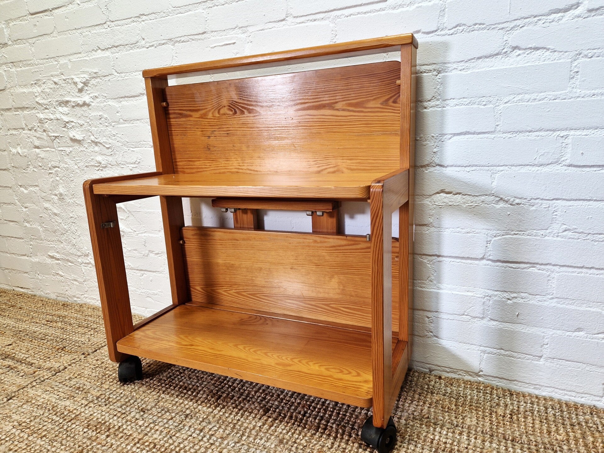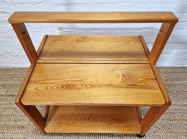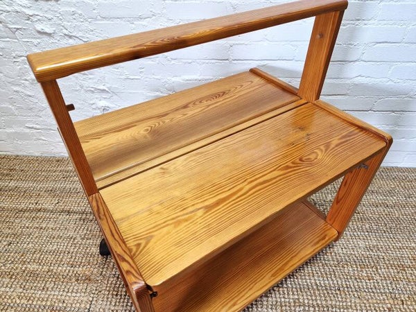 Beautiful pine serving trolley, made in Scandinavia in the 1970s. Can serve as a serving trolley, but can also be folded halfway, making it a cabinet that can be placed against the wall. Beautiful looks and handy too!