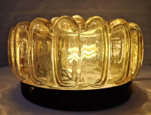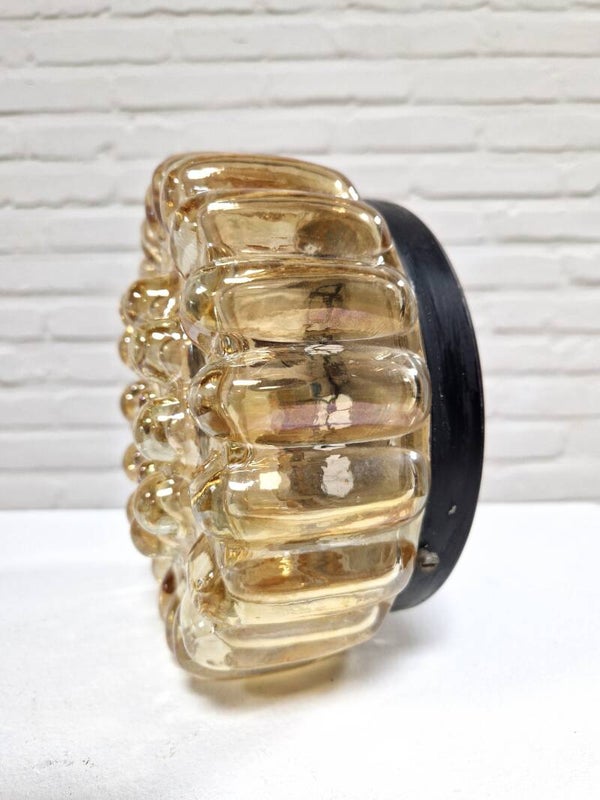 This bubble glass ceiling light screams luxury. A design by or very much in the style of Helena Tynell for Limburg Glashütte. The golden amber hue from this cool lamp will never get boring. Great condition.