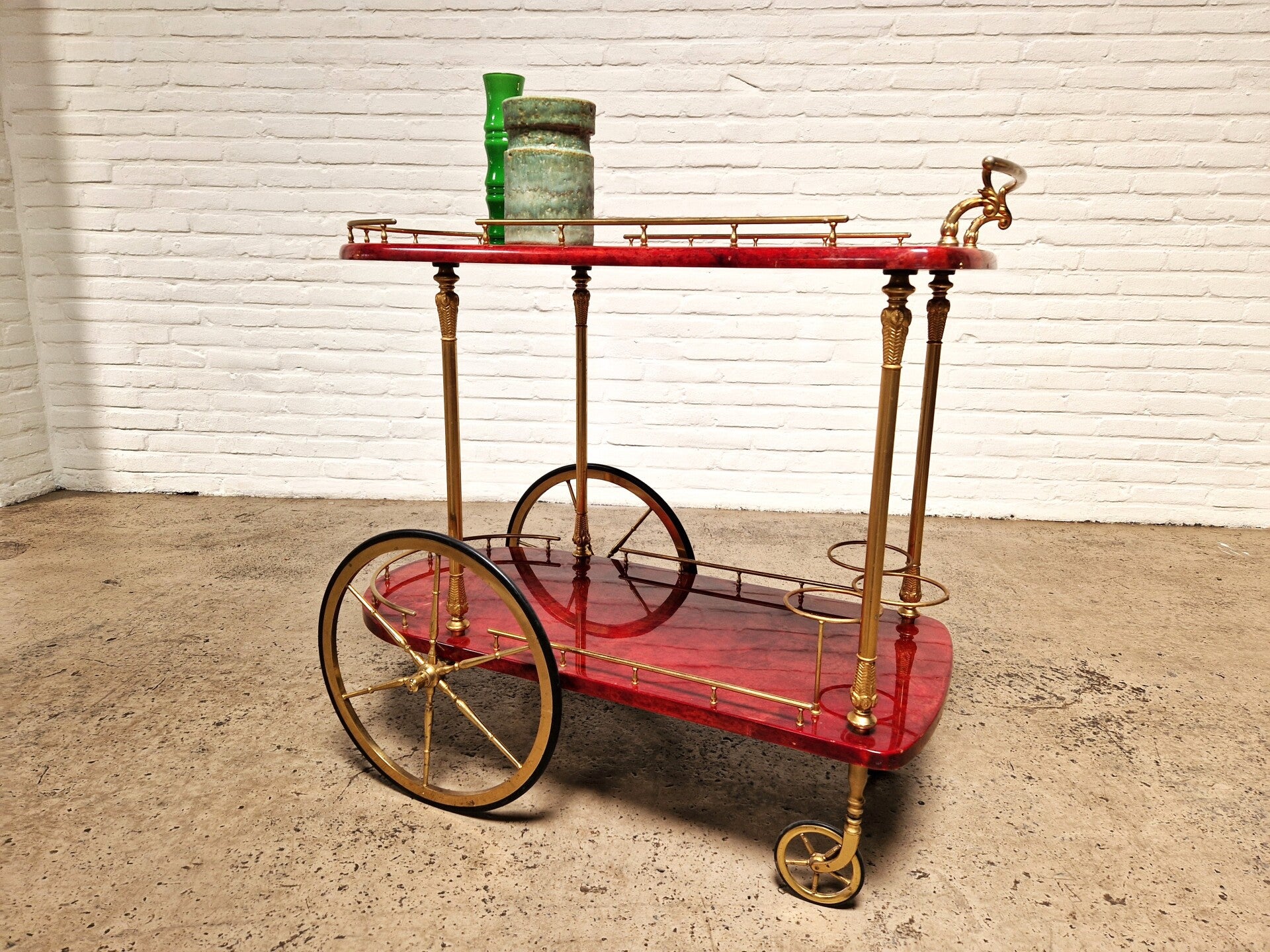 Designer Aldo Tura, like Gio Ponti, belonged to the outer class of mid-century Italian design. Tura is particularly known for his special lacquered goatskin furniture, just like this trolley in red lacquered leather. The trolley is in very nice condition, only missing a carrier for the bottle holder (see photo).