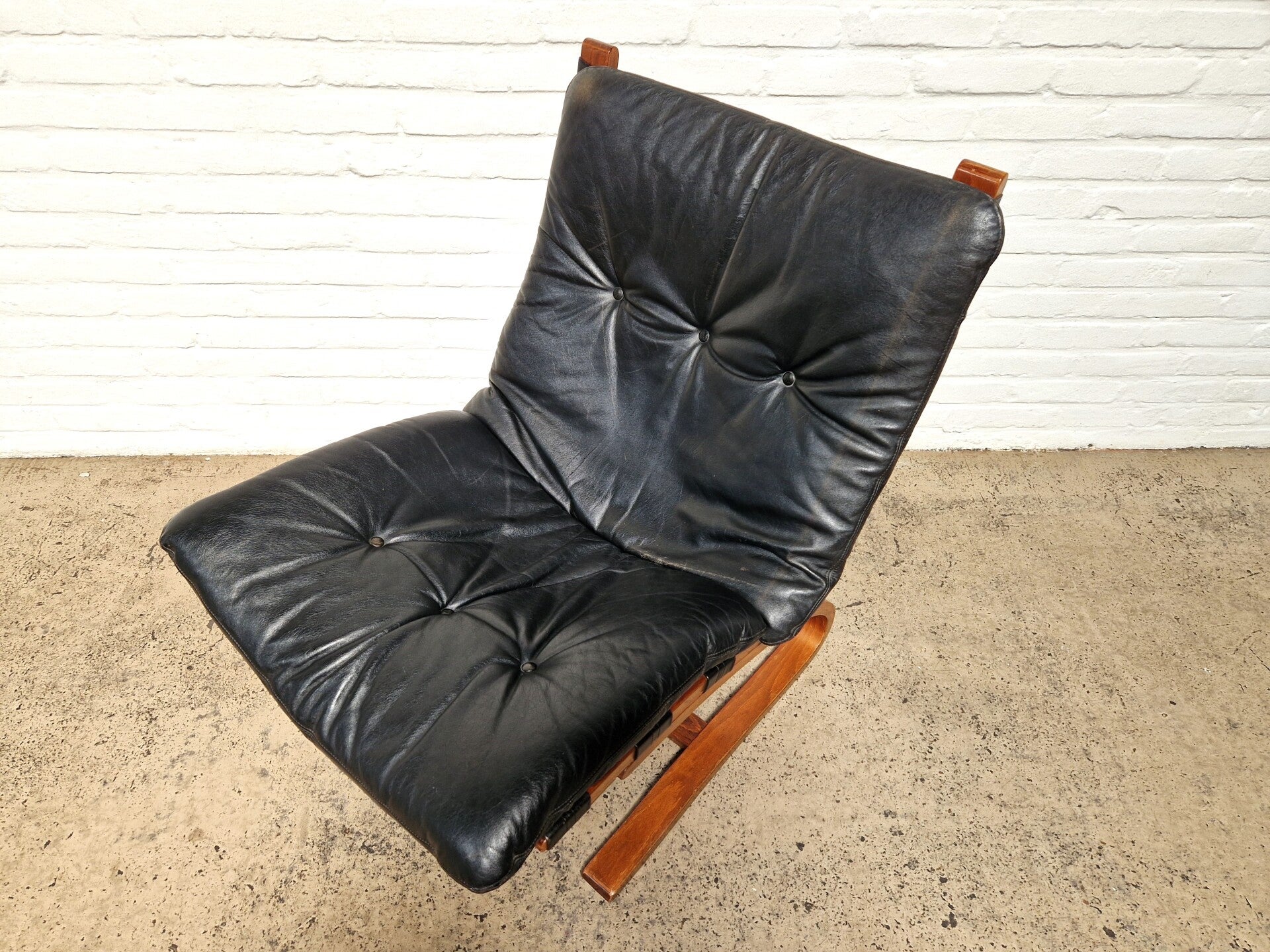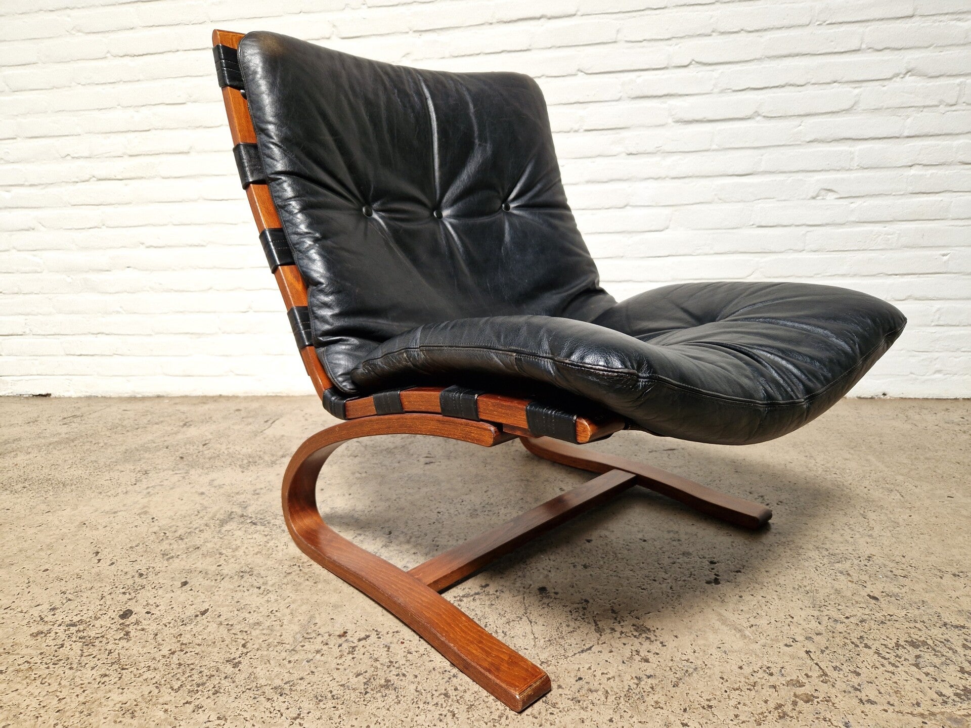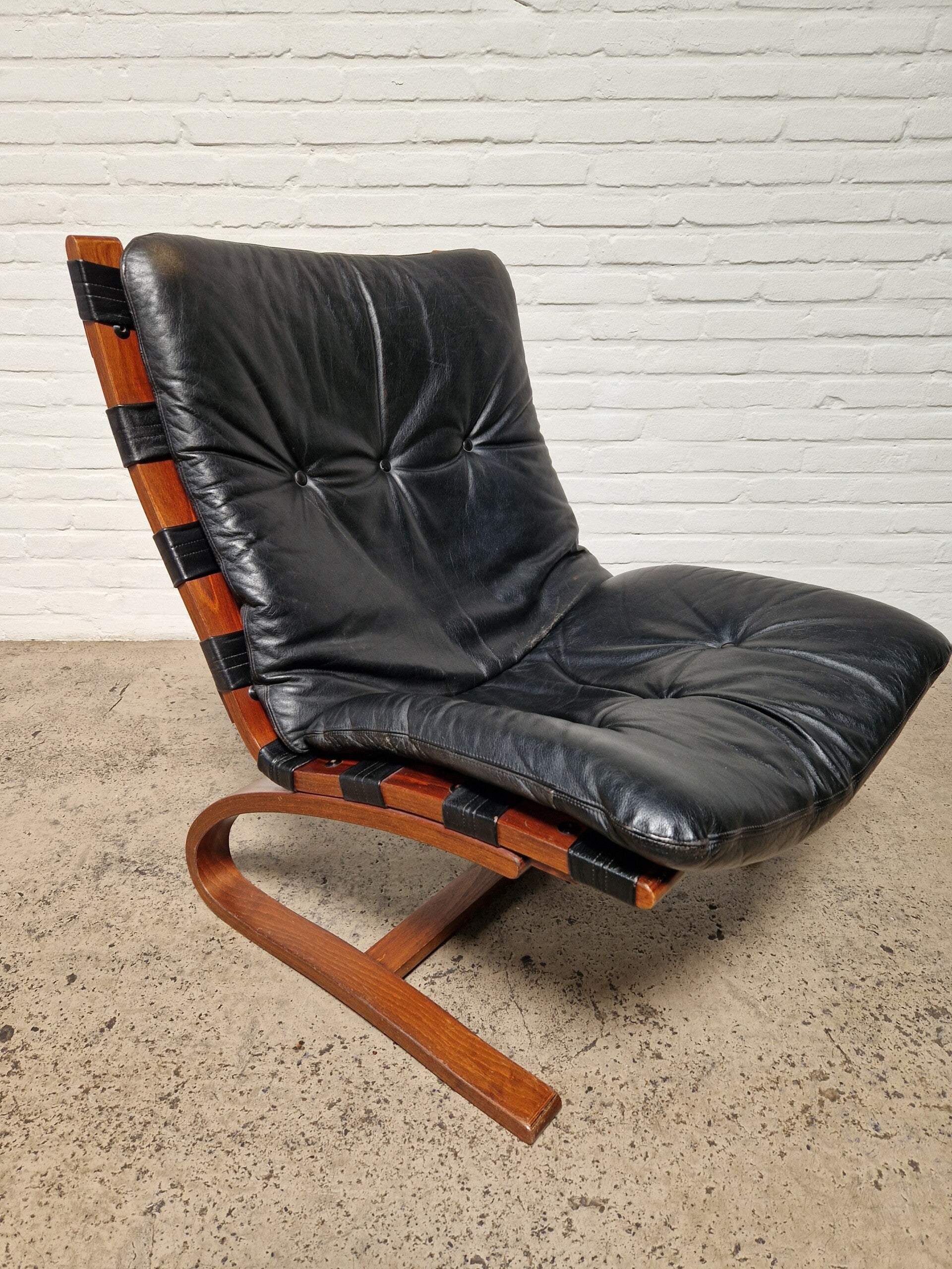 The Kengu chair, crafted by designers Elsa and Nordal Solheim, was manufactured by Rybo (Rykken & Co) in Norway. It is a great and comfortable lounge chair, boasting a sling design, luxurious leather upholstery, and a distinctive cantilevered frame.