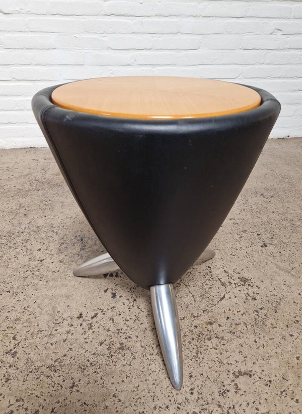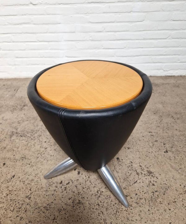 Beautiful table by designer Hugo de Ruiter for Leolux from the 90s. The table has 3 steel legs and a light-coloured wooden top. The outside is covered with sturdy black leather. The table is nice and heavy and therefore always remains stable. Good condition with some light signs of use on the leather and steel.
