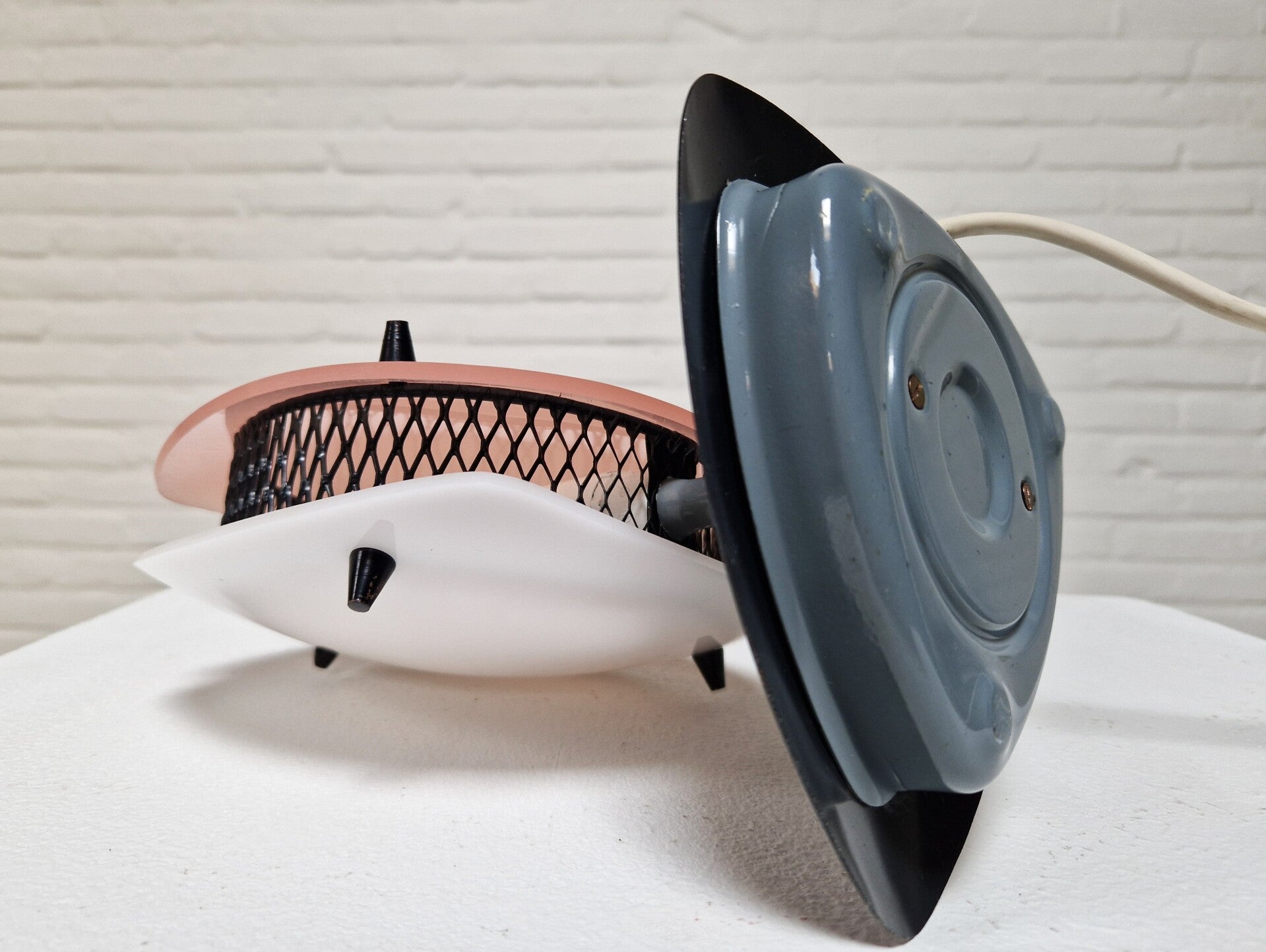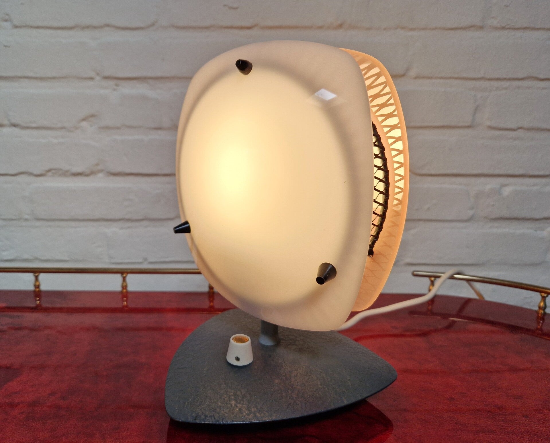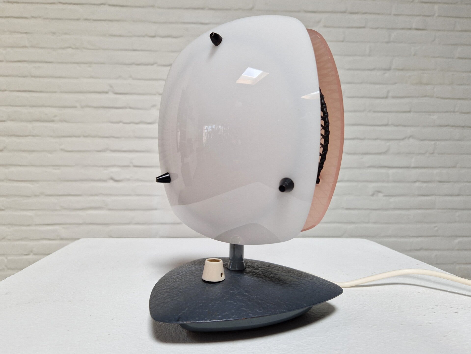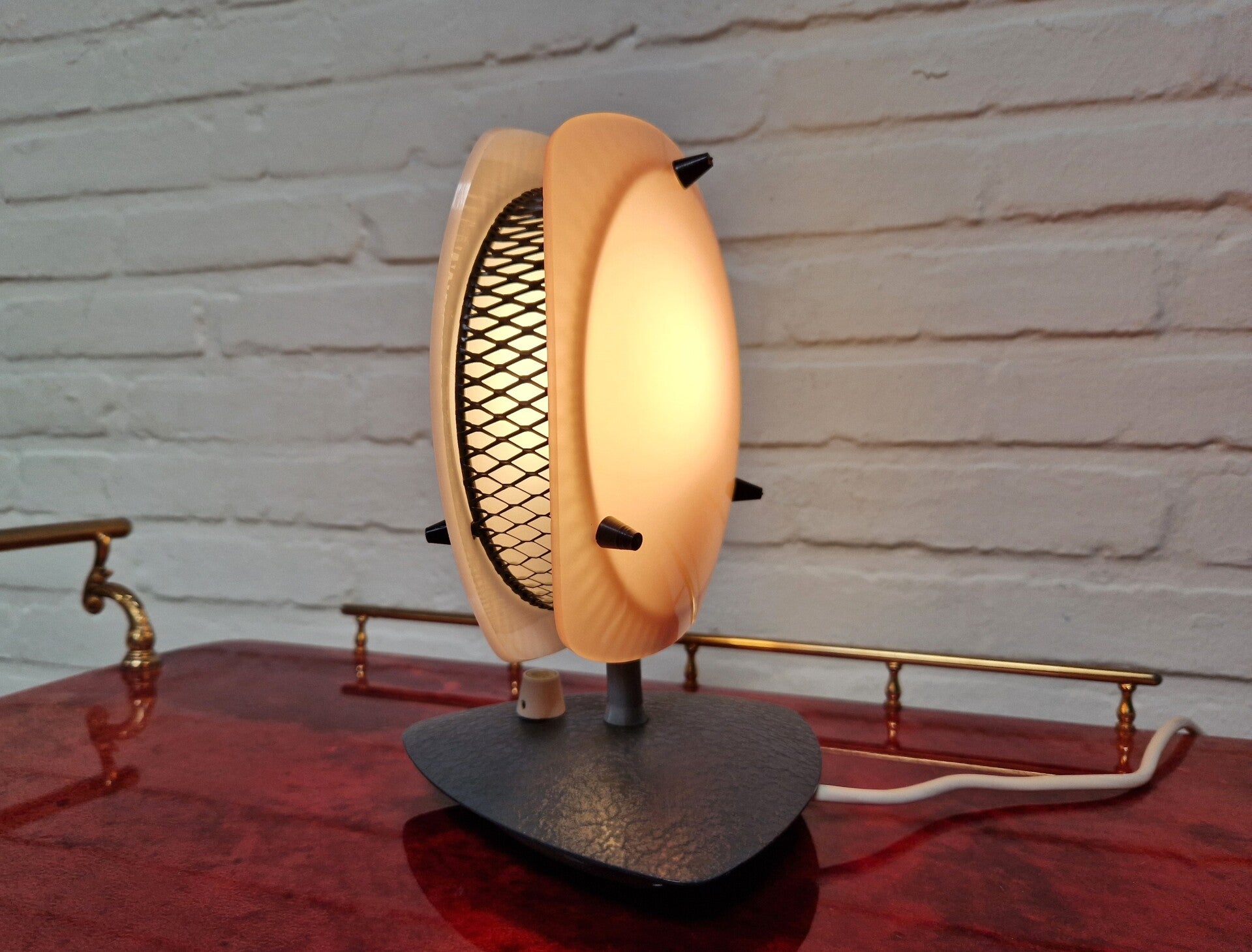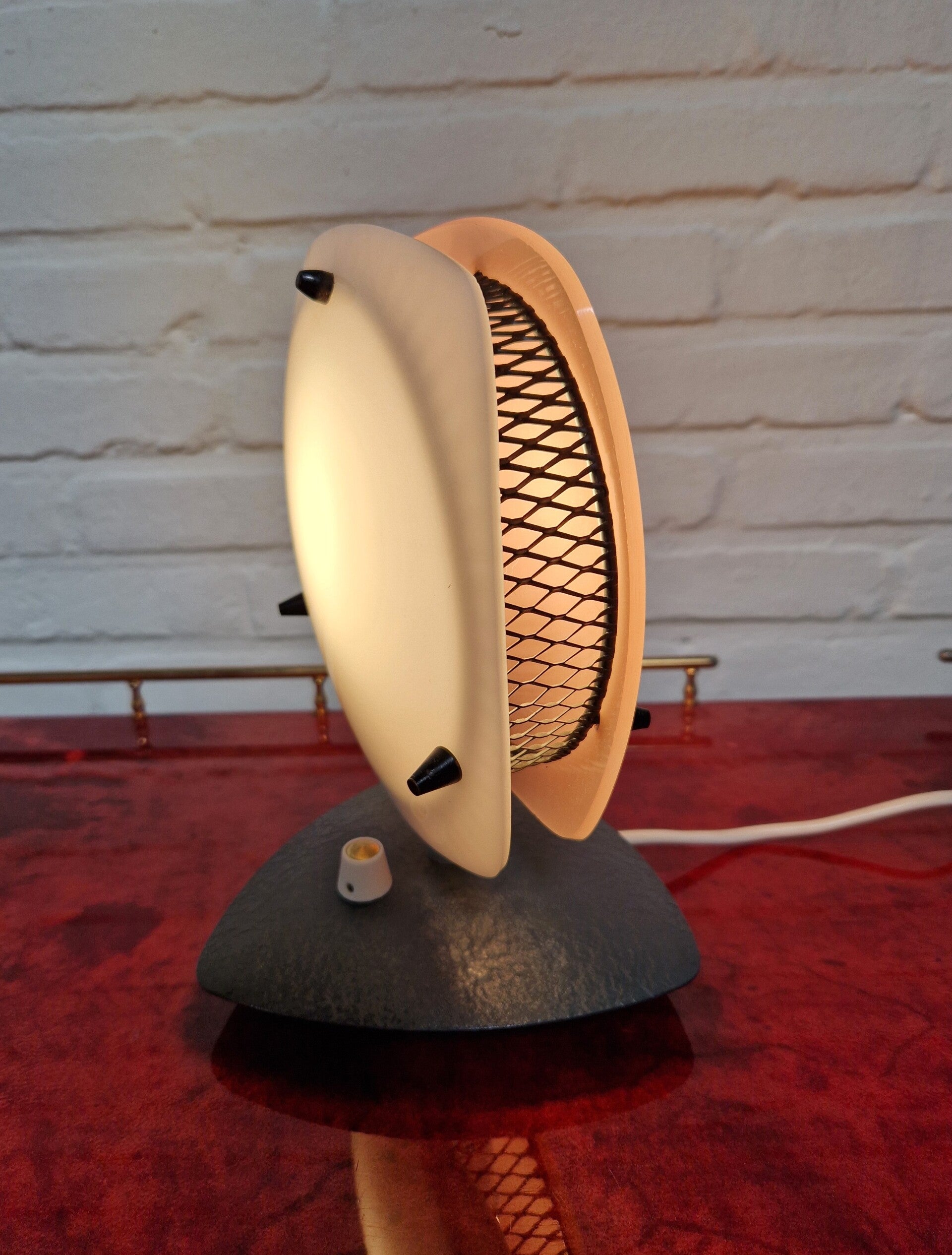 Amazing desk light by Télé-Ambiance France. This model was sold in France and Germany (Sonnenkind) around 1958 and 1962. It has two plastic shades (white and pink) and a metal grille in between. It also has a stepped dim function via the knob on the metal base, although not as smooth as modern lights. The lamp is in incredible condition for its age, hardly any signs of use. A real stunner!