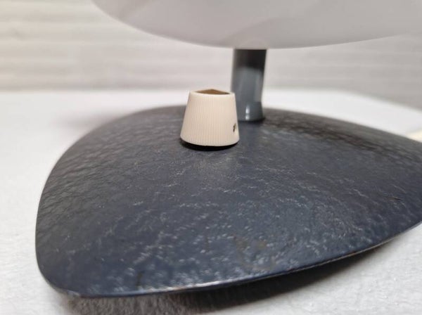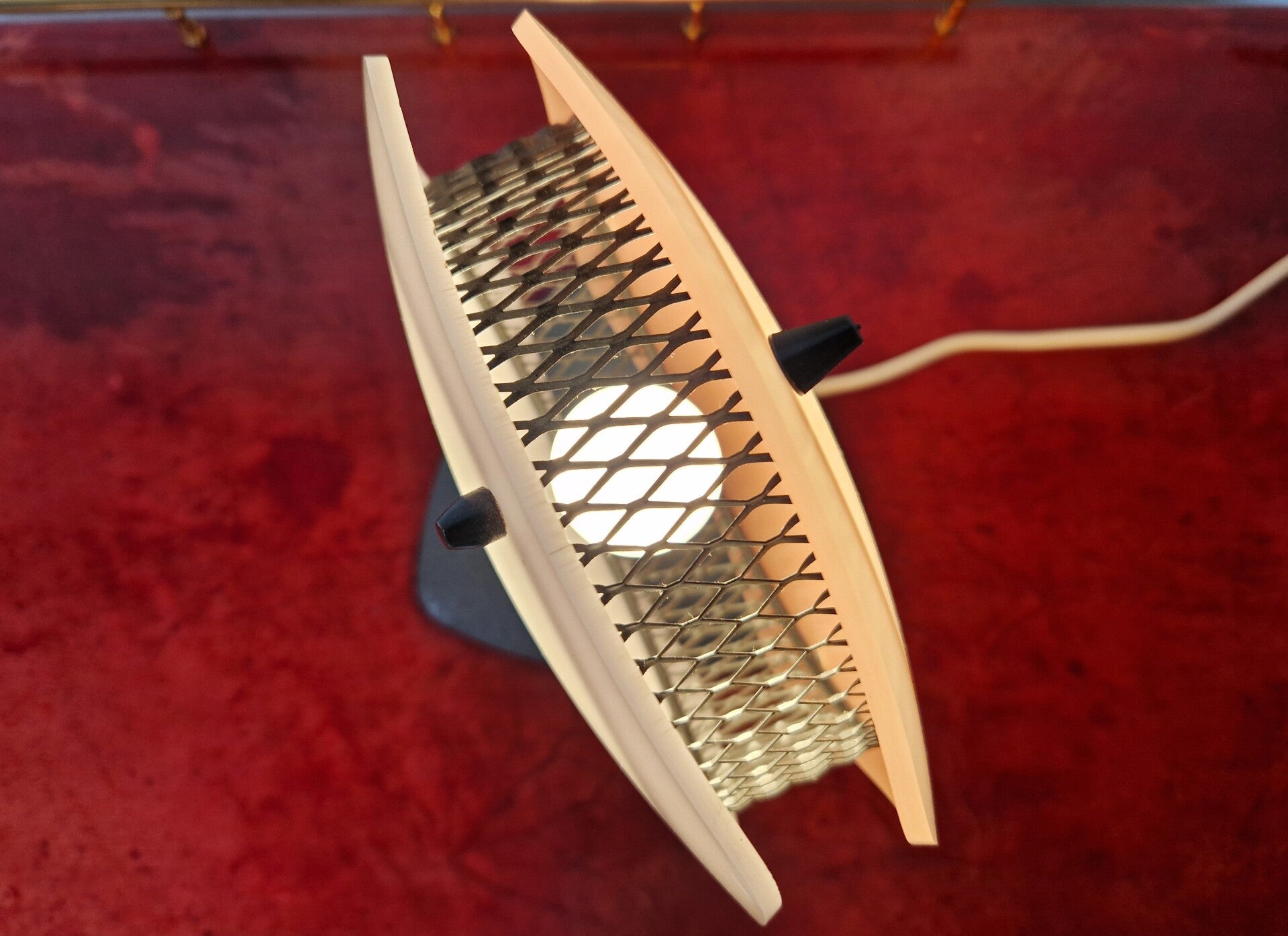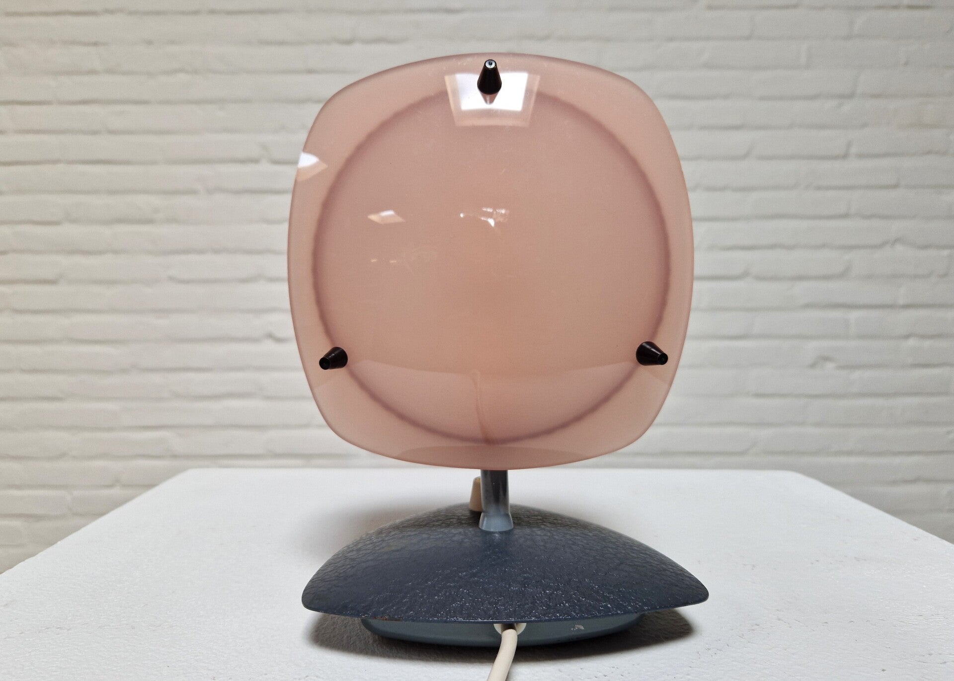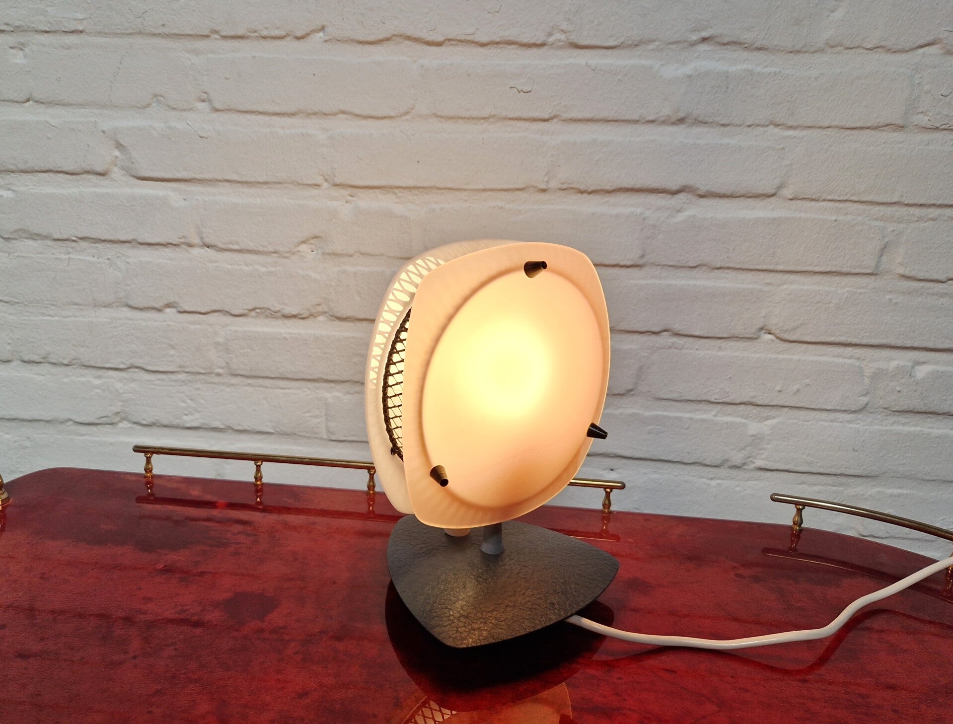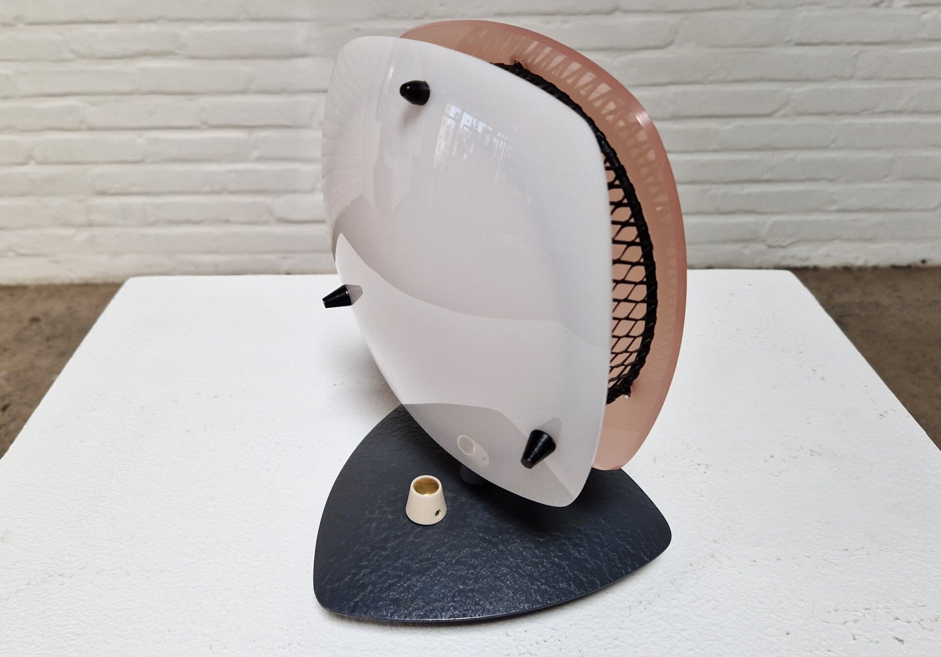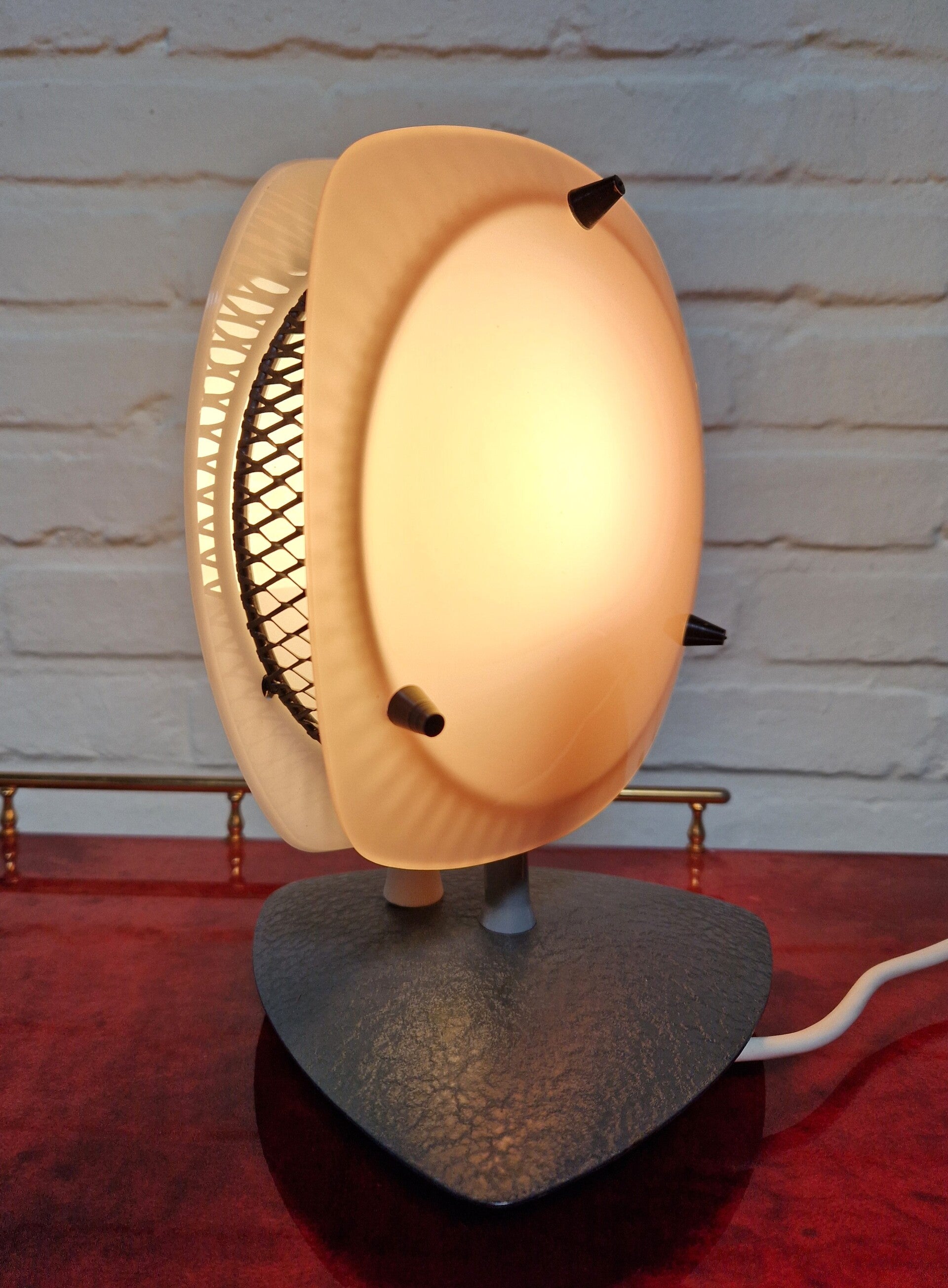 Amazing desk light by Télé-Ambiance France. This model was sold in France and Germany (Sonnenkind) around 1958 and 1962. It has two plastic shades (white and pink) and a metal grille in between. It also has a stepped dim function via the knob on the metal base, although not as smooth as modern lights. The lamp is in incredible condition for its age, hardly any signs of use. A real stunner!