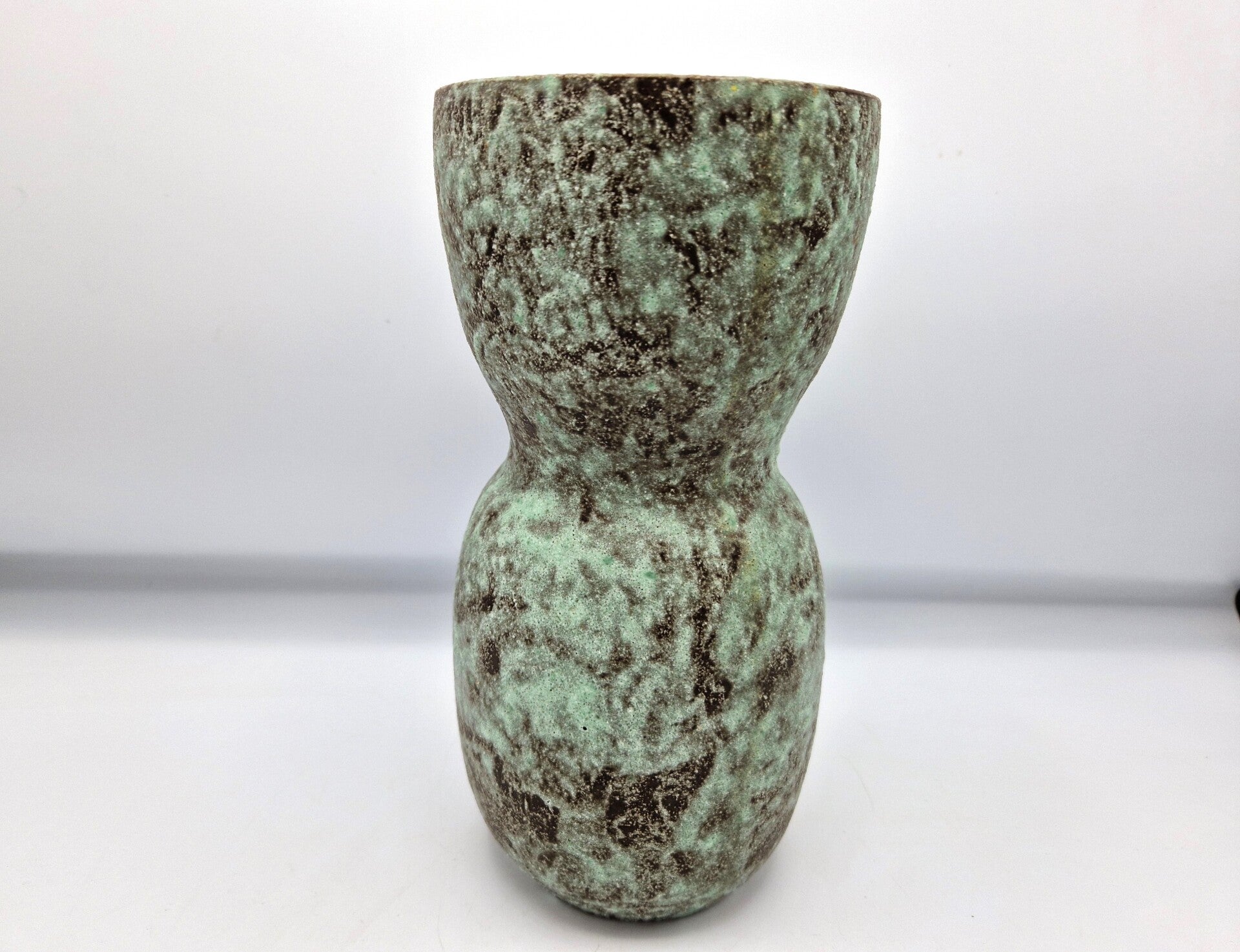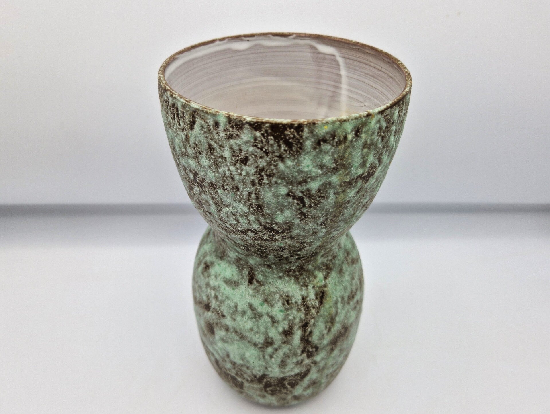 This is an extremely thin and well made ceramic vessel. The vase has a green on brown textured glaze and a white interior. We could not ID the maker, but it is definately Dutch and made in the 1960s. Great condition.