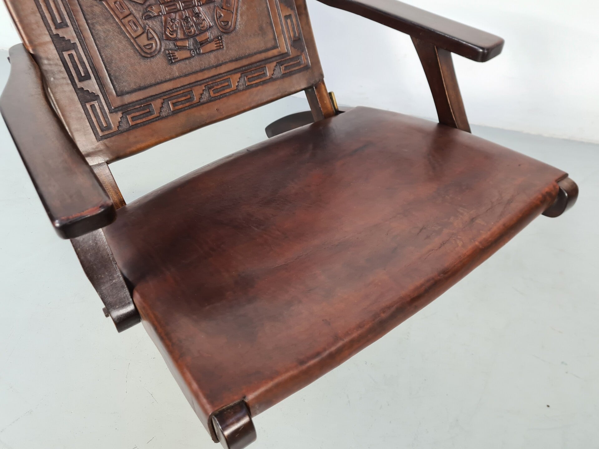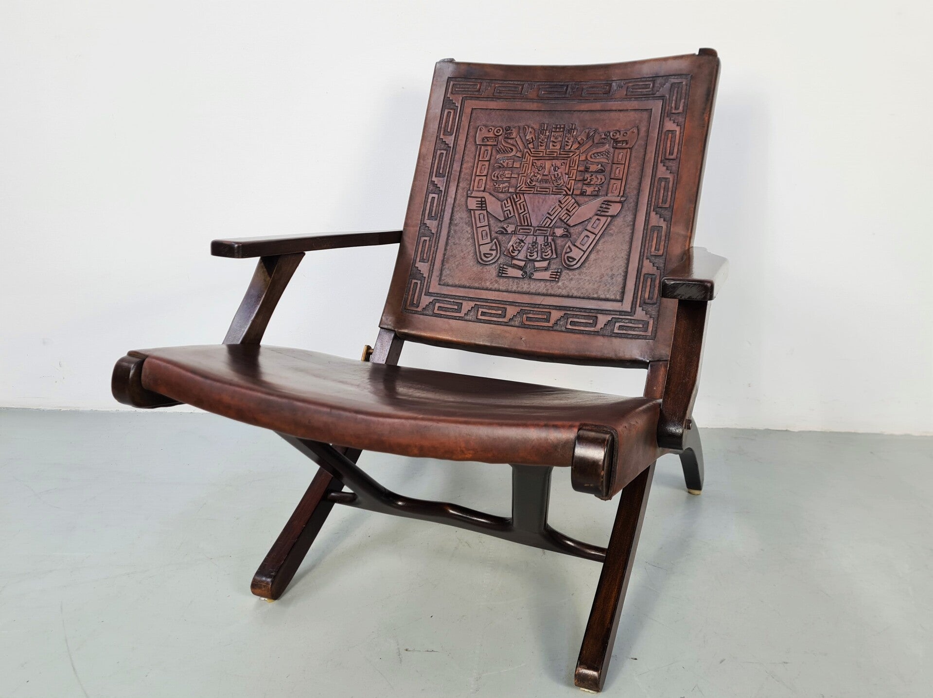 This beautiful folding chair made of leather and wood and with a beautiful decoration of Inca symbols on the backrest is designed by Angel Pazmino (Ecuador) from the 1960s for Muebles de Estilo. The chair is still completely sturdy and in beautiful vintage condition.