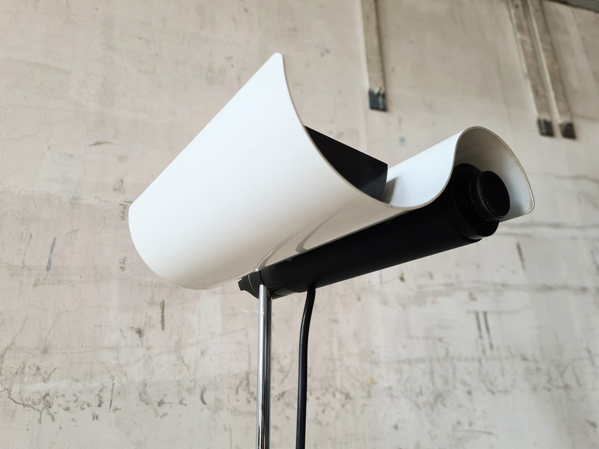 This tall halogen/LED floor lamp model Dim 333 was designed by Vico Magistretti in the 1970s and produced by Oluce in 1975. It was fabricated in Italy and made of chromed metal, aluminum, and white and black steel. Like the name suggests, this lamp is dimmable with the round knob on the side of the 'head'. Great vintage condition and working order.
