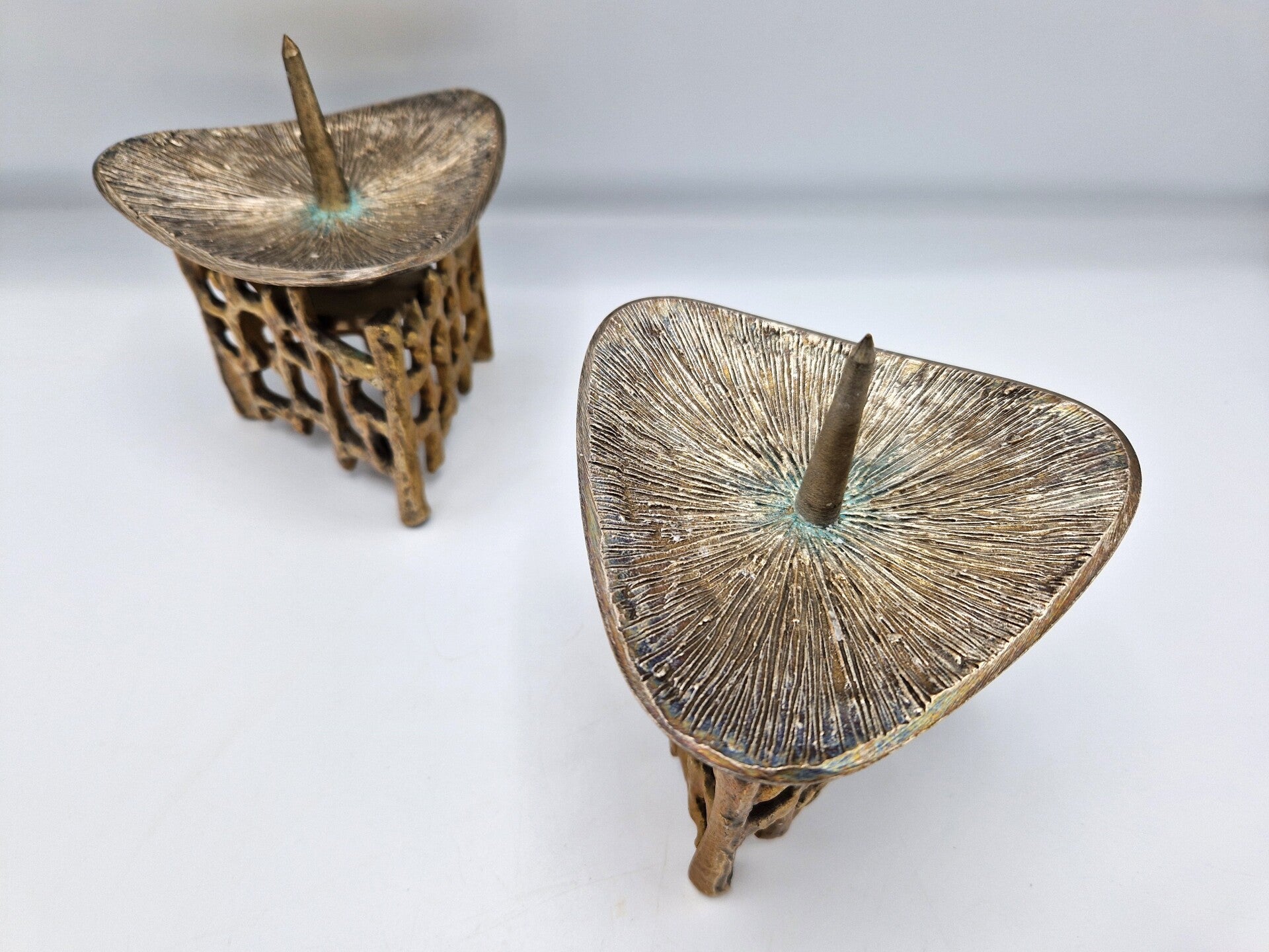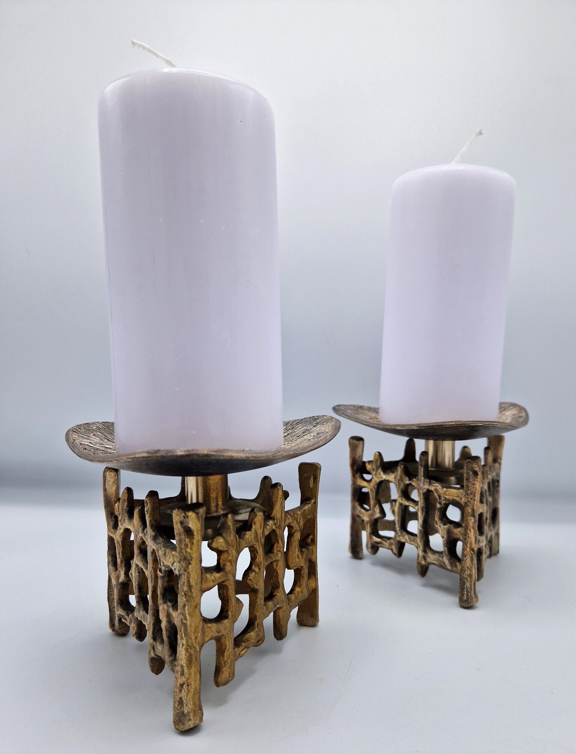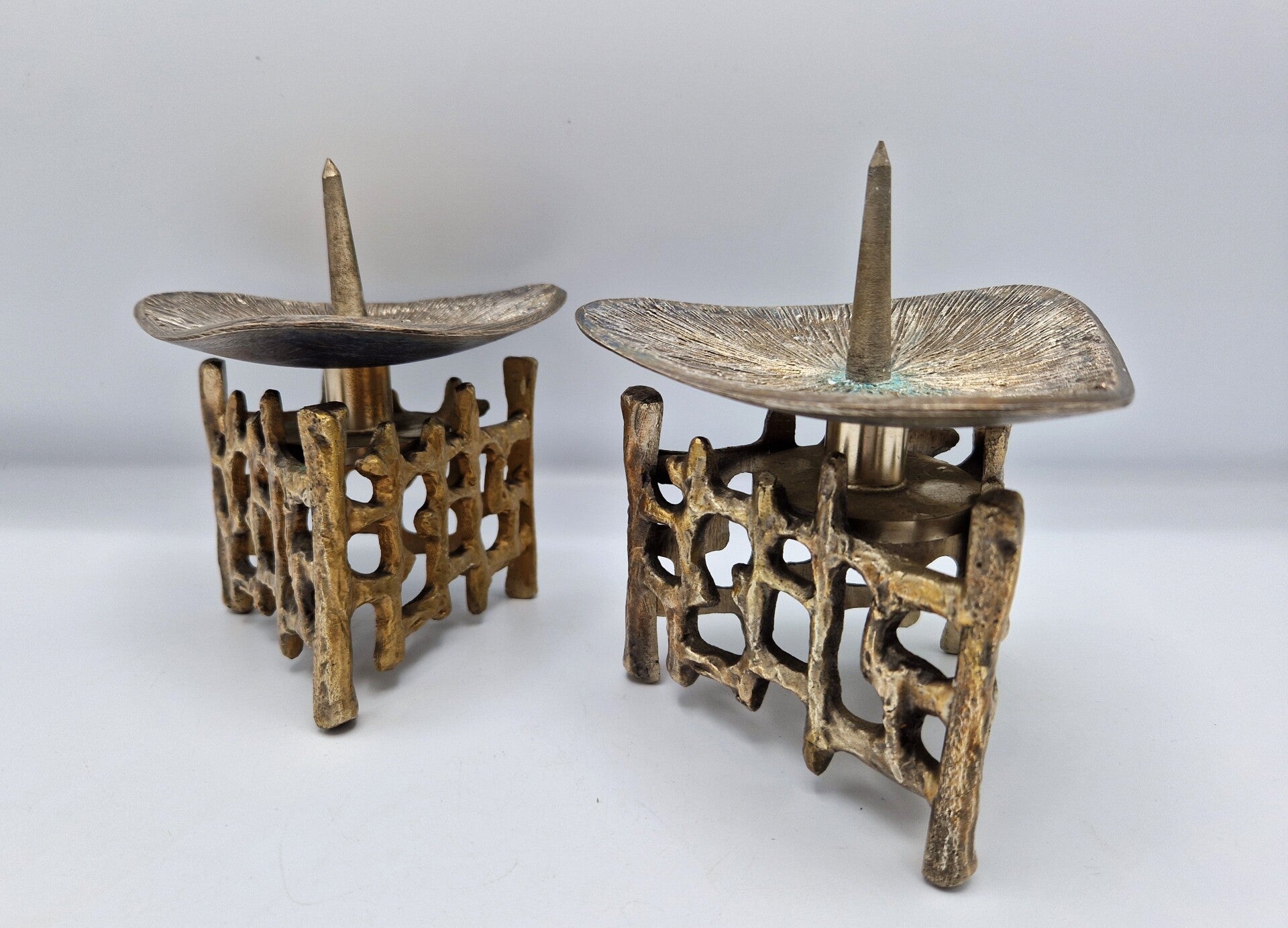 Stunning pair of mid-century candle holders in a style that is often called brutalist. These two metal with brass table pieces have been salvaged from an abonded church in Belgium and are looking for a new table. Great condition and patina. We sell without candles.