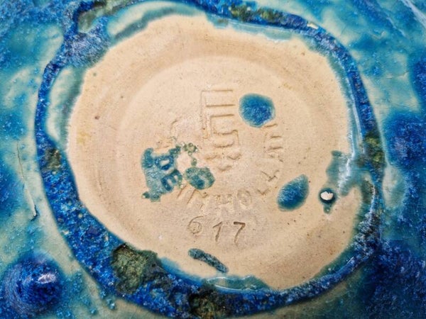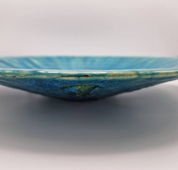 Beautiful large bowl in turquoise and blue by the Dutch ceramist Pieter Groeneveldt. The bowl has a glass-like glaze, characteristic of Groeneveldt's 1960s pieces. Beautiful condition, some firing errors and accumulated glaze on the back that give the bowl a beautiful handmade character. The bowl hung on a wall as a decorative plate for many years.