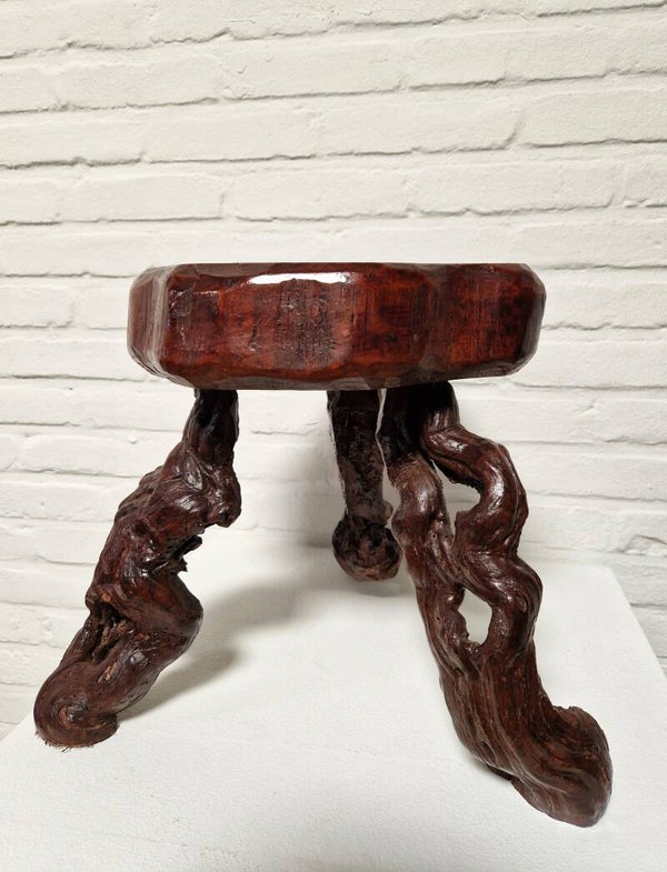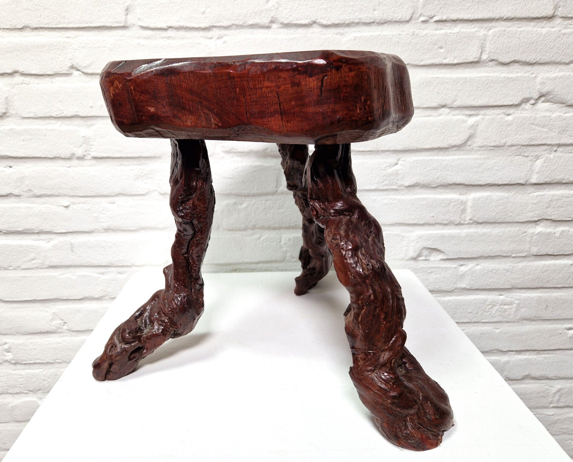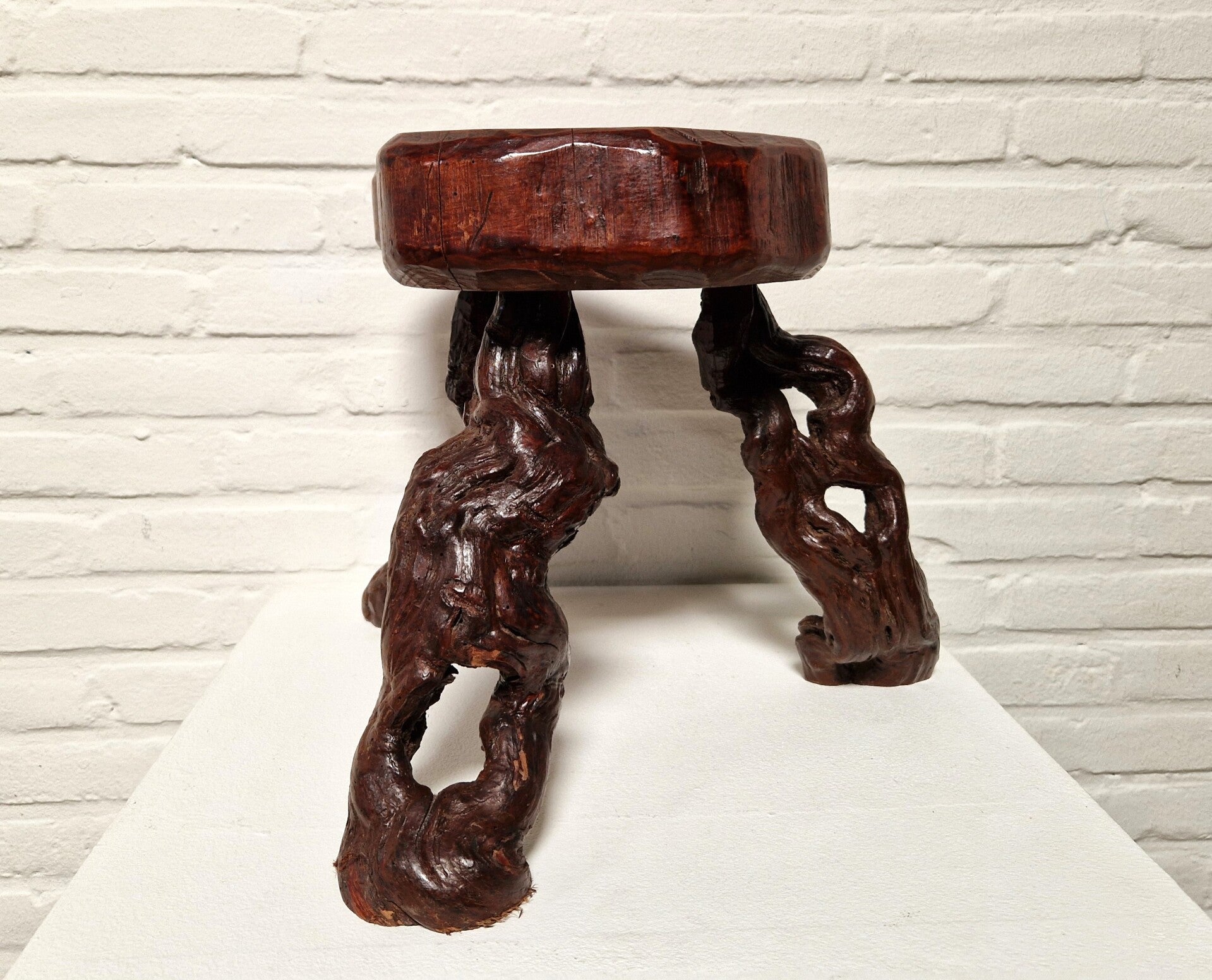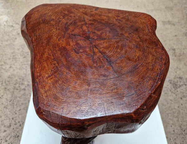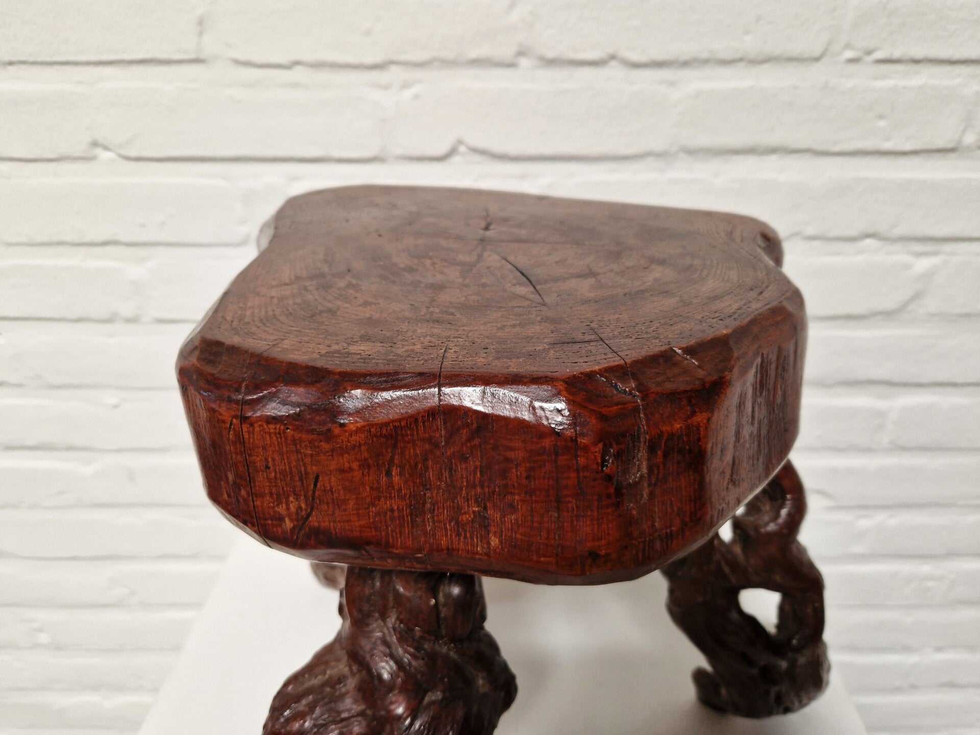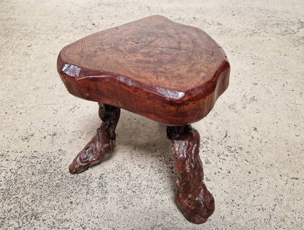 Beautiful tree trunk stool or little side table in dark stained wood. Nice and chunky and organic feel. Looks great in a modernist or modern living room. A few old woodworm holes, but they have now all left.