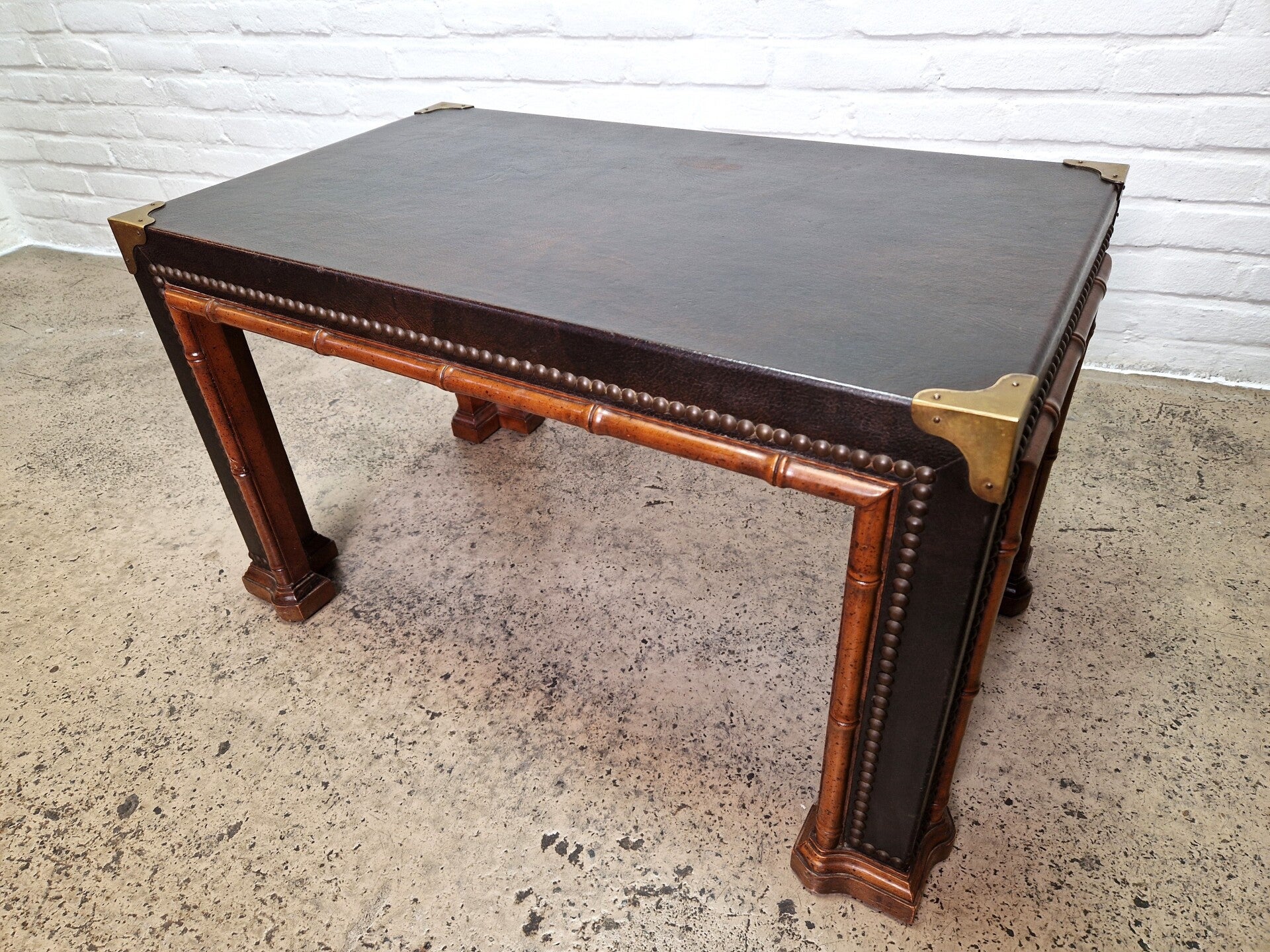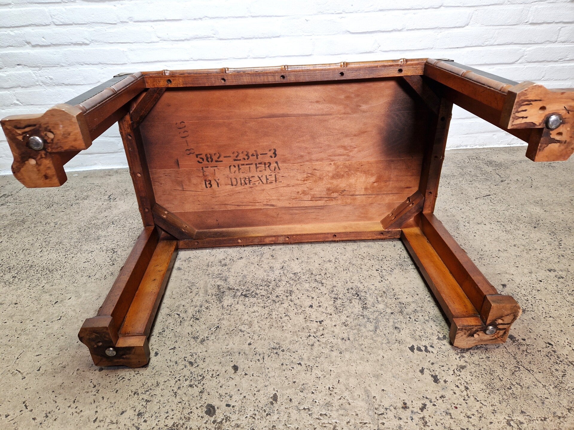 Very decorative table in the Et Cetera series from the American company Drexel, made in the 1960s. The table has a leather and faux bamboo (Chinoiserie) finish and has a beautiful patina. Of course with light signs of wear. Can serve as a coffee table or side table.