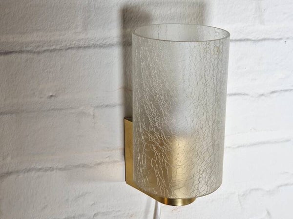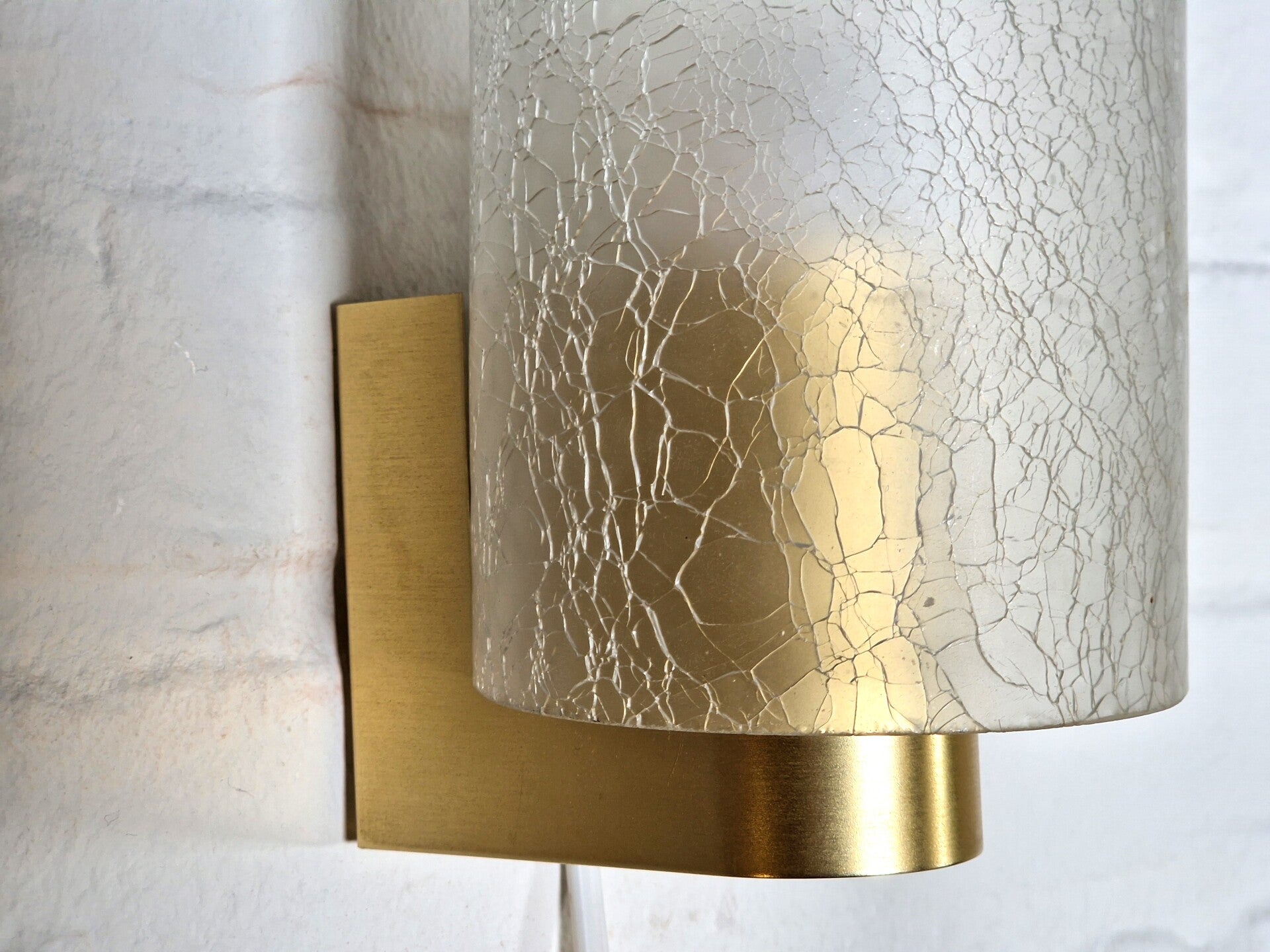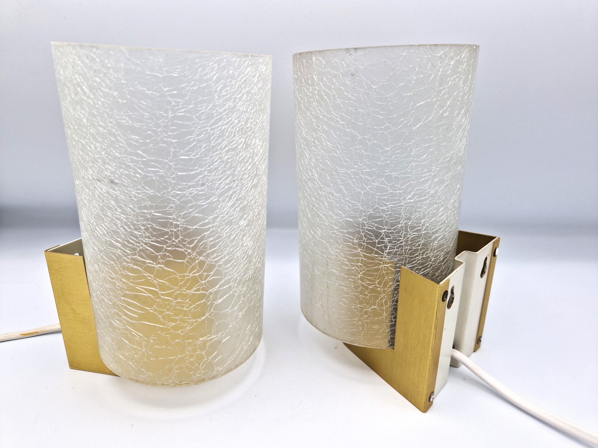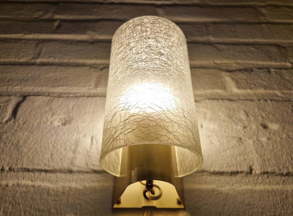 Amazing set of wall lights, sold by Philips in the 1960s. The have a golden metal base that screws to the wall and crackled glass cilinders that are put on the base. The hue is very warm due to the glass and golden accents. Both are in fantastic vintage condition. One glass cilinder is slightly thicker but both lamps are 100% original and undamaged.