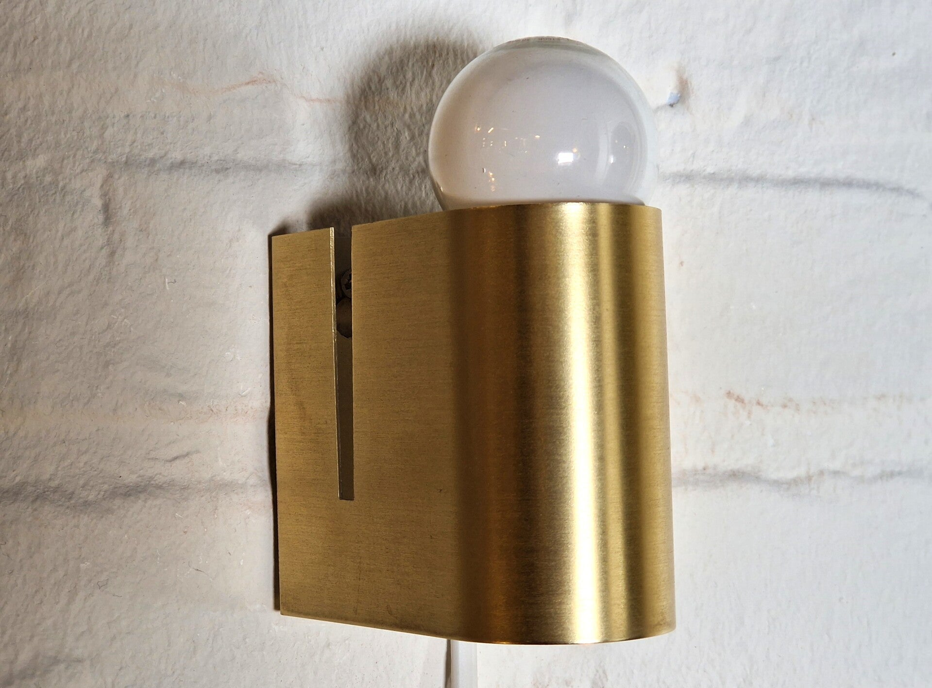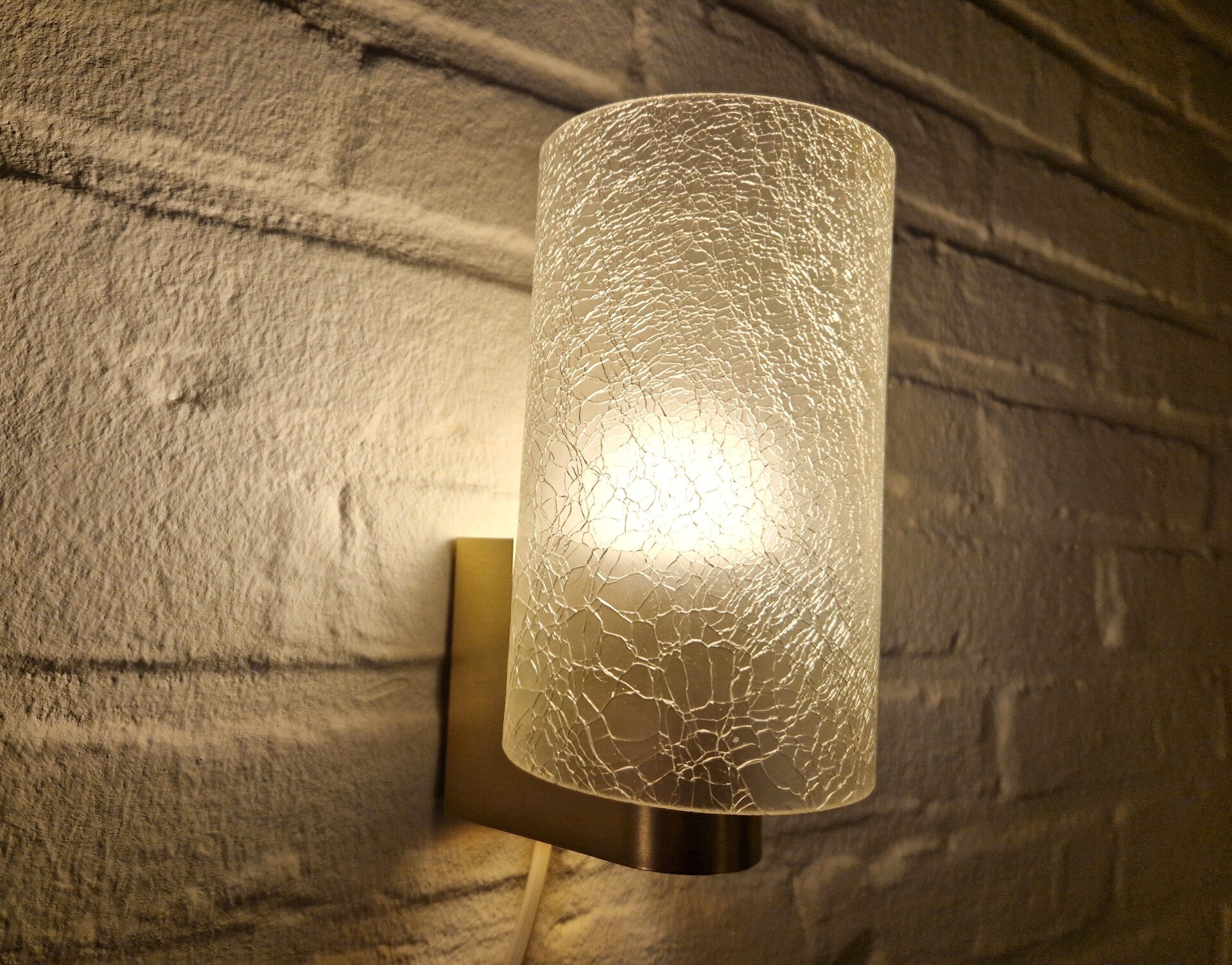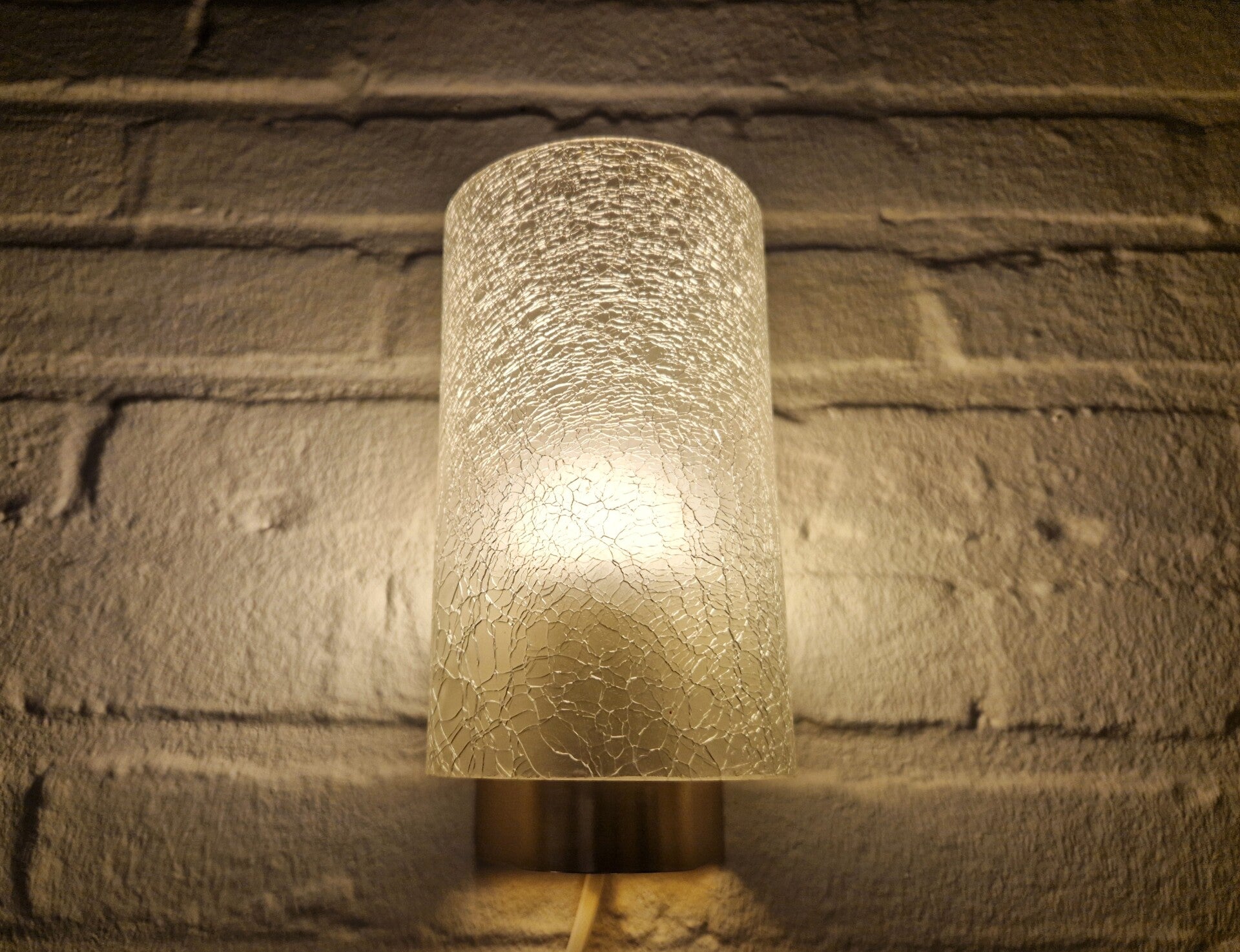 Amazing set of wall lights, sold by Philips in the 1960s. The have a golden metal base that screws to the wall and crackled glass cilinders that are put on the base. The hue is very warm due to the glass and golden accents. Both are in fantastic vintage condition. One glass cilinder is slightly thicker but both lamps are 100% original and undamaged.