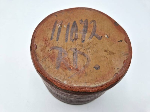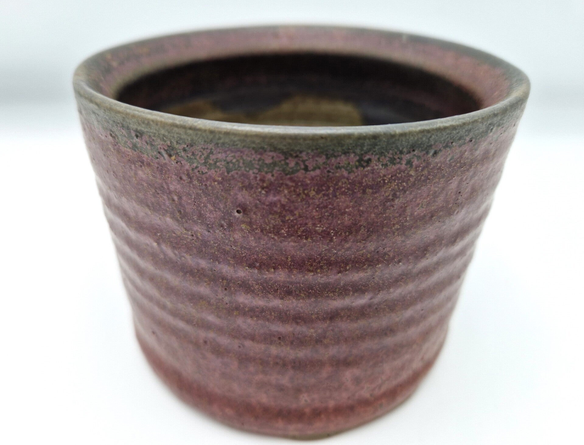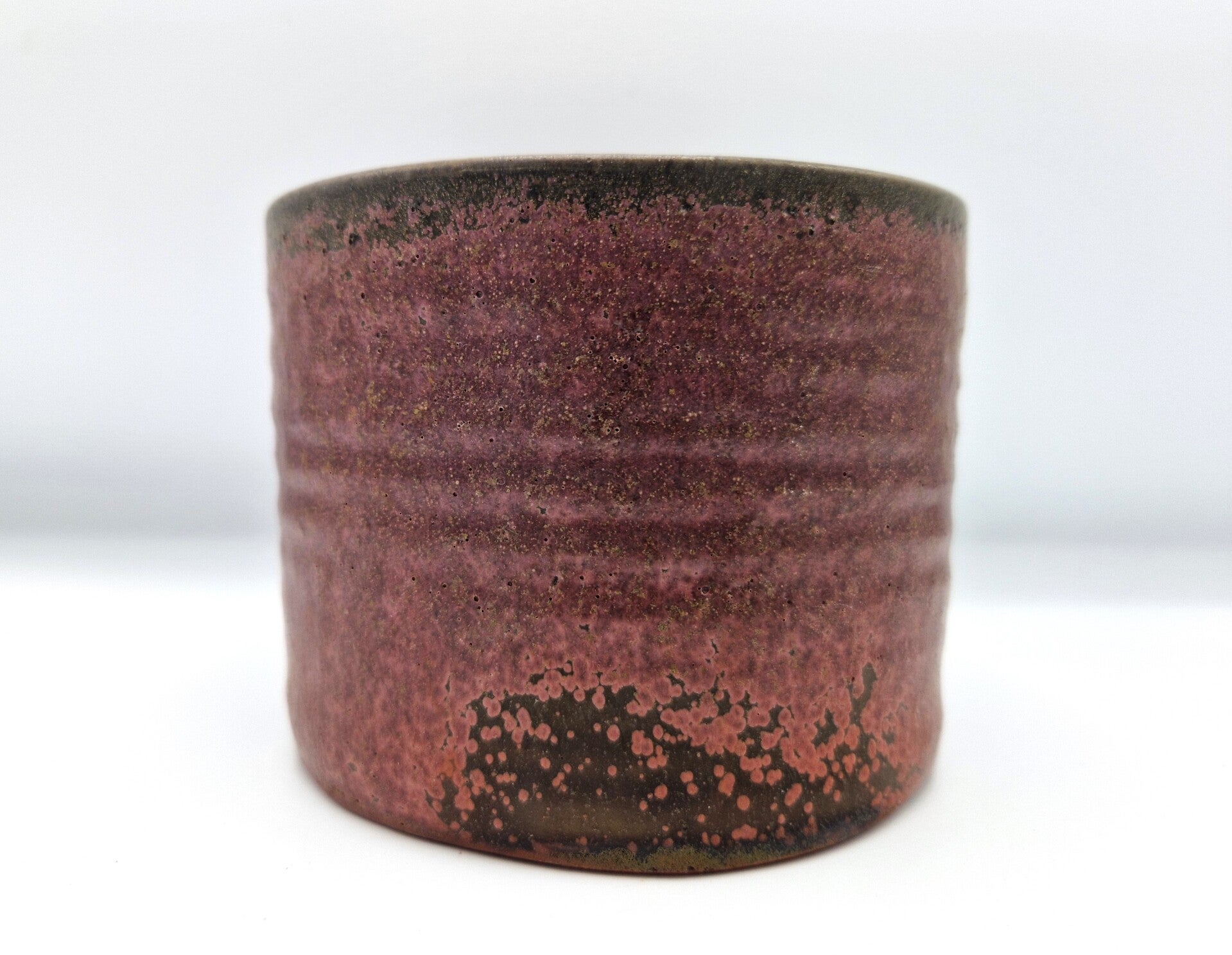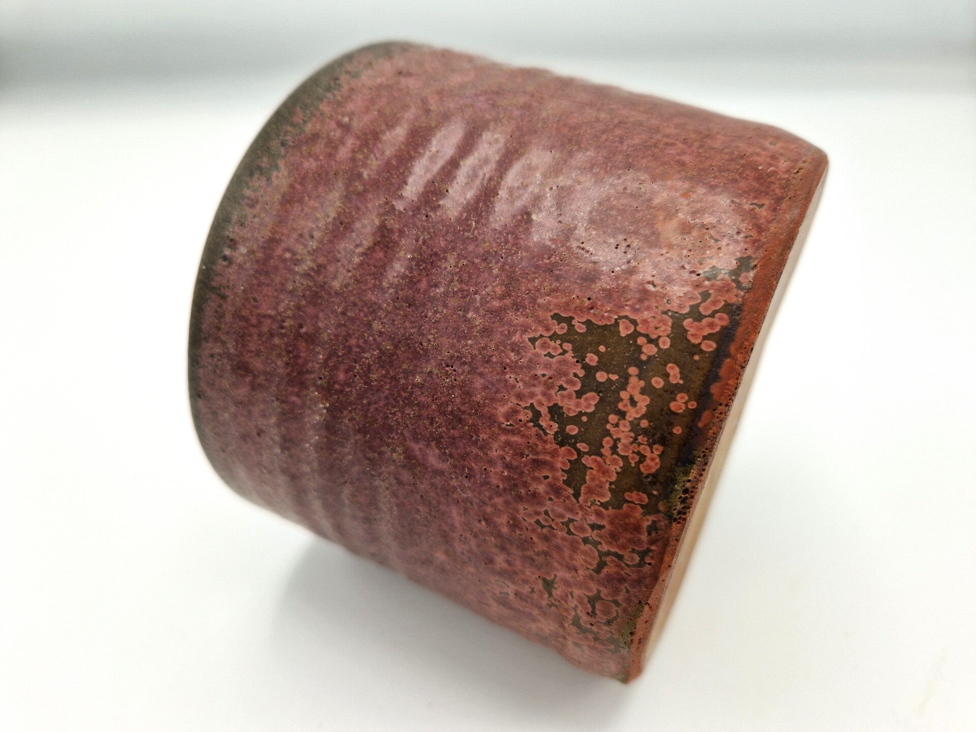 Thick turned ceramic pot in the style of Mobach Keramiek. Although little in size, it is bold enough to be the coolest planter in the room with red, purple and pink tones. Fully signed and marked. Great condition.