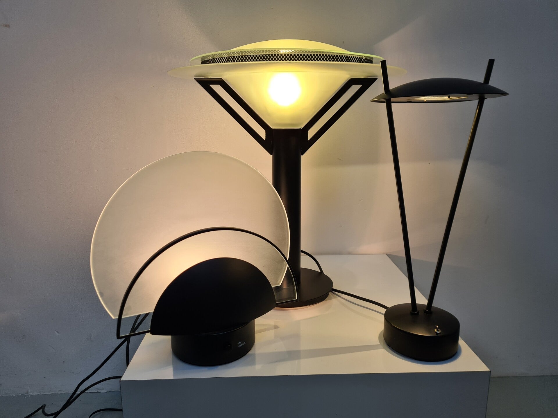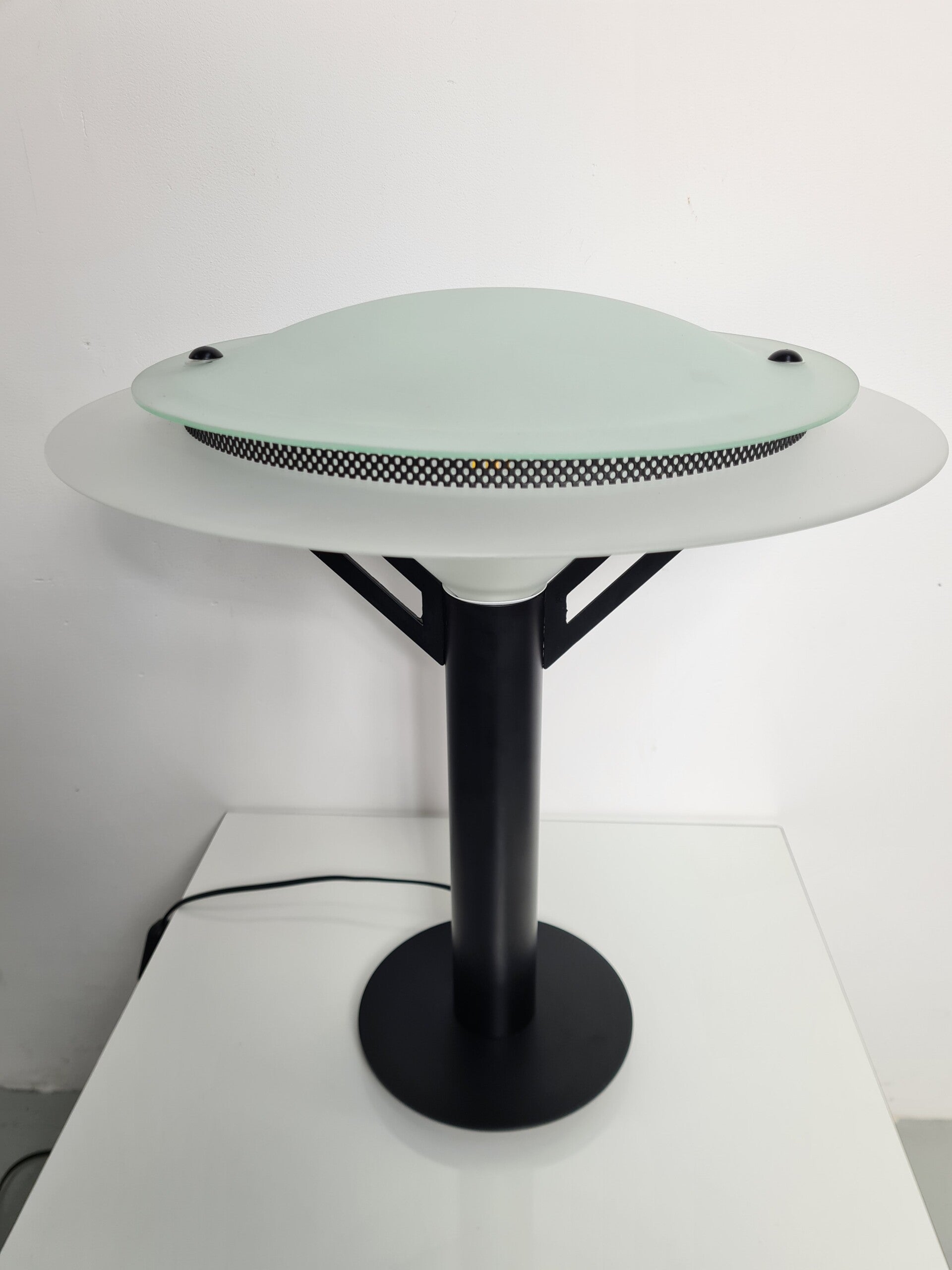 Enormous postmodern table or desk light made by AF Cinquanta in Italy. The design of the lamp is build on a modern version art deco style metal frame and topped with frosted glass shades to minimize direct light from the lamp, giving it a nice warm and soft touch. It is not only very big but also pretty heavy! Great condition.