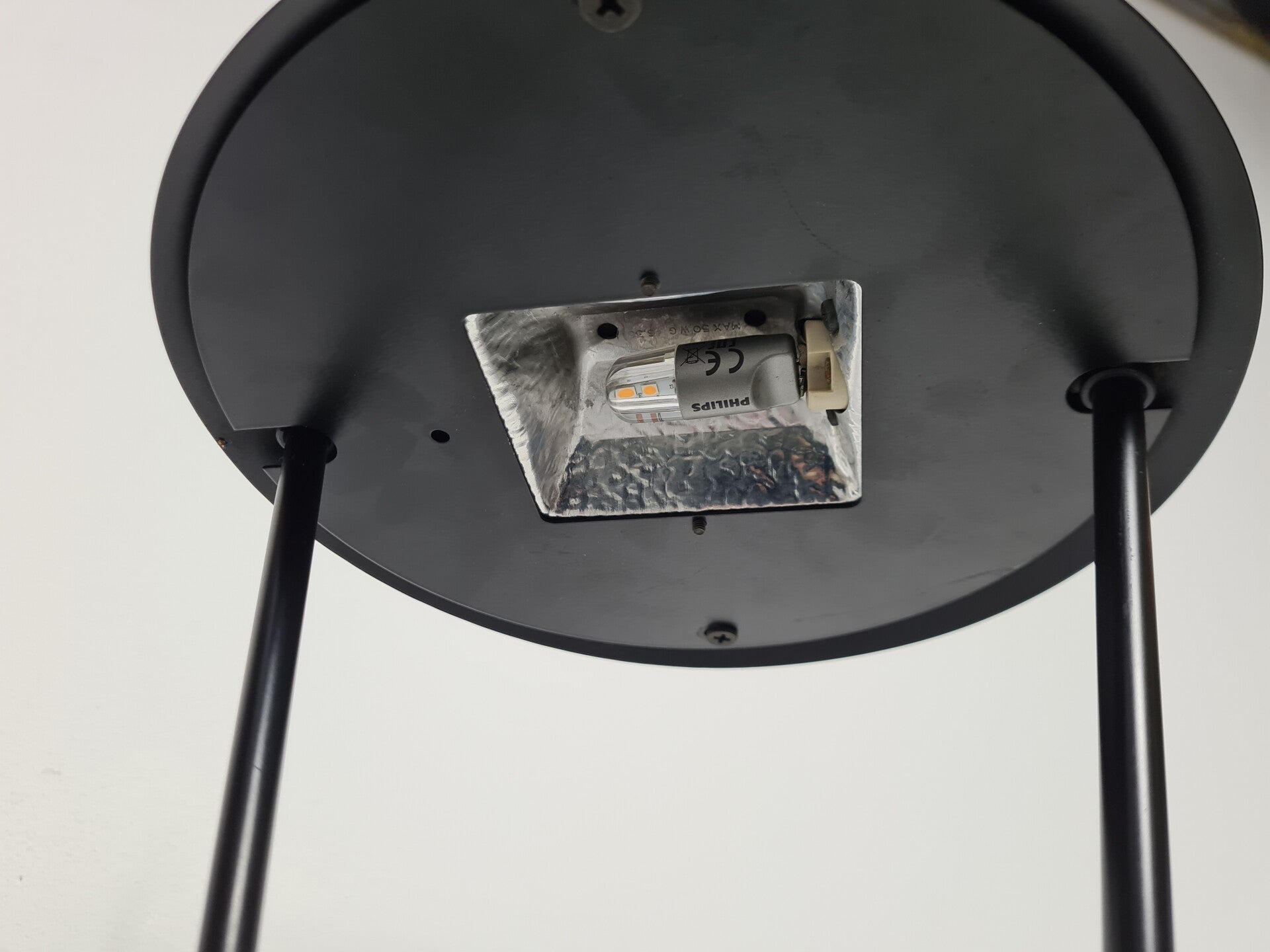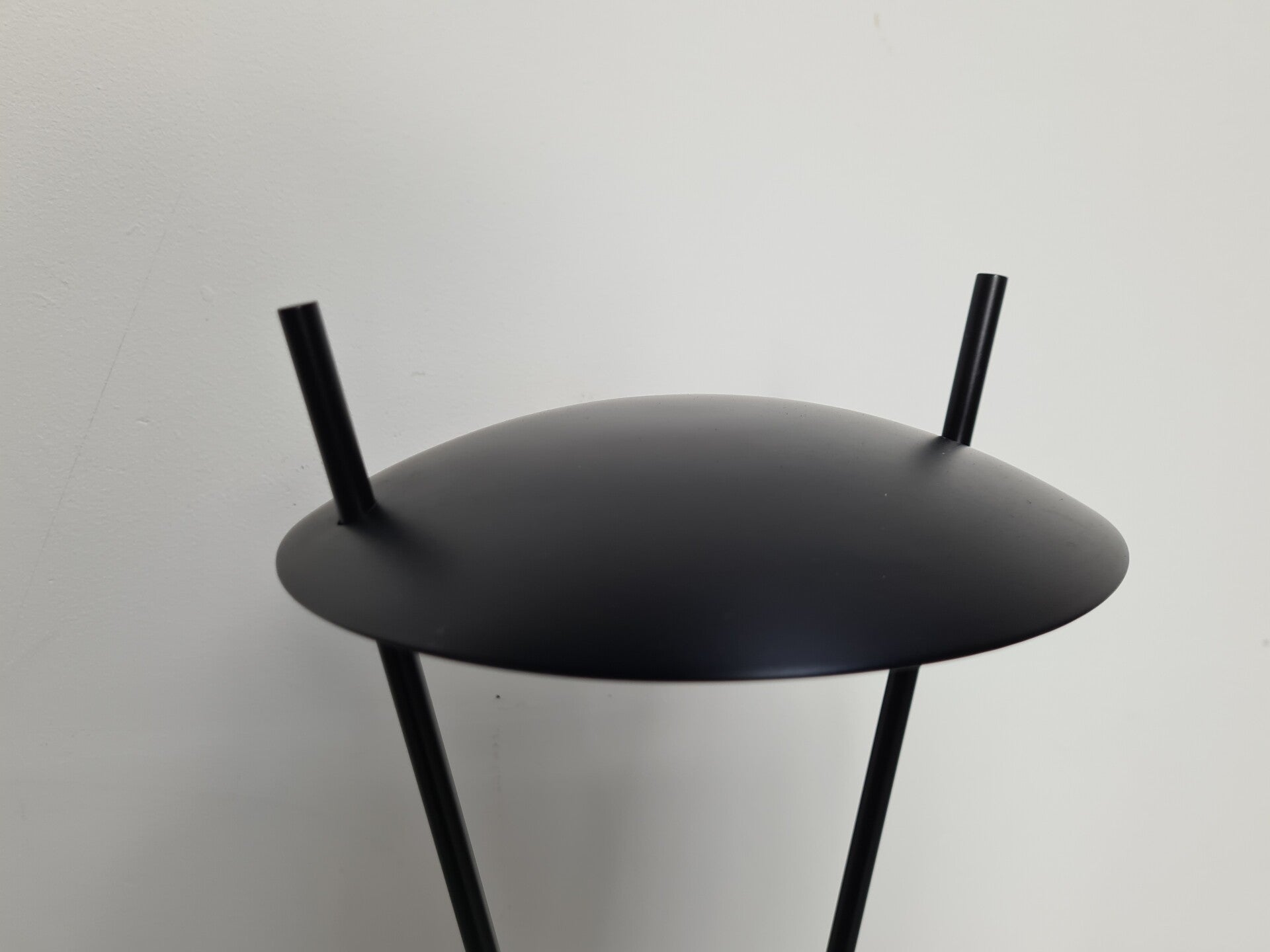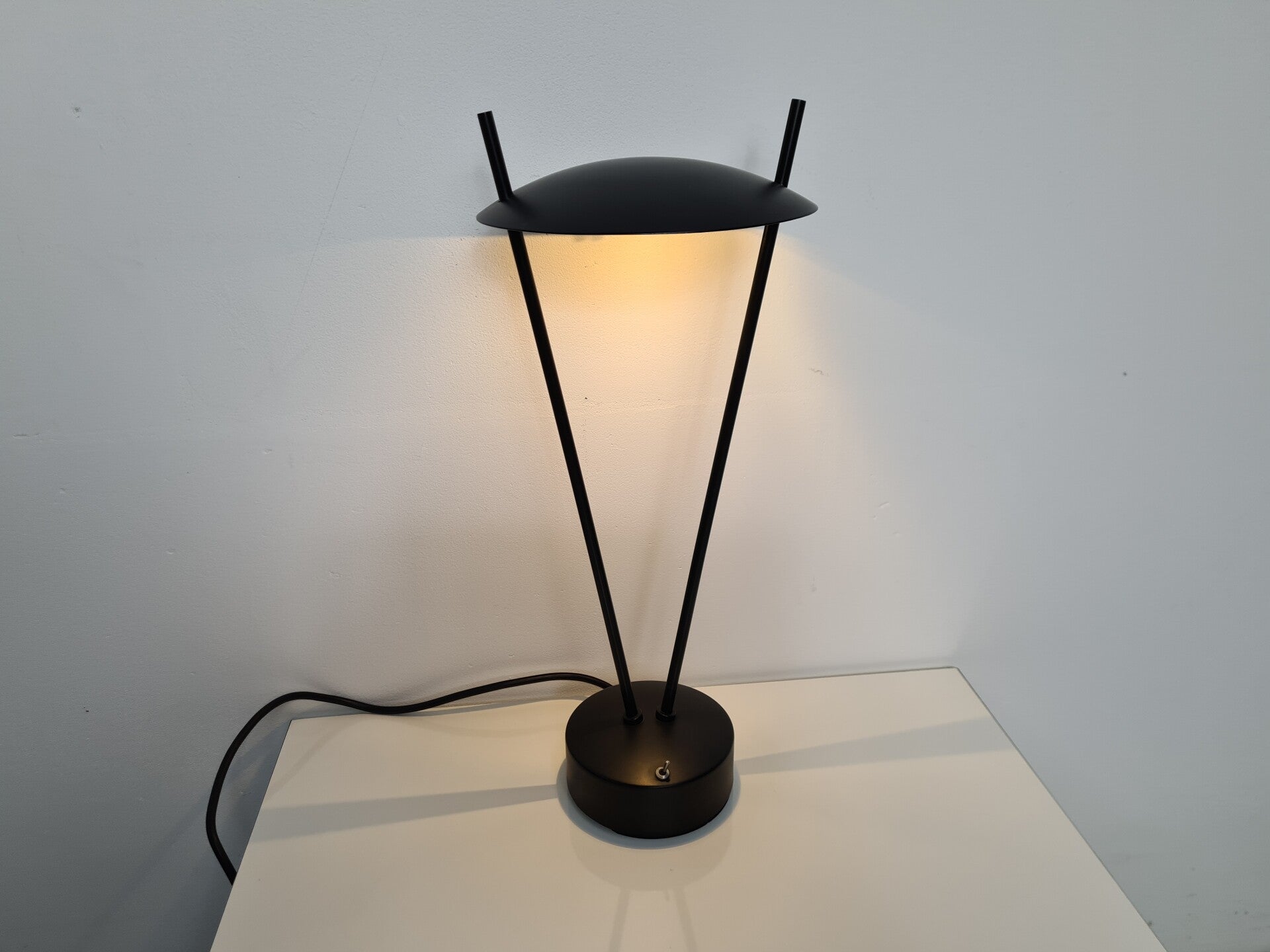 Great piece by Estiluz from Barcelona. This Postmodern black table lamp was made around 1990 and was fiited for halogen but can also take LED like it has now. Great overall condition with only one minor spot on the round metal shade. Barely visible.