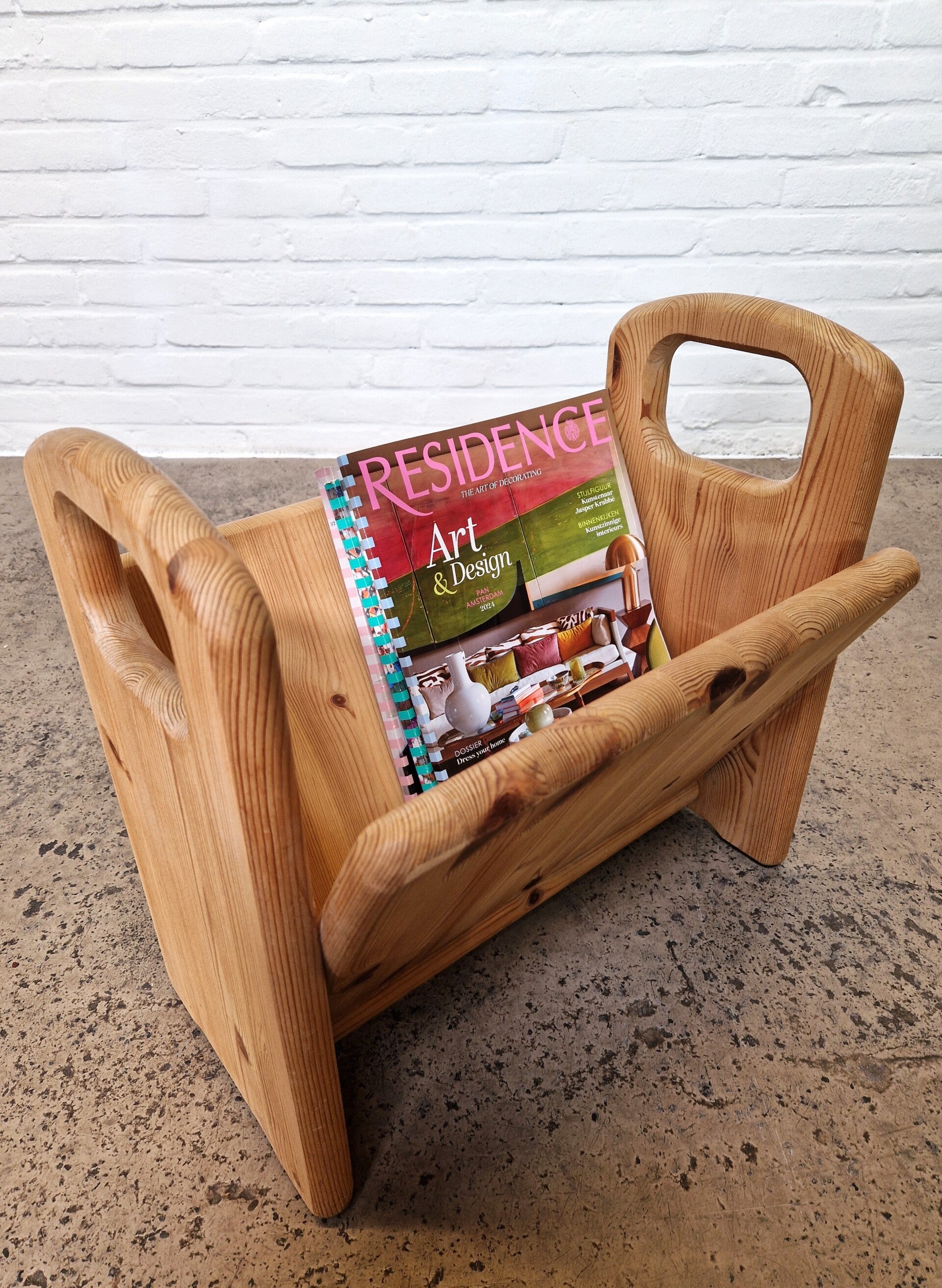 Great pine magazine rack or vinyl record holder from Denmark, made in the 1970s. Very fammiliar to furniture designed by Rainer Daumiller. Great condition.