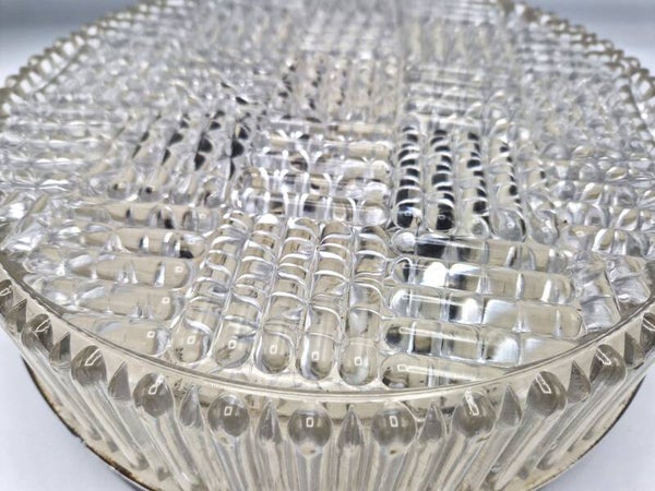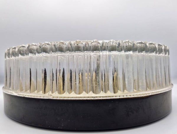 Classy 60's ceiling lamp, with a nice black metal base and a prism shaped glass shade that screws on. Could be mounted to a wall too of course. Takes two standard E27 bulbs (not included). Good vintage condition, some minor superficial spots on the metal parts. Pretty solid and heavy!