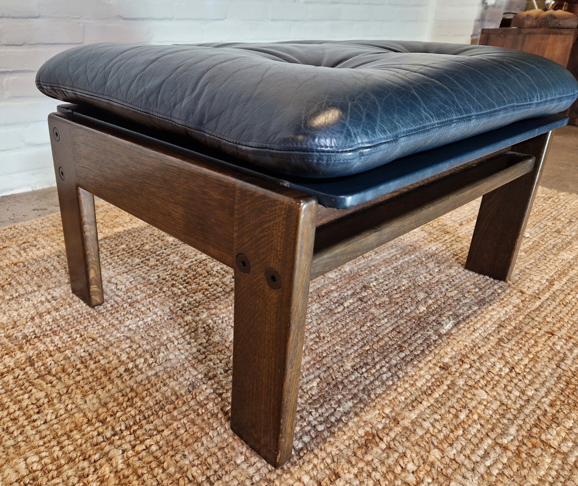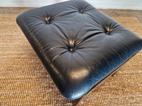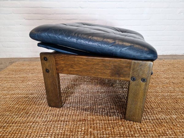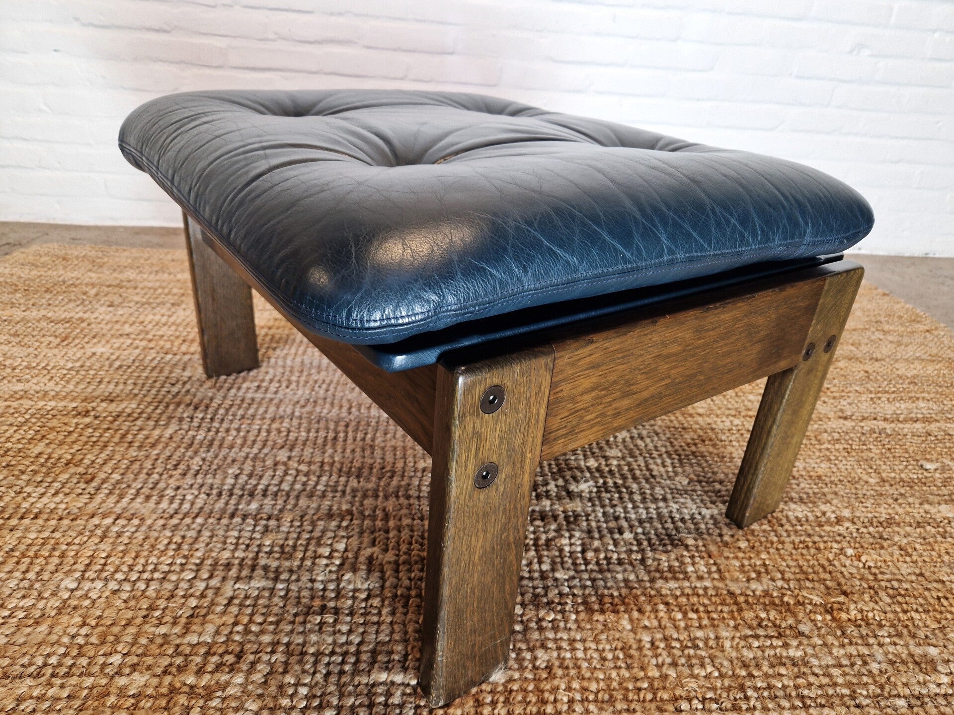 Beautiful design footstool from the 1970s. The cushion is made of green (almost petrol) leather and the bench is adjustable in two positions. Straight and slightly slanted. Very nice condition for its age.
