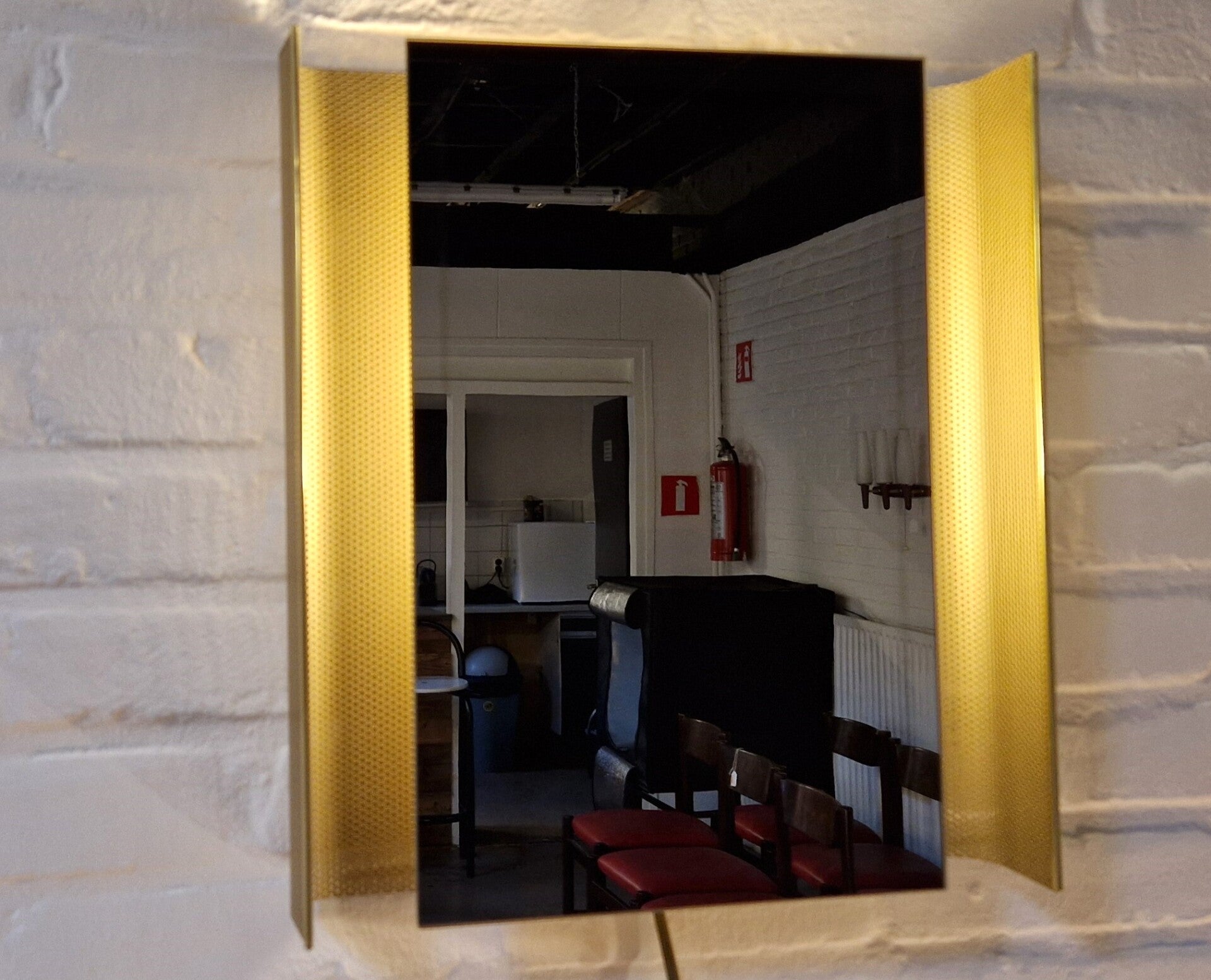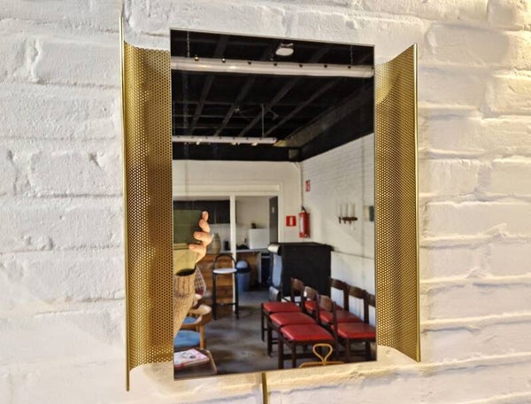 Beautiful wall mirror from Artimeta. The mirror floats in a frame of gold-colored perforated steel and has a lamp that illuminates the mirror at the back. Very cool midcentury design!