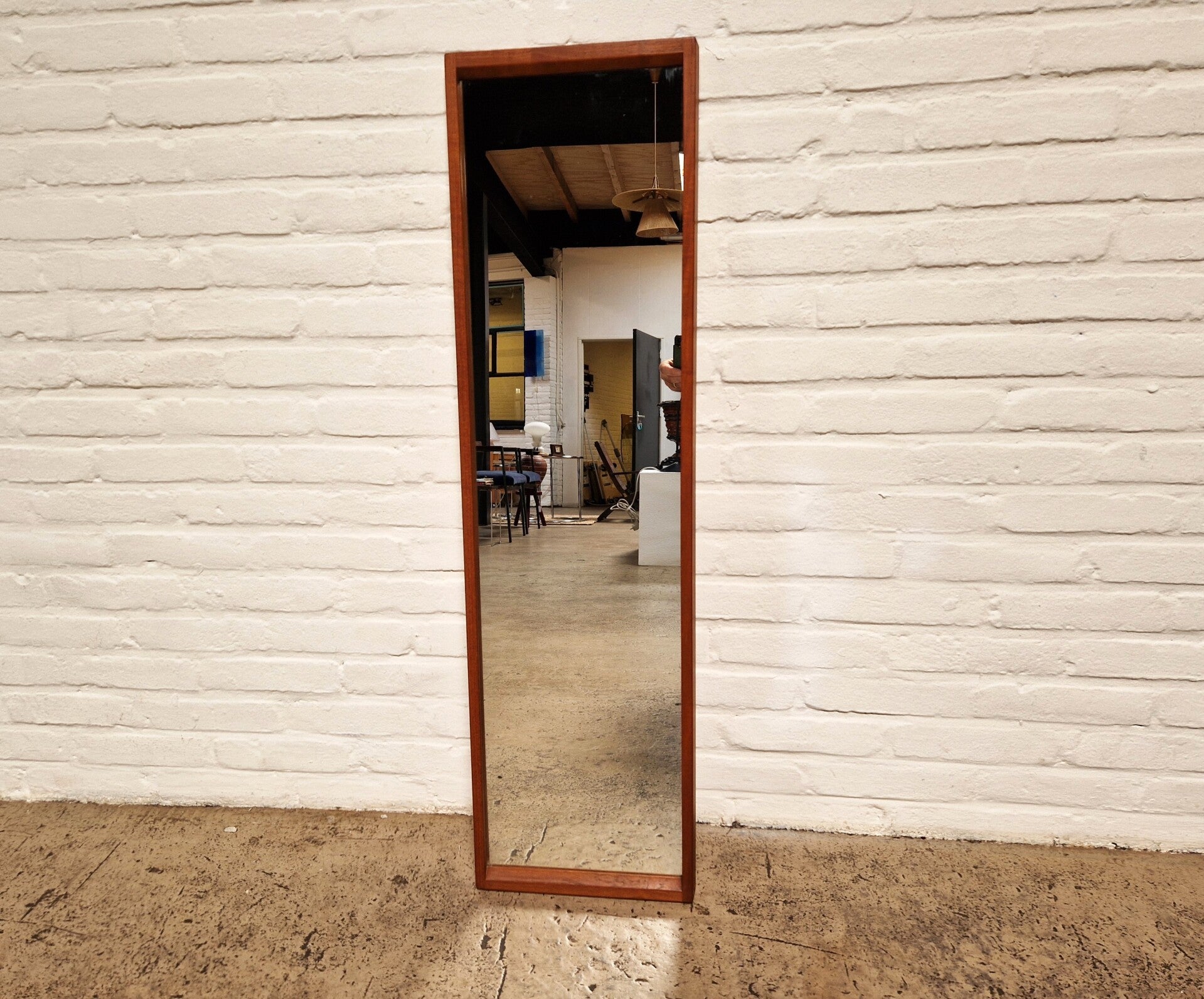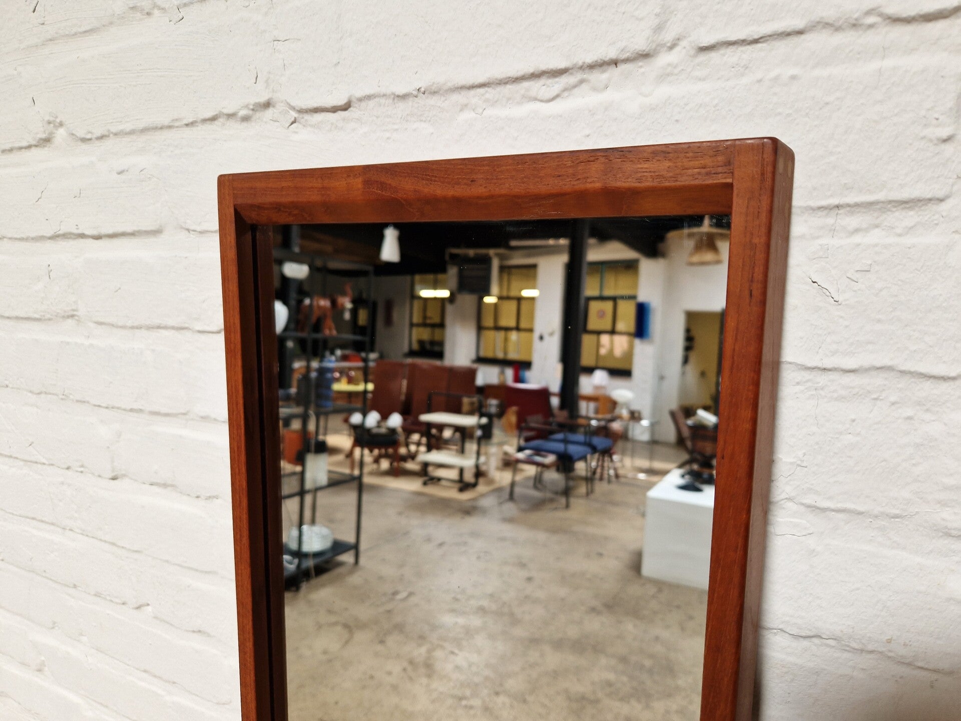 Beautiful mirror in teak with visible wooden pins on the connecting corners and in a beautiful slender size, which gives this vintage mirror a lot of class. Designed by Aksel Kjersgaard for Odder, Denmark in the 1960s.