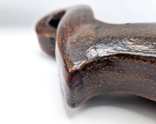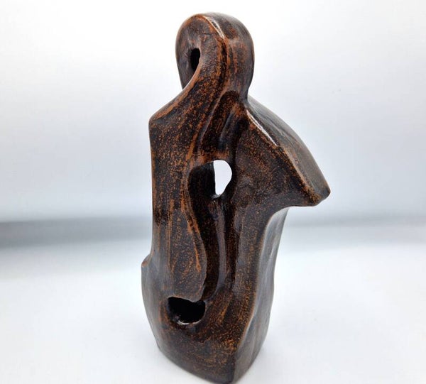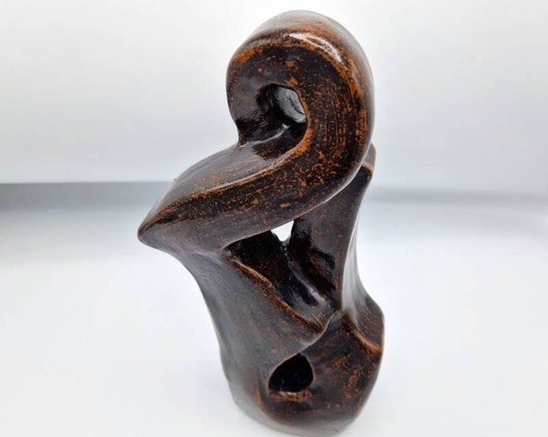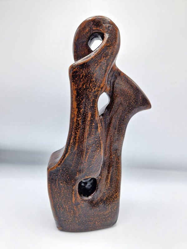 Cool abstract modernist sculpture made out of clay and with a faux bronze patina. Pretty heavy piece, made by an artist called THOM (signed) and would look great on any sideboard, shelf or table. Has one minor repair/production flaw that is hardly visible when standing. (see last picture).