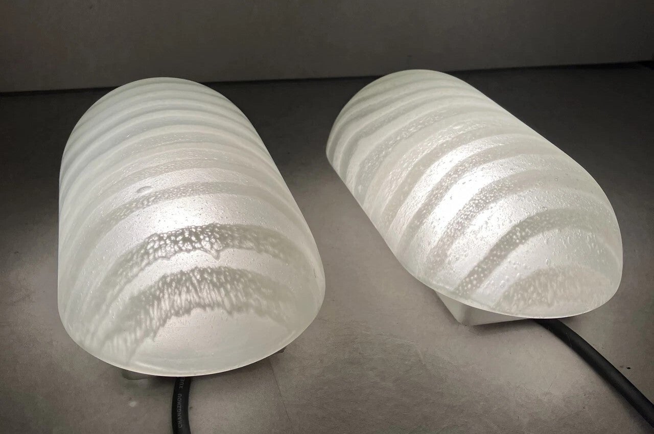 Beautiful set of 2 ceiling lamps by Peill & Putzler, made in Germany, 1970s. The clear and white glass gives a very smooth warm light and looks like a bit like a glowing zebra. Great condition. Takes a standard E14 bulb each (not included). (pictures with lights on are of simmilar lamps)