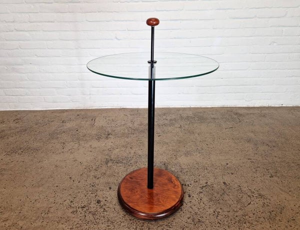 Classy postmodern side table in glass, metal and wood. It was probably made around 1990 and fits almost any modern interior. Great vintage condition.